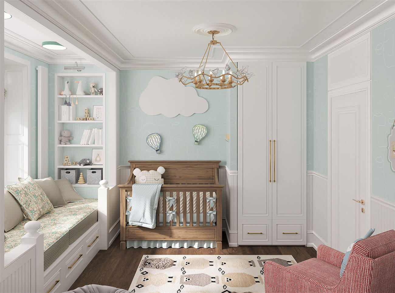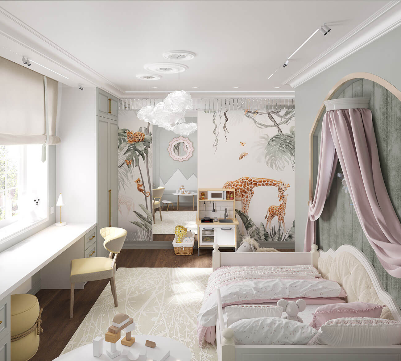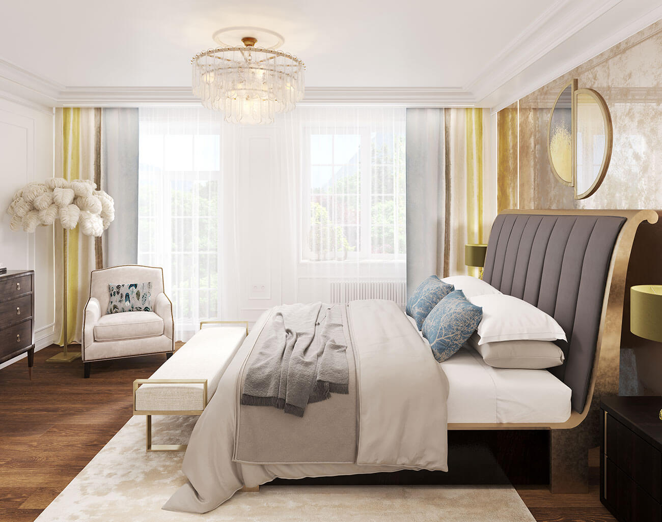 Планировочная особенность второго этажа — деление на две зоны: для родителей и для детей, которые объединяет большой и светлый коридор. В зоне родителей — спальня 20 кв.м. Изголовье кровати оформлено полотнами зеркал с эффектом старения. Акцентными красками интерьера являются свежая гамма желто-зеленого оттенка, в дополнение к небесно-голубым и основному молочному цвету стен и текстиля. Комната имеет выходы в гардеробную и ванную.