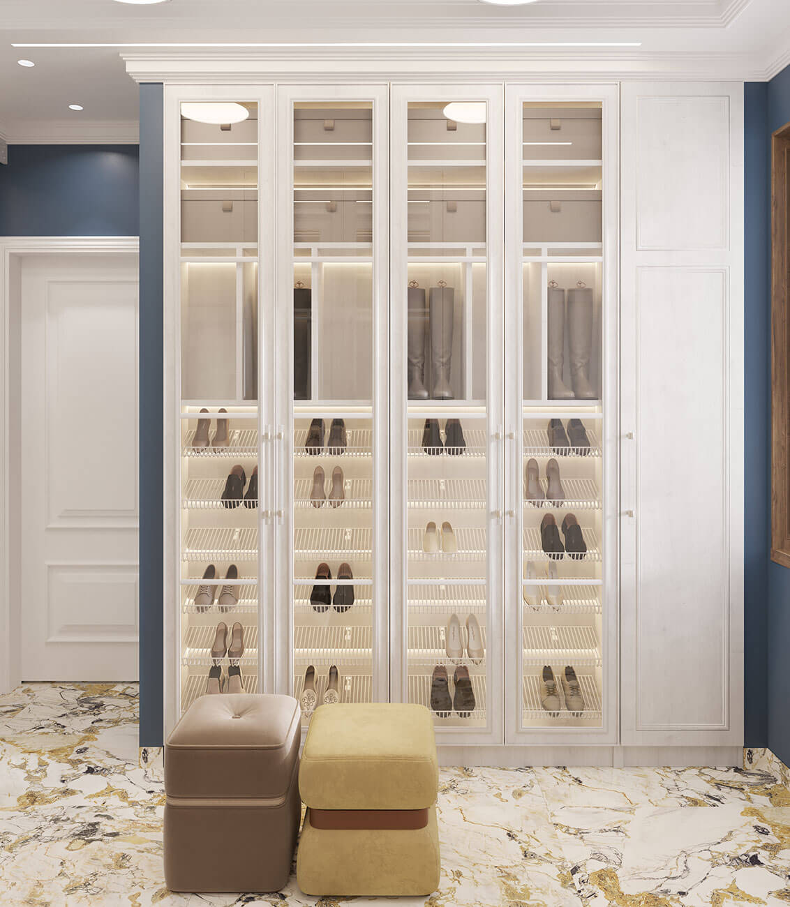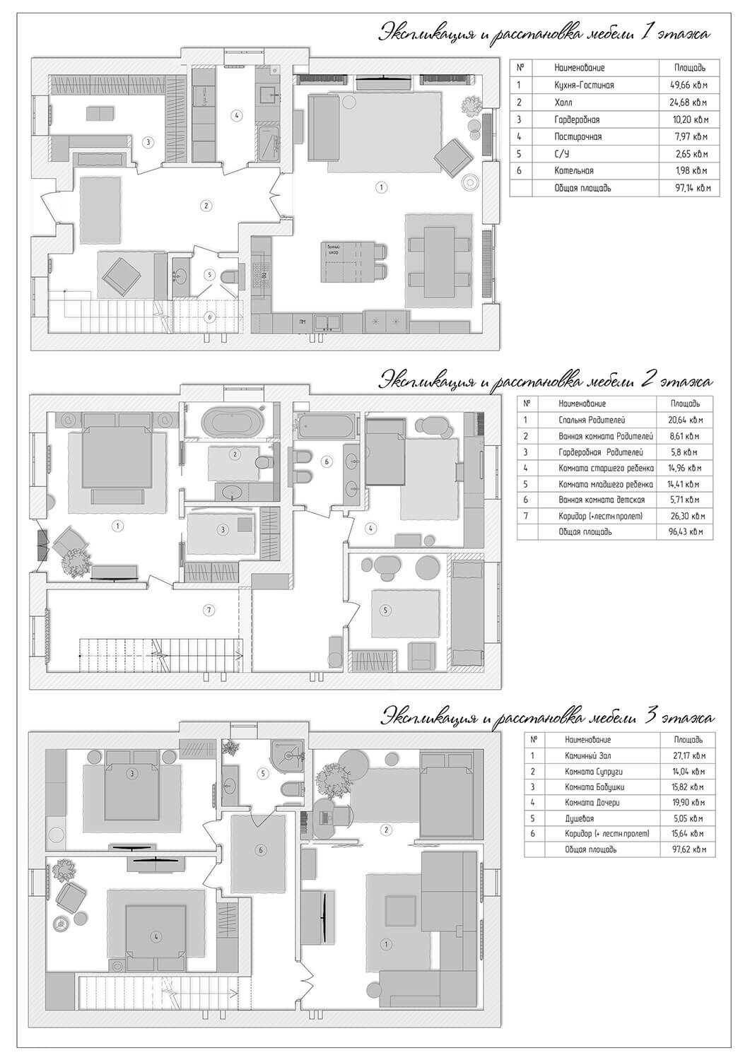 На первом этаже расположены просторный холл с лестницей на второй этаж, помещение санузла и котельной, оборудованной под лестничным маршем, гардеробная для хранения одежды и обуви всей семьи, прачечная.