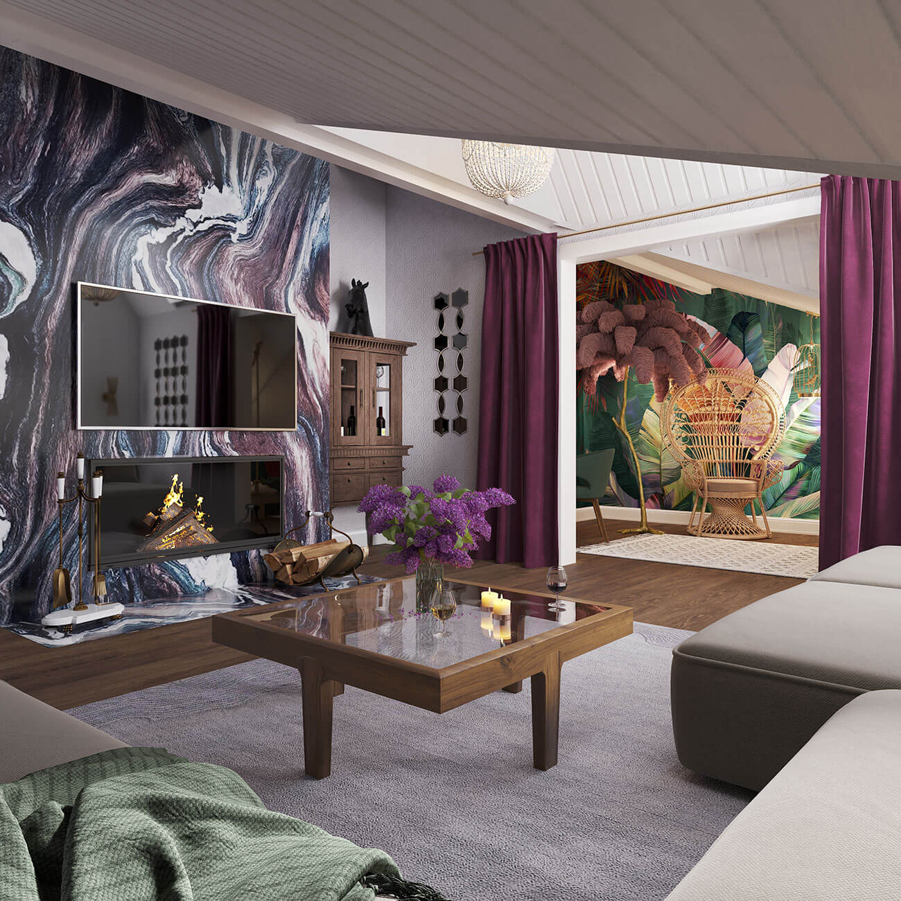 Основой оформления 3-го этажа стало дерево: лиственница, дуб и сосна. Акцентами являются тропические детали и принты. Фокусная точка помещения — камин, облицованный редким видом мрамора Cipollino Ondulato. На первый взгляд кажется, что поверхность камня лиловая, ближе к коричневому цвету. Однако вследствие многочисленных вкраплений и прожилок можно сказать, что мрамор относится к категории многоцветных материалов.
