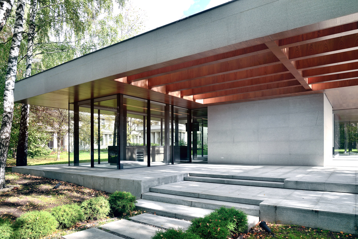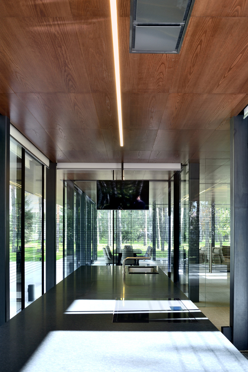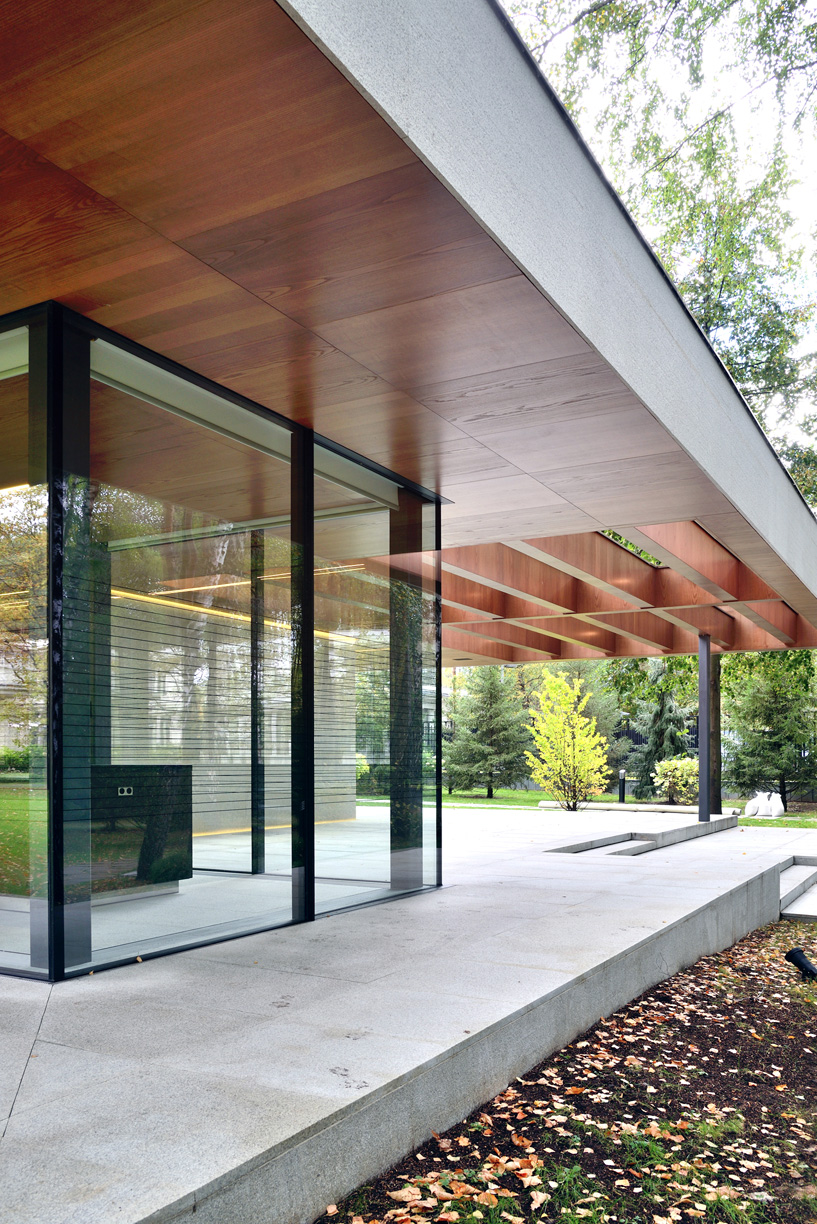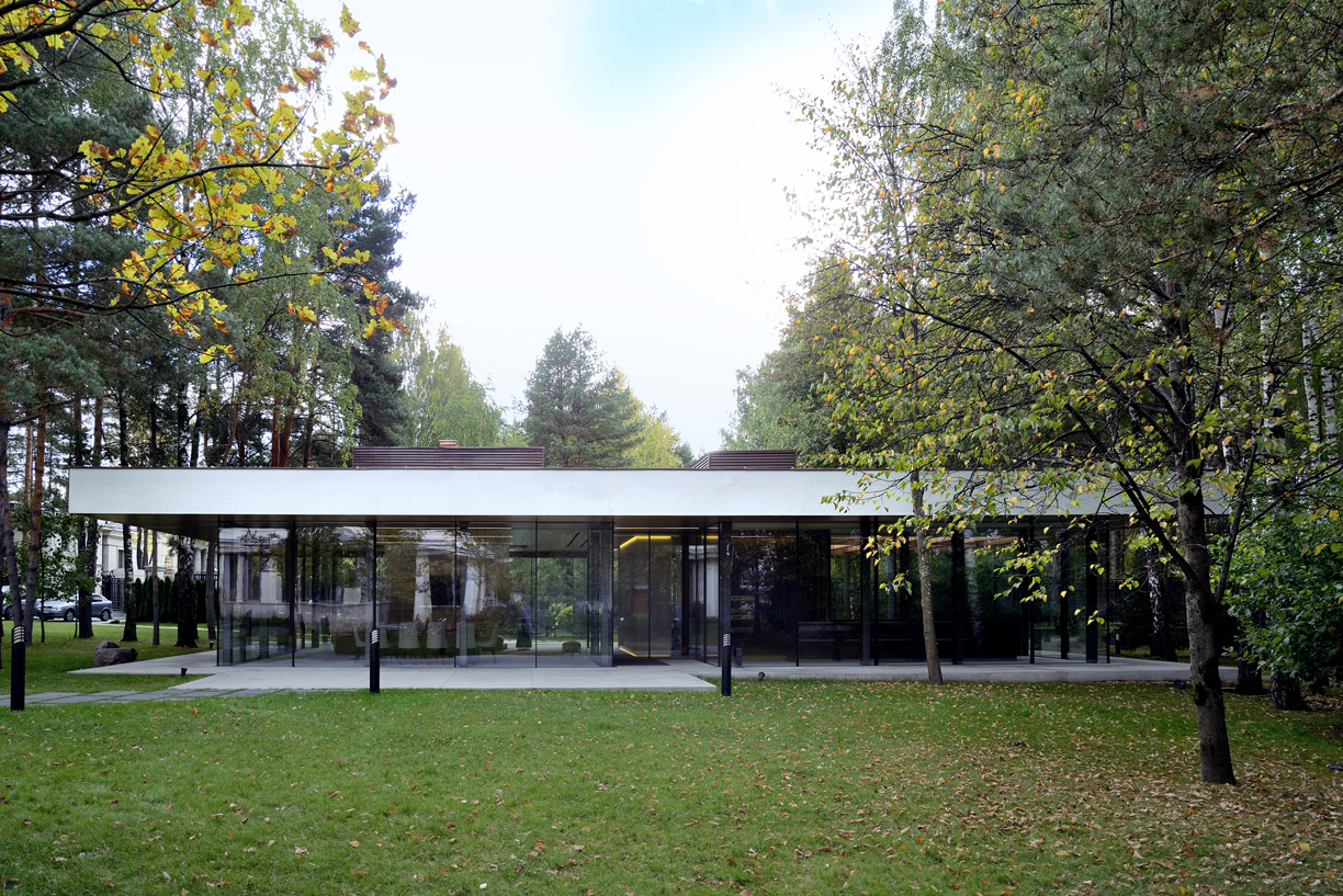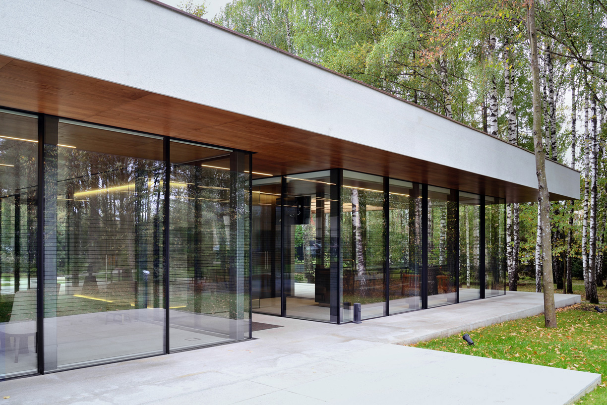 Павильон для приема гостей, монументальный и легкий одновременно, — современное прочтение архитектуры 60-х годов XX века. Линейные планировки, натуральные материалы, много остекления — все возвращает нас в историю, но технологии для воплощения идеи выбраны современные.