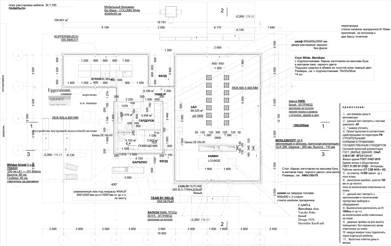 Павильон включает банкетный зал на 20 человек, лаунж и каминная зону, два гостевых санузла и гардеробную, открытую площадку барбекю и отдельный зал с кухонным островом. Кухня Bulthaup из камня, как музейный экспонат, окружена стеклом. Бытовая техника Gaggenau. Мебель Maxalto. Сантехника ТОТО, модель NEOREST; раковина, мебель в ванной MILDUE. Автоматизированное управление процессами в здании по протоколу KNХ.