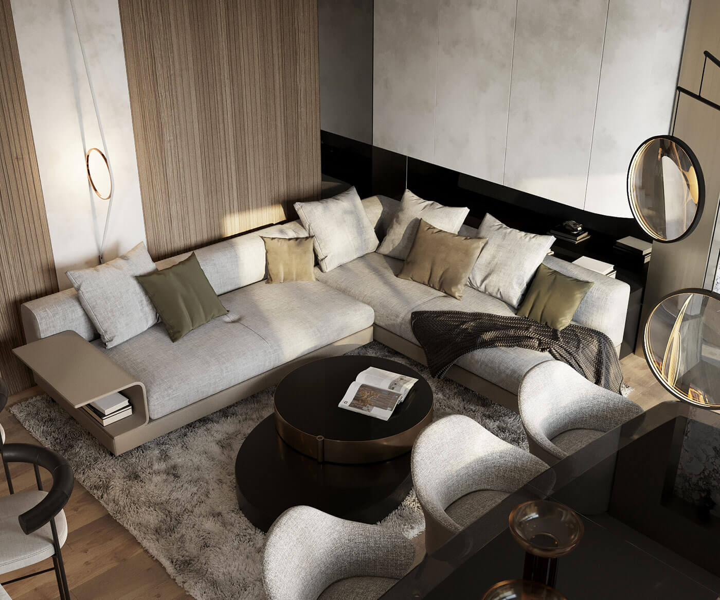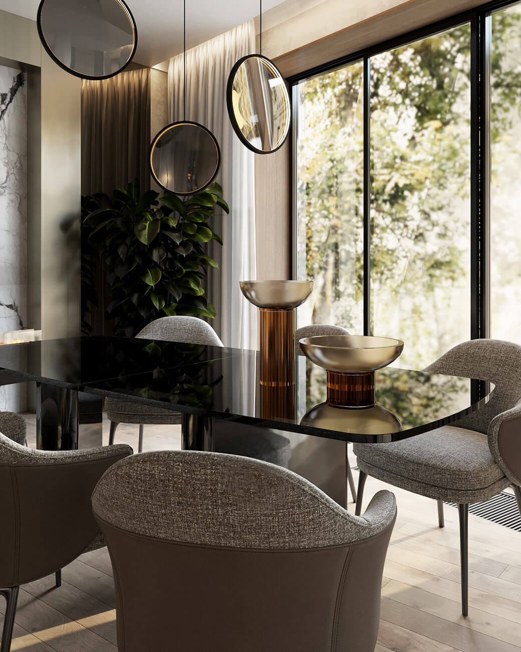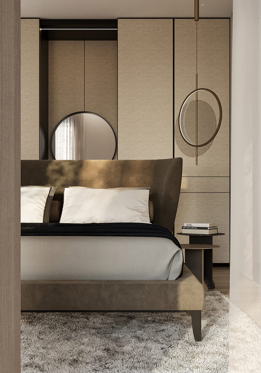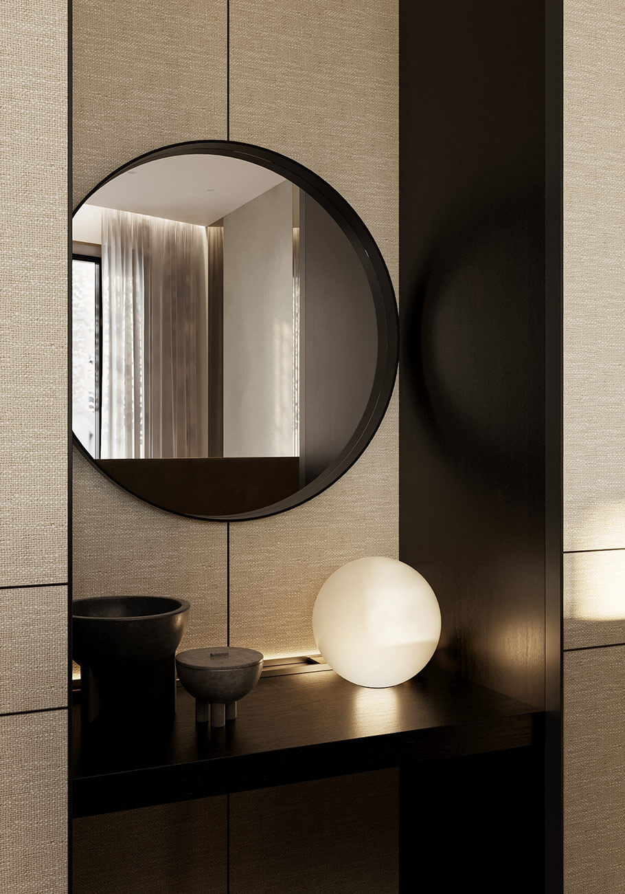 Настоящая изысканность заложена даже в функциональных аспектах. Скрытая кухня, интегрированная в общее пространство, оставляет с ощущением атмосферы живописного гостиничном номера, где всё служит удовольствию. Деревянный оконный портал добавляет штрих элегантности, а стол с зеркальным основанием создает иллюзию бесконечности.