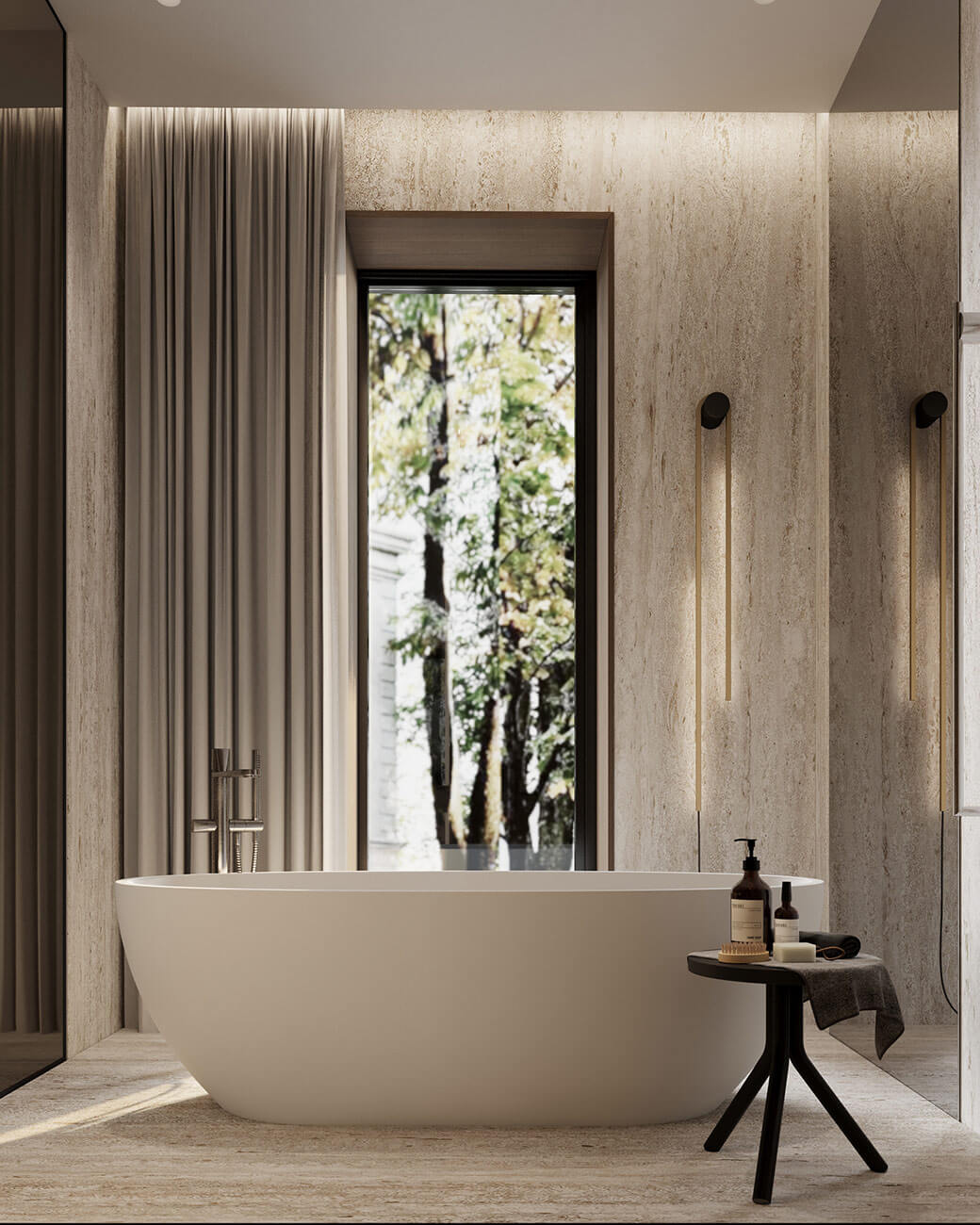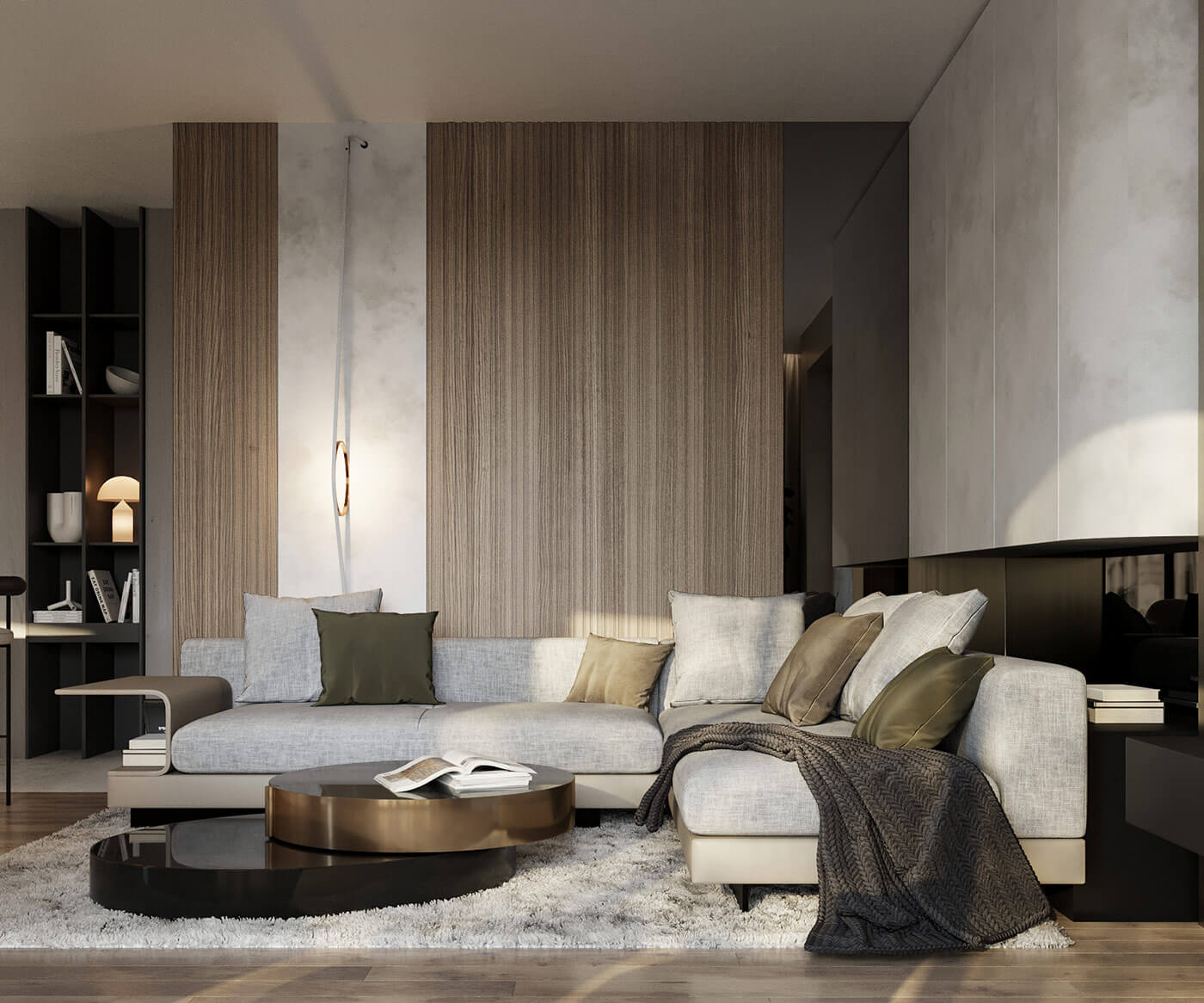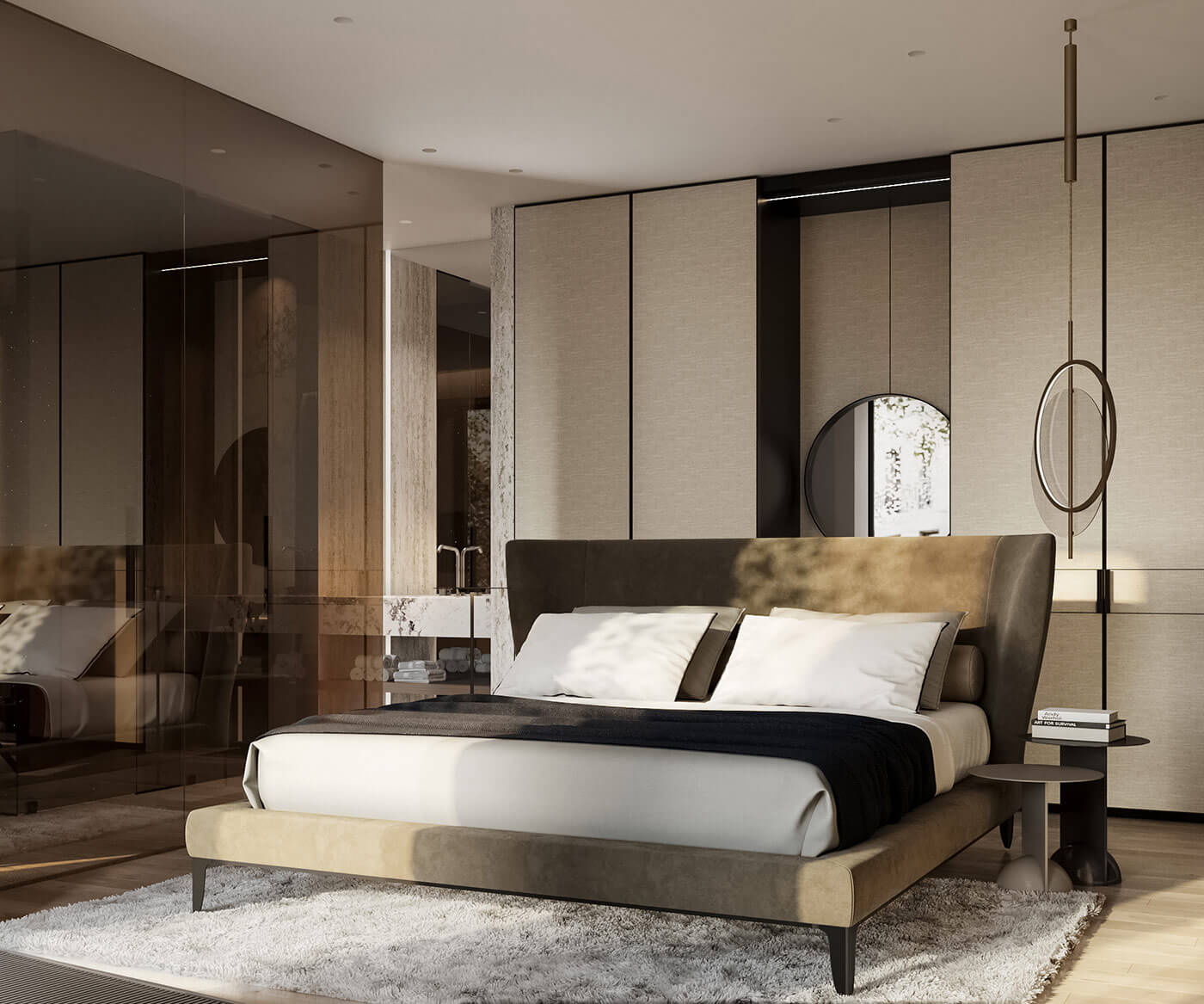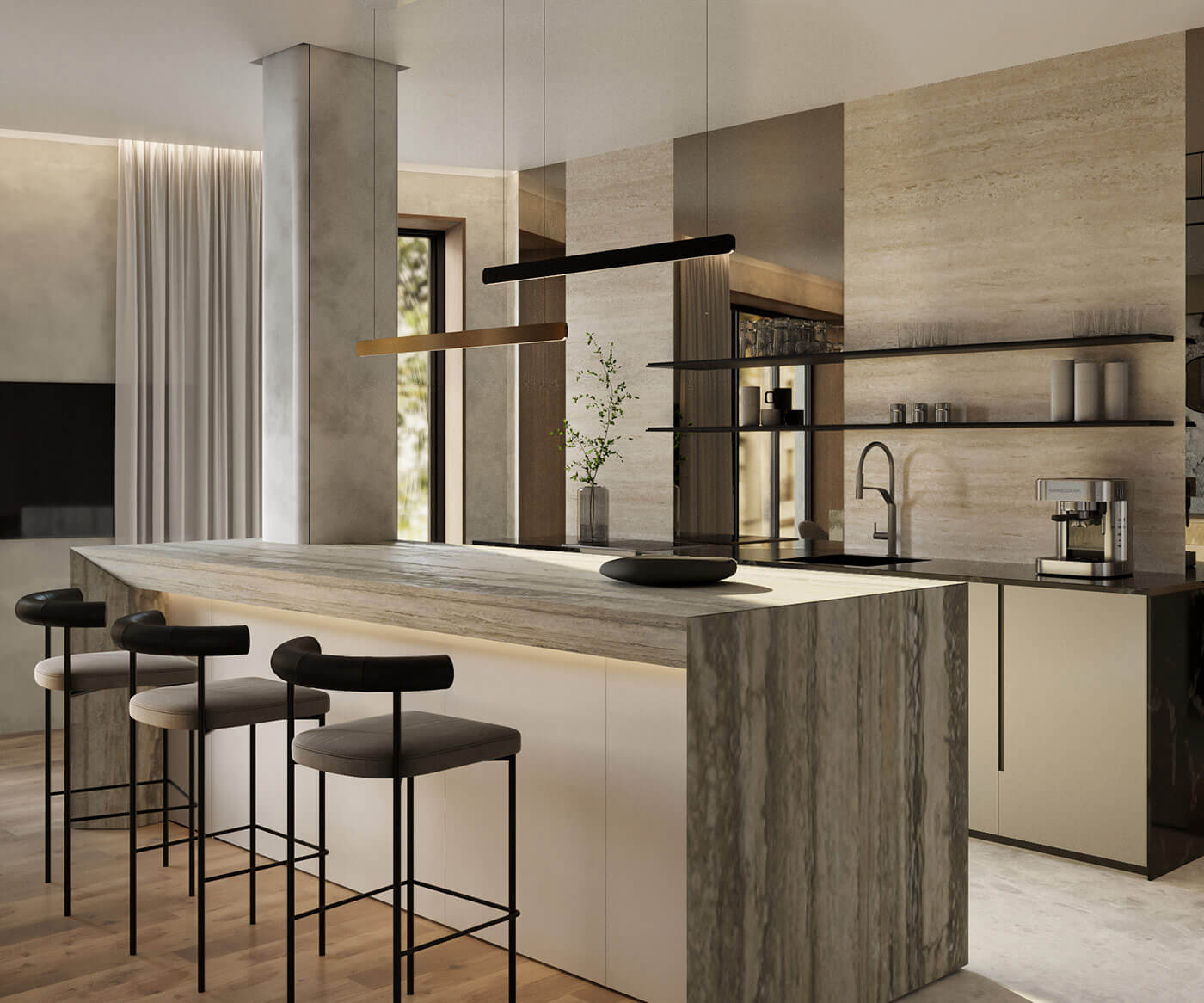 Здесь каждая деталь продумана до мельчайших нюансов, чтобы создать неповторимую атмосферу. Полутона натуральных камней окутывают своим теплом, а мрамор, величественно обрамленный металлической аркой, становится настоящим произведением искусства. Акцентный подвесной светильник добавляет игры света и тени, придавая интерьеру невероятную глубину. Все это подчеркнуто мягкими оттенками теплого дерева и притягательной текстурой алькантары.