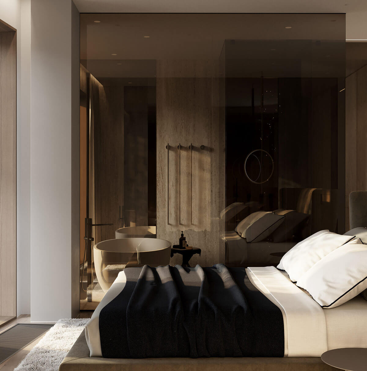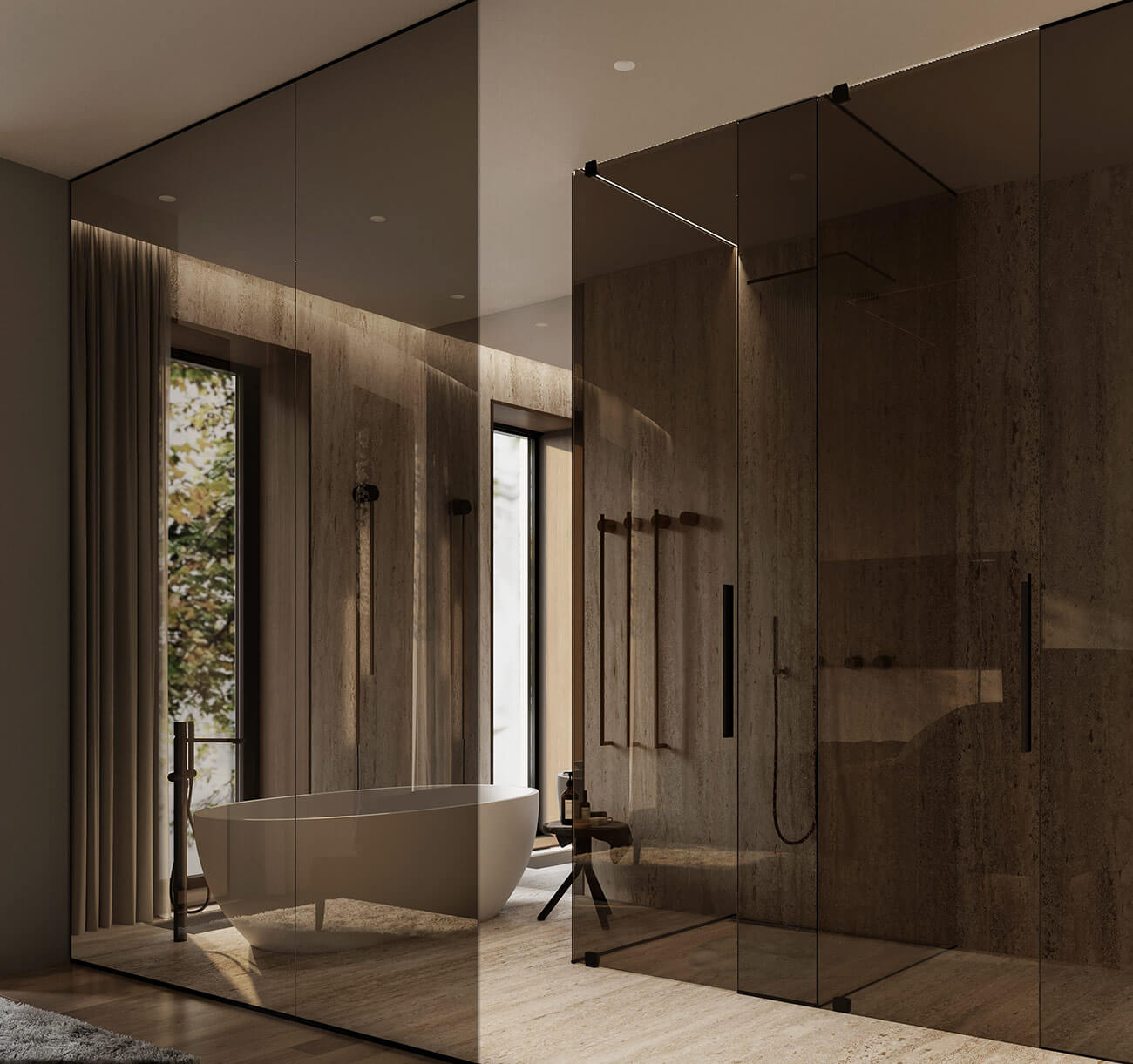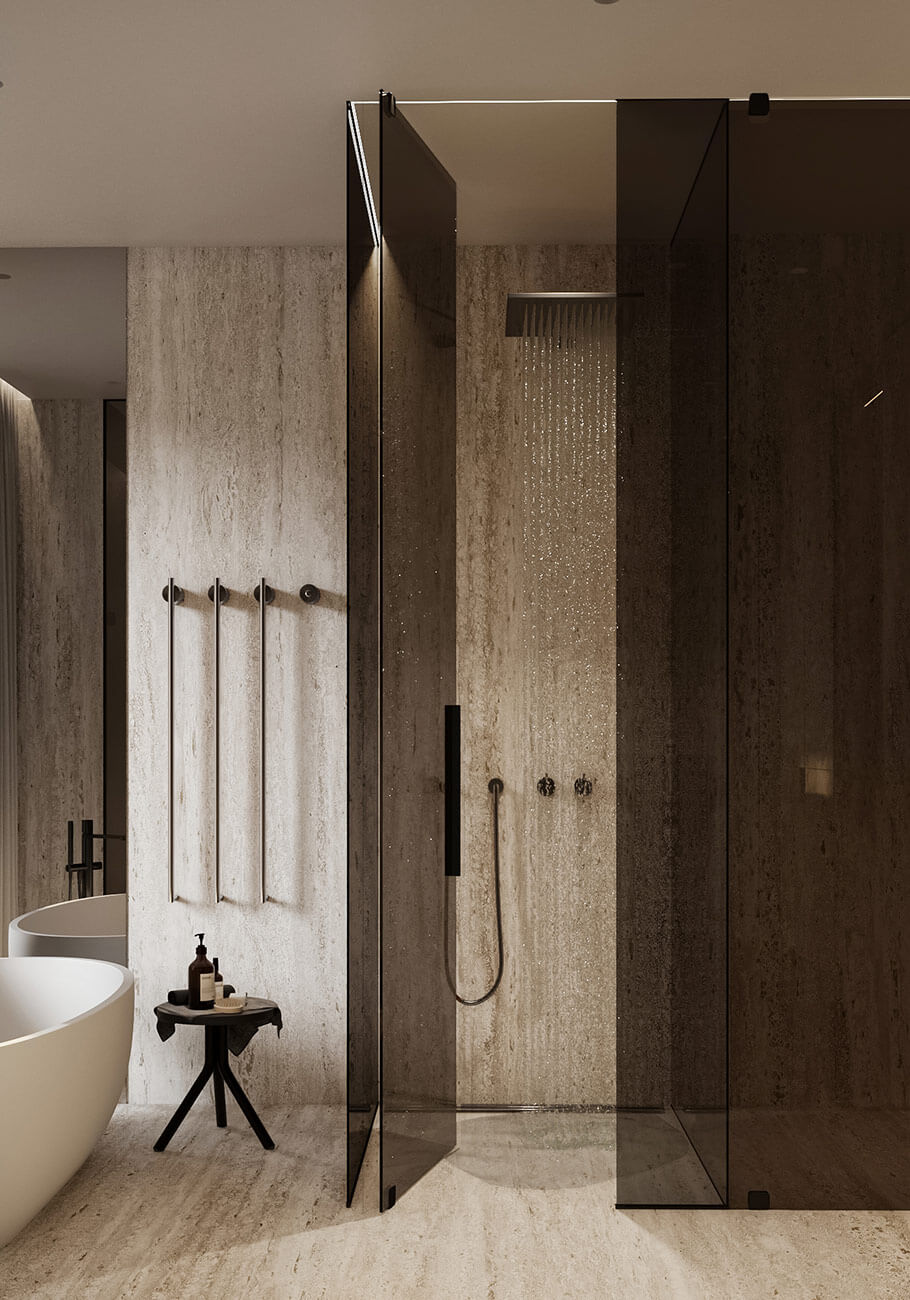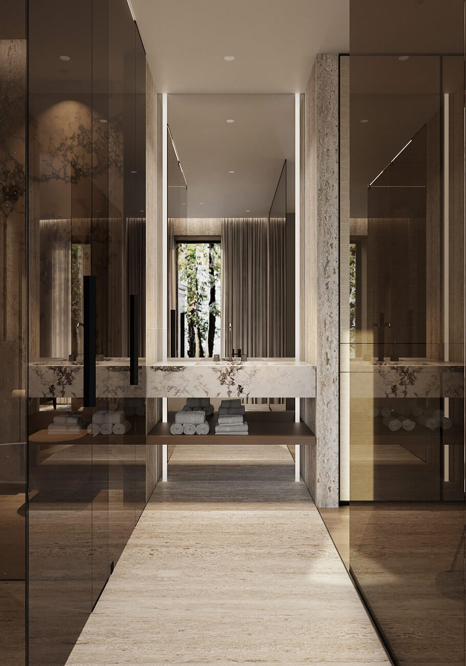 Мастер-санузел — это настоящий оазис расслабления. Бронзовые стеклянные перегородки позволяют естественному свету проникать внутрь, стирая границы между спальней и ванной. Это создает ощущение простора и гармонии. Современные технологии воплощаются в каждой детали, обеспечивая идеальную атмосферу.