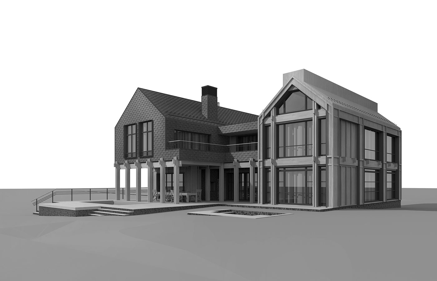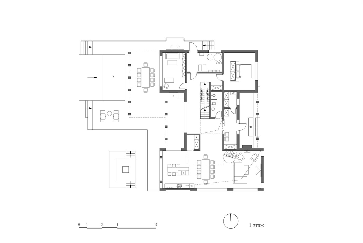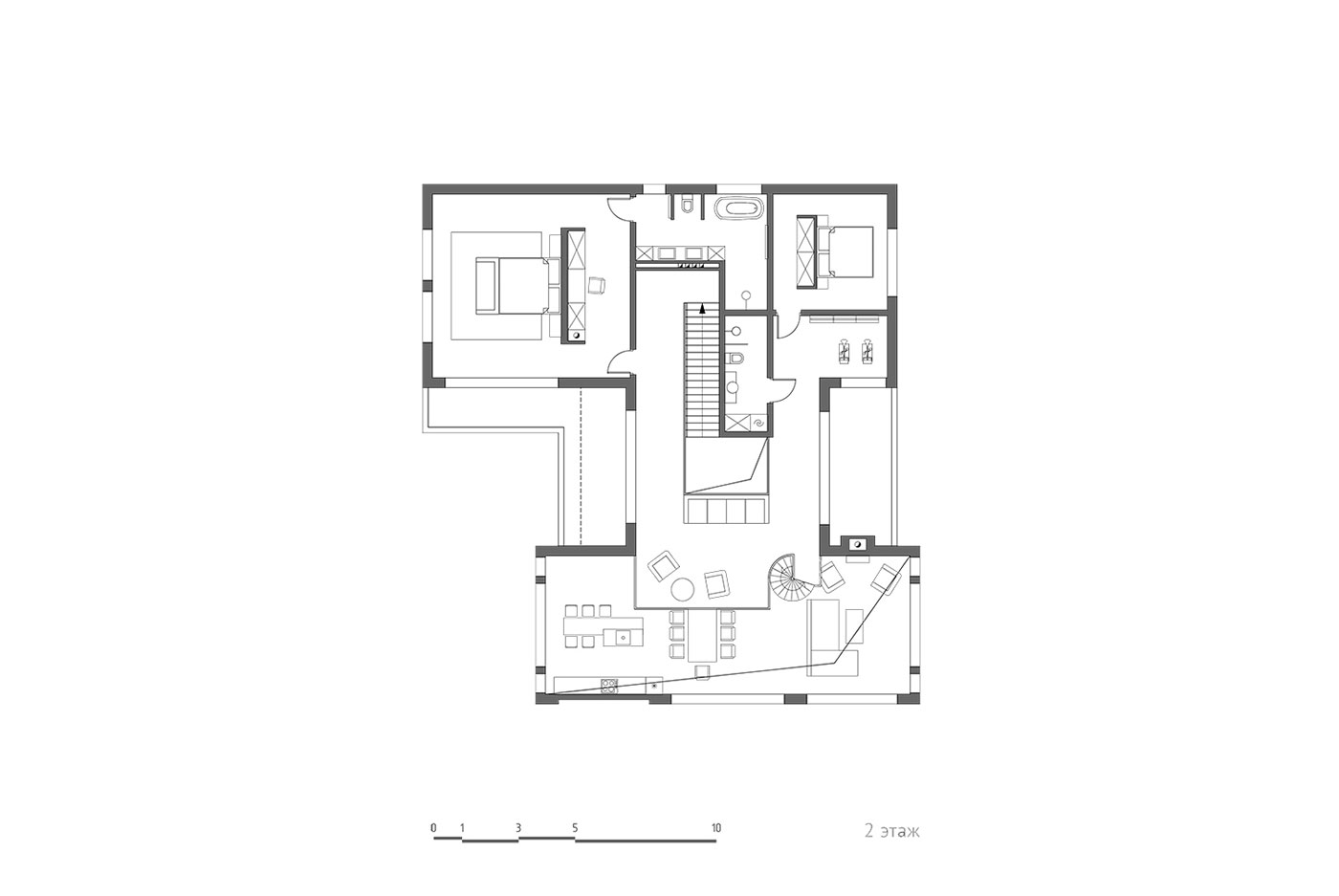 Функциональное зонирование дома подчеркивается двухчастностью общего объема здания. Первый этаж включает в себя большой просторный блок с общей комнатой, отдельной открытой парадной винтовой лестницей, двусветным пространством и открытым балконом второго этажа, с общей зоной дополнительной гостиной. С другой стороны располагается гостевая спальная комната, техническое помещение, санузлы, удобная одномаршевая лестница и мультифункциональное помещение-кабинет. На втором этаже находится хозяйская спальная комната с приватным санузлом, гардеробной, выходом на балкон. Еще на этаже располагается гостевая спальная комната с санузлом, зона для физкультуры. Выходы на открытые балконы идут из общей гостевой зоны, над которой располагается часть с плоской крышей и зенитным фонарем.