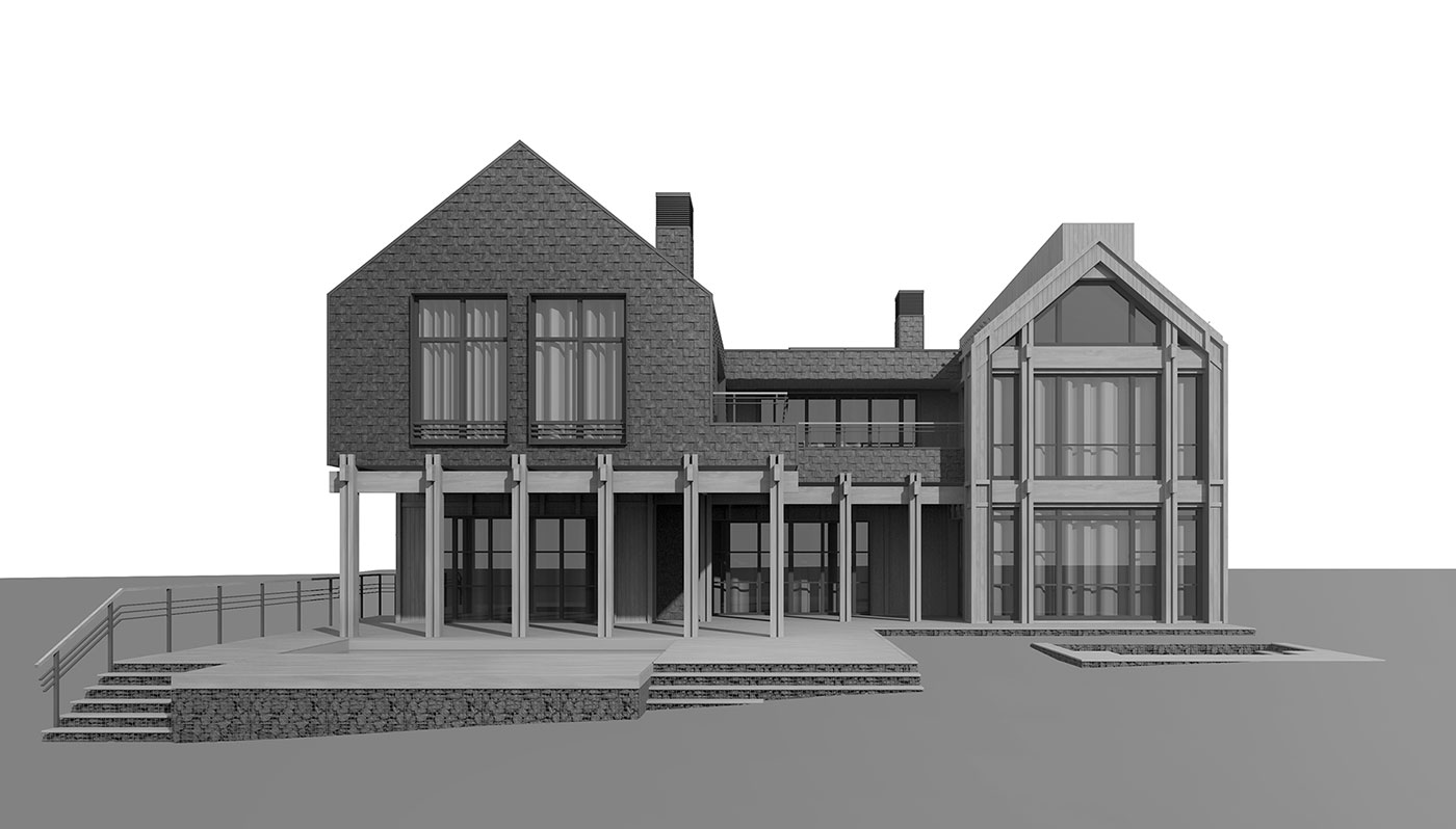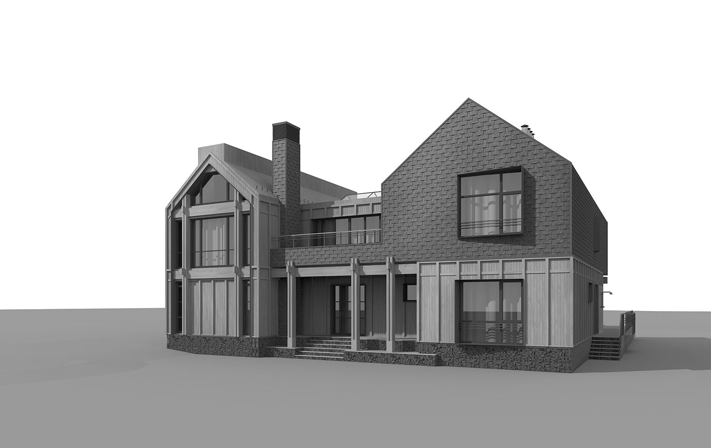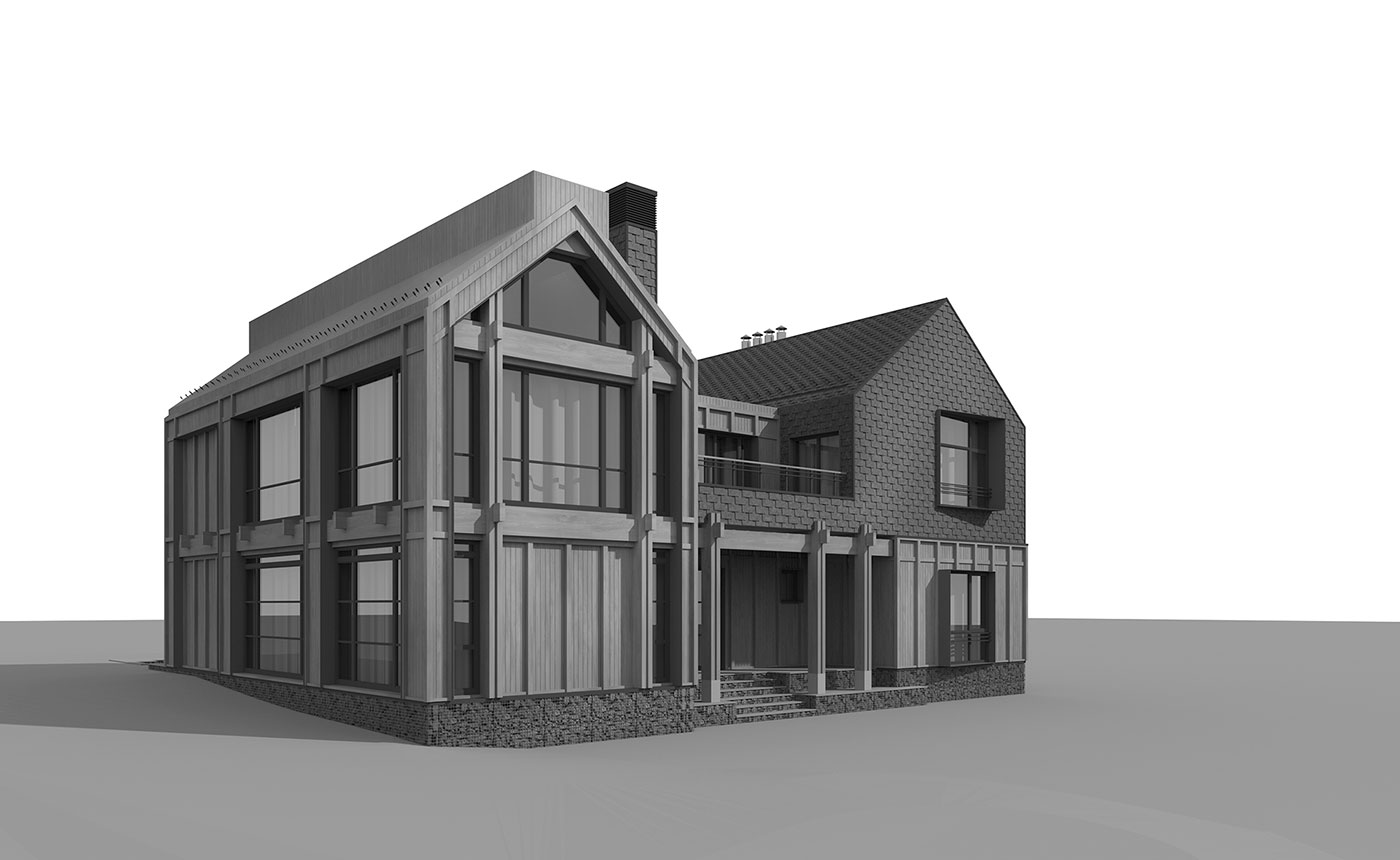 Силовой каркас дома выполняется по CLT-технологии, с дополнительным утеплением и финишной отделкой фасадов и крыши натуральной древесиной и натуральным сланцем. Системы сбора и отвода дождевых и талых вод скрыты, основное покрытие крыши над деревянным объемом — металлическая фальцевая кровля.
