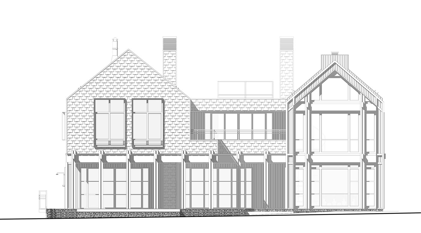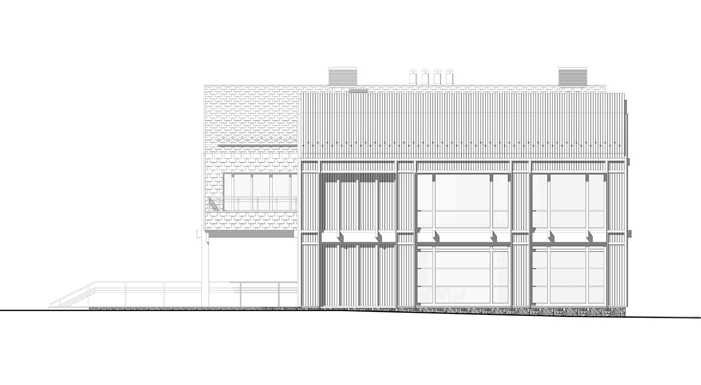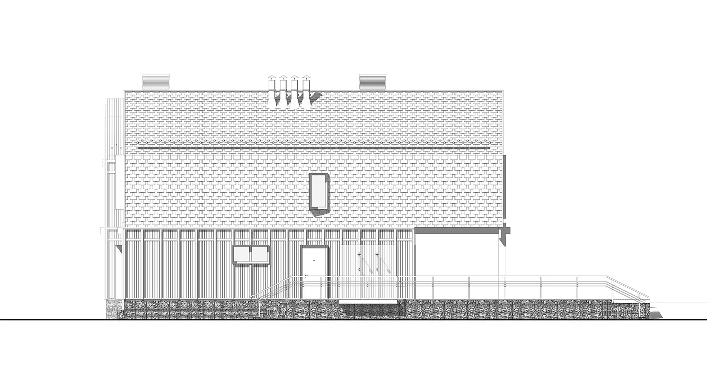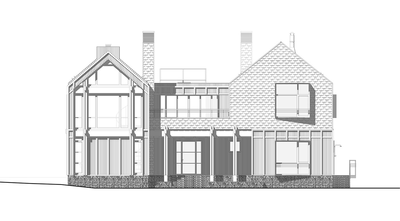 Силовой каркас дома выполняется по CLT-технологии, с дополнительным утеплением и финишной отделкой фасадов и крыши натуральной древесиной и натуральным сланцем. Системы сбора и отвода дождевых и талых вод скрыты, основное покрытие крыши над деревянным объемом — металлическая фальцевая кровля.