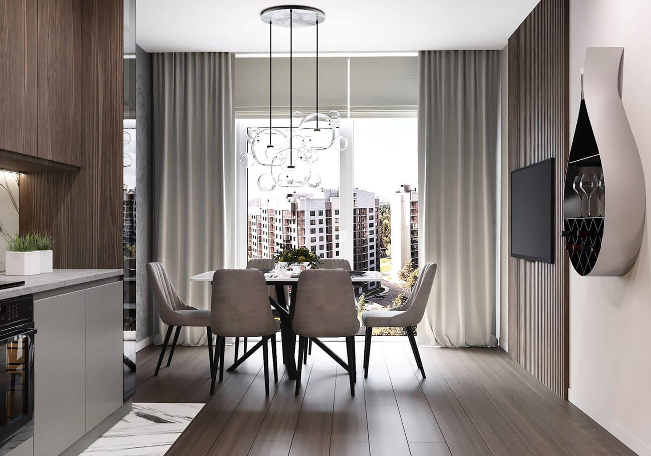 Лёгкости, воздушности и ощущения простора добавляют панорамные окна и легкая тюль, которые впускают естественный солнечный свет.