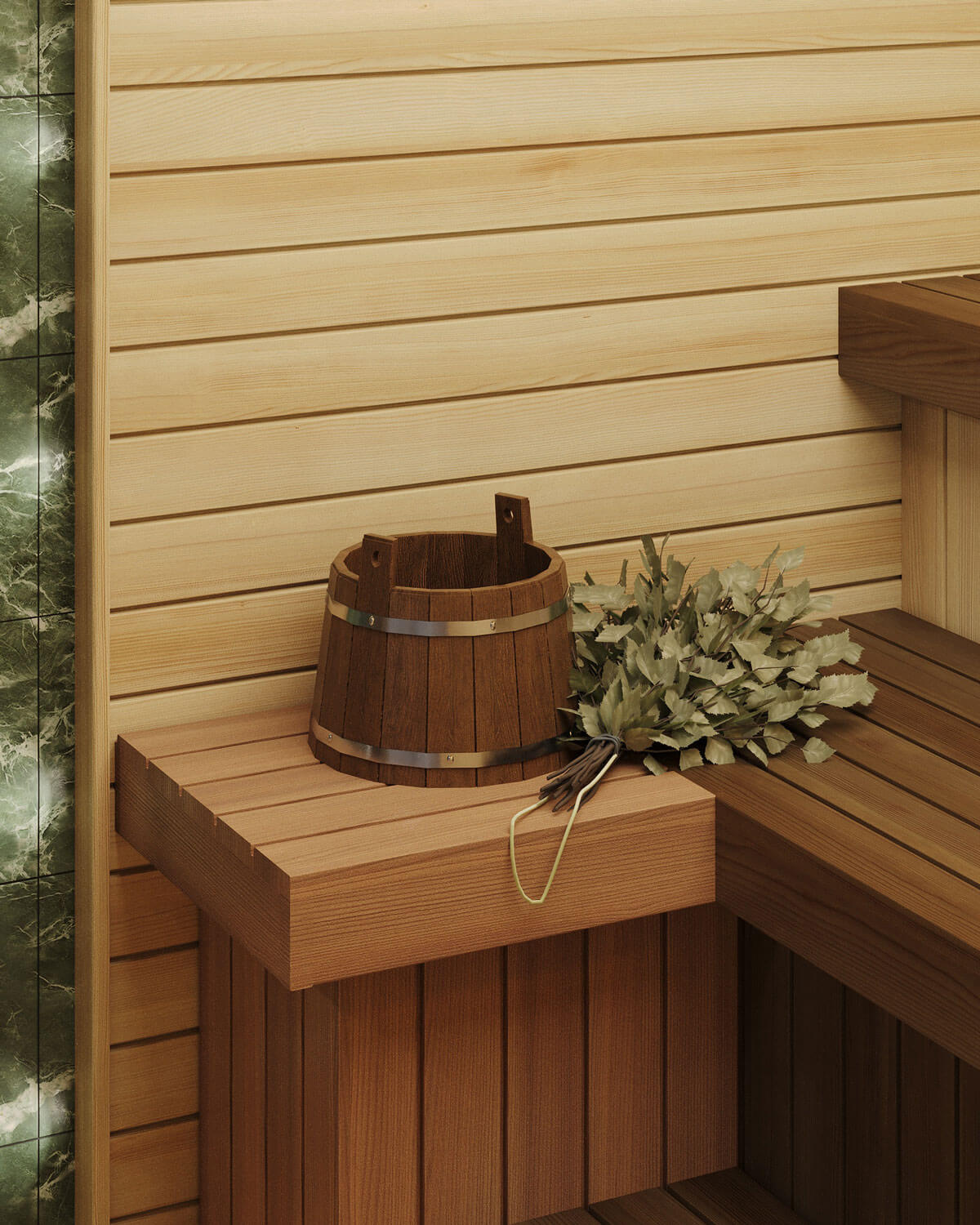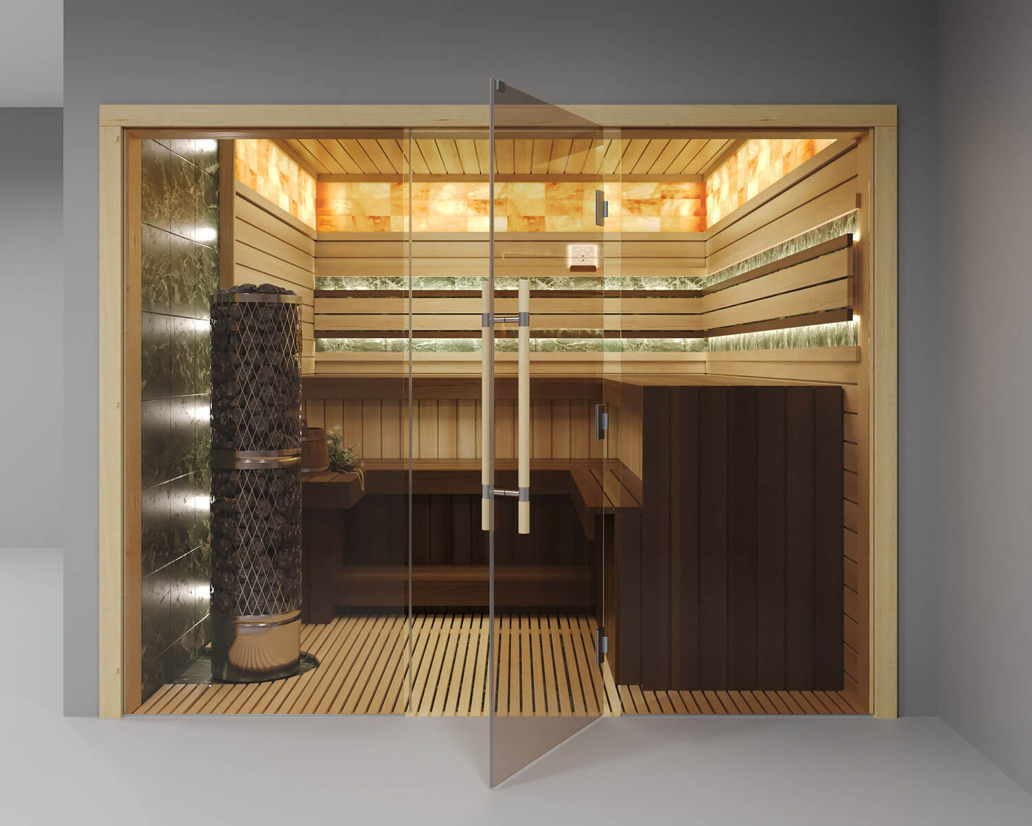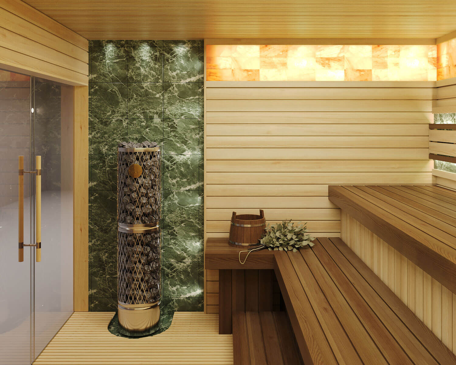 Проект «Малахитовый вечер» — это сауна 7,5 кв.м с удобной планировкой. Одна из стен цельностеклянная, поэтому особое внимание мы уделили правильно подобранной печи — металлическая с открытой каменкой, камень за печью и за подспинником – змеевик, в верхней части стен располагается гималайская соль с подсветкой. Полки выполнены из термодревесины абаш, стены из ароматного канадского кедра. Конструкция полков позволяет задвигать один полок, освобождая полезное пространство по полу. В проекте мы предлагаем эффектные режимы освещения пространства, чтобы подчеркнуть сочетание натуральных материалов — яркого камня змеевика с термированной и грамотно обработанной древесиной. Сауна «Малахитовый закат» спроектирована по всем необходимым нормам парильного помещения, создавая условия для оздоровления и получения настоящего удовольствия.
