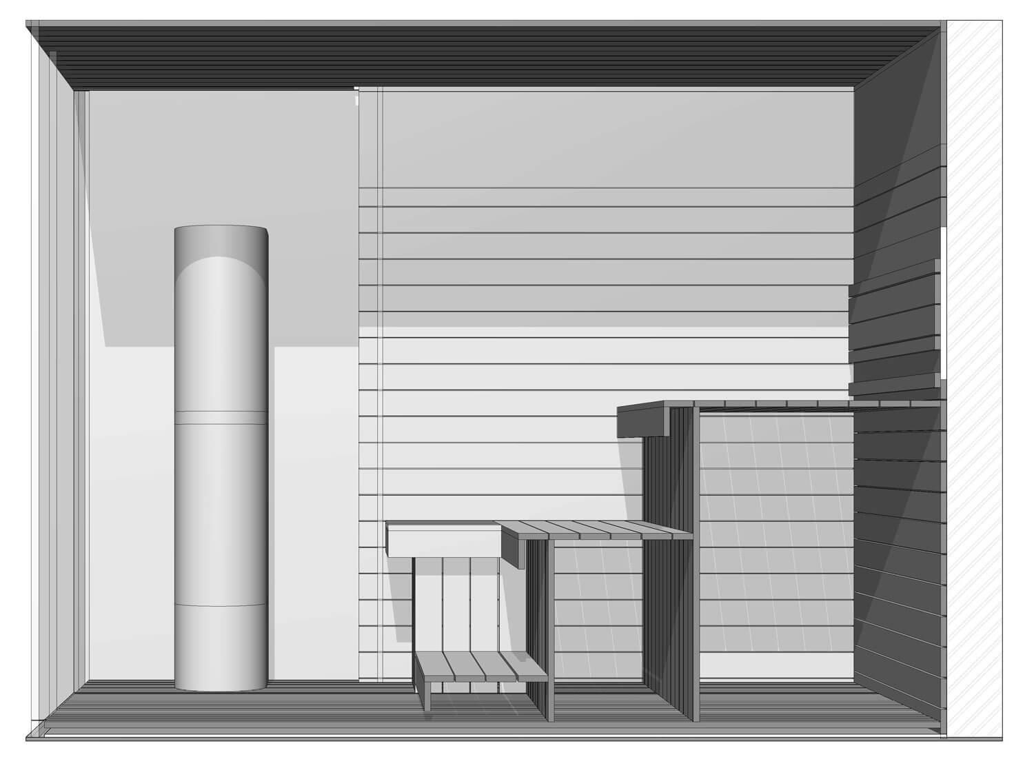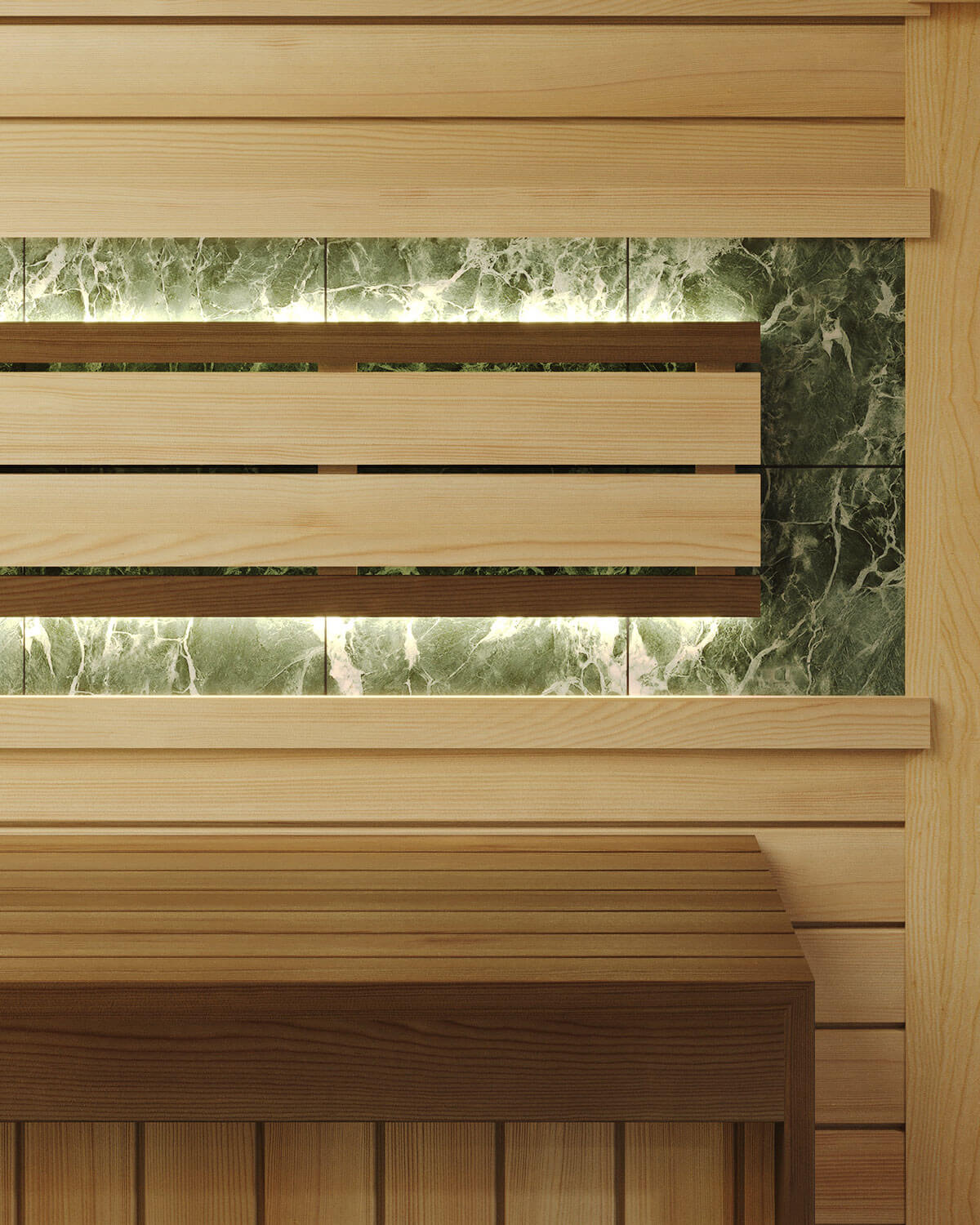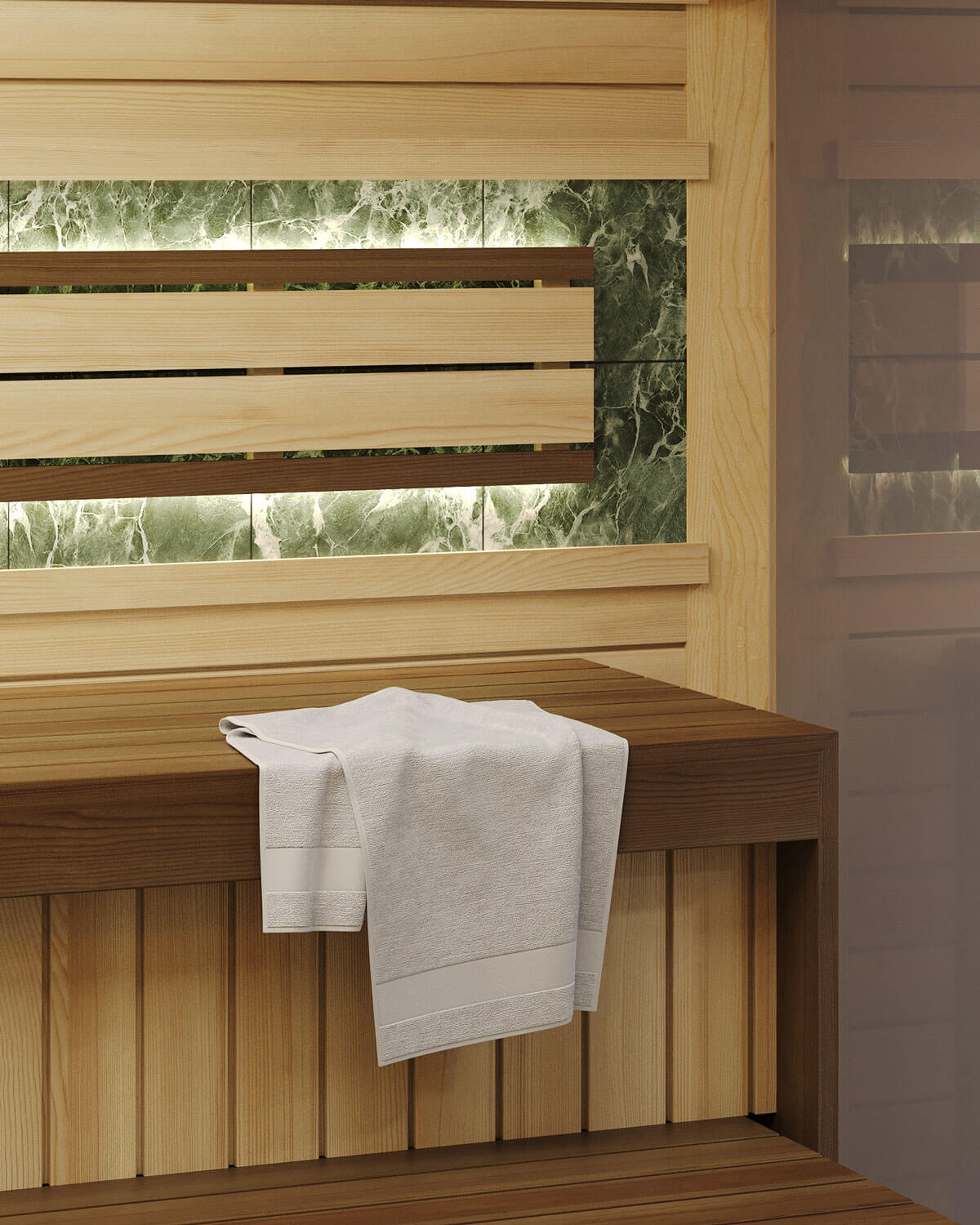 Проект «Малахитовый вечер» — это сауна 7,5 кв.м с удобной планировкой. Одна из стен цельностеклянная, поэтому особое внимание мы уделили правильно подобранной печи — металлическая с открытой каменкой, камень за печью и за подспинником – змеевик, в верхней части стен располагается гималайская соль с подсветкой. Полки выполнены из термодревесины абаш, стены из ароматного канадского кедра. Конструкция полков позволяет задвигать один полок, освобождая полезное пространство по полу. В проекте мы предлагаем эффектные режимы освещения пространства, чтобы подчеркнуть сочетание натуральных материалов — яркого камня змеевика с термированной и грамотно обработанной древесиной. Сауна «Малахитовый закат» спроектирована по всем необходимым нормам парильного помещения, создавая условия для оздоровления и получения настоящего удовольствия.