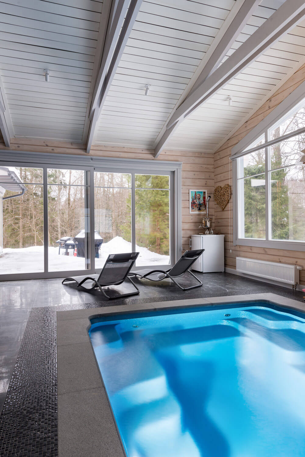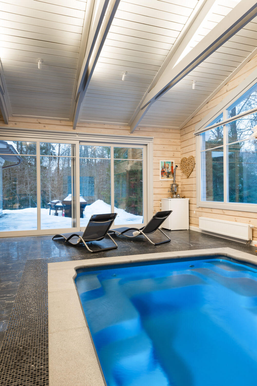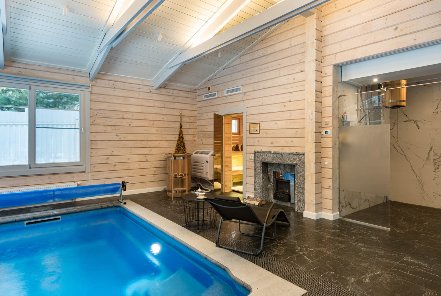 Основной в проекте стала спа-зона: она включает закрытую часть с бассейном, сауной и душевой и открытую с террасой-солярием, уличным джакузи и бочкой на дровах. Раздвижная оконная конструкция позволяет их легко объединить в теплый сезон. Система вентиляции, укрывное полотно для бассейна помогают контролировать влажность в доме.