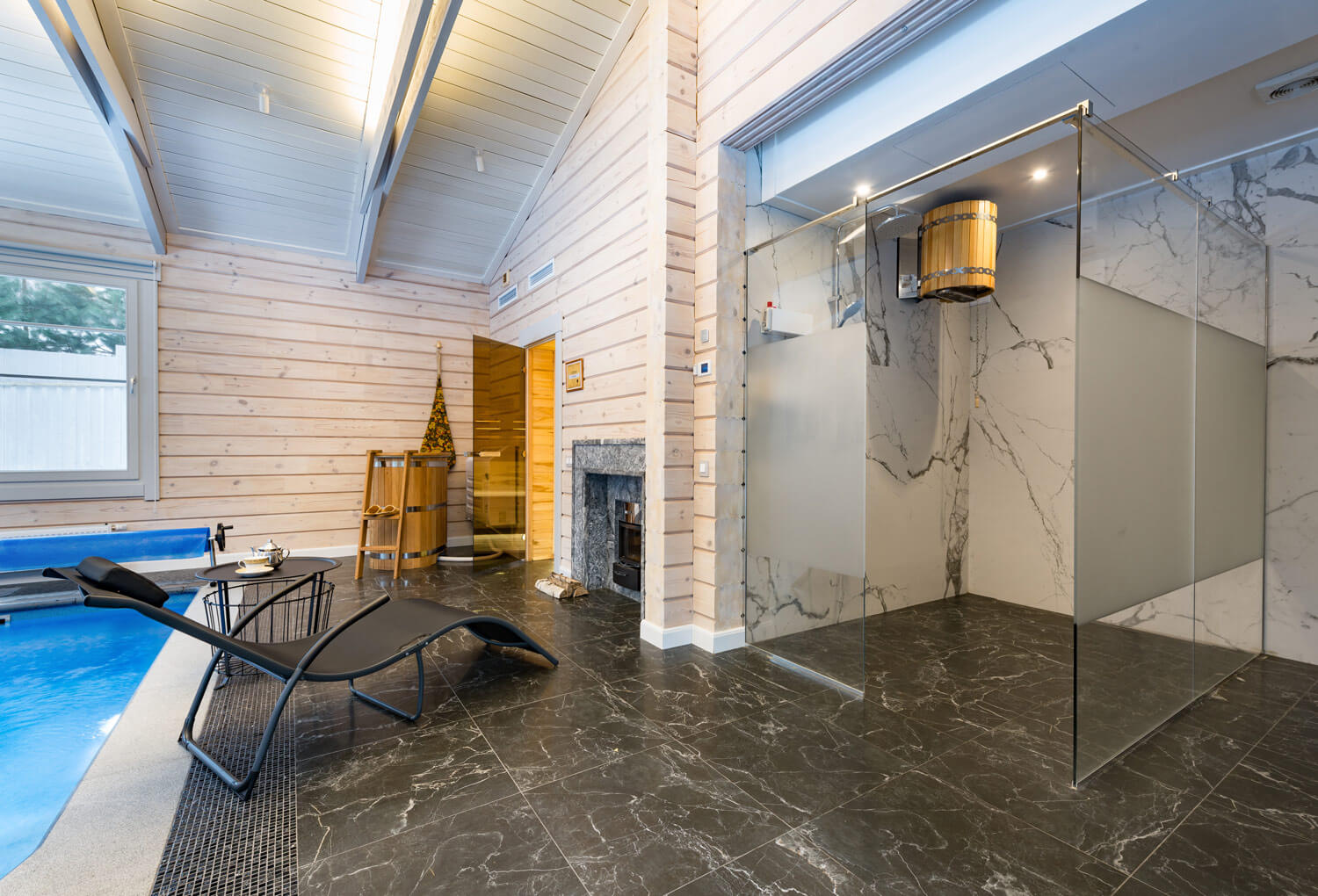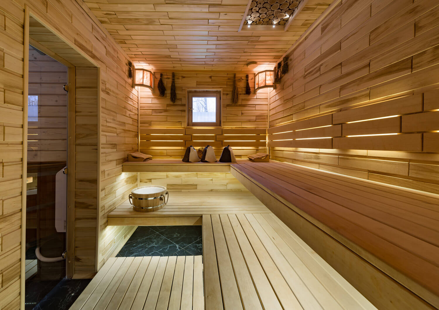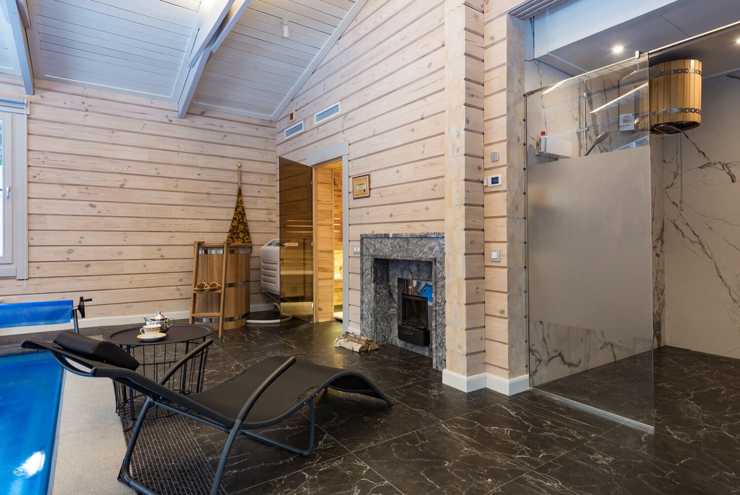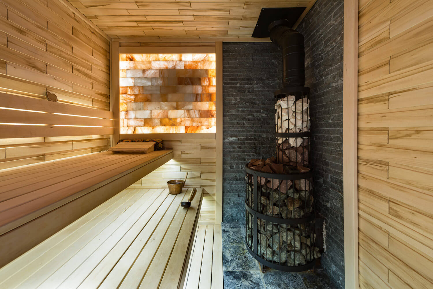 В сауне потолок декорирован панелями из эвкалипта и соляными кирпичами. Сердце сауны — дровяная печь-каменка. Ее топочная часть выходит в помещение с бассейном: здесь осуществляется закладка дров. Большая масса камней (200 кг) обеспечивает идеальный мелкодисперсный пар. Окно в парной — прекрасное решение: проветривание необходимо для быстрого осушения воздуха в помещении.