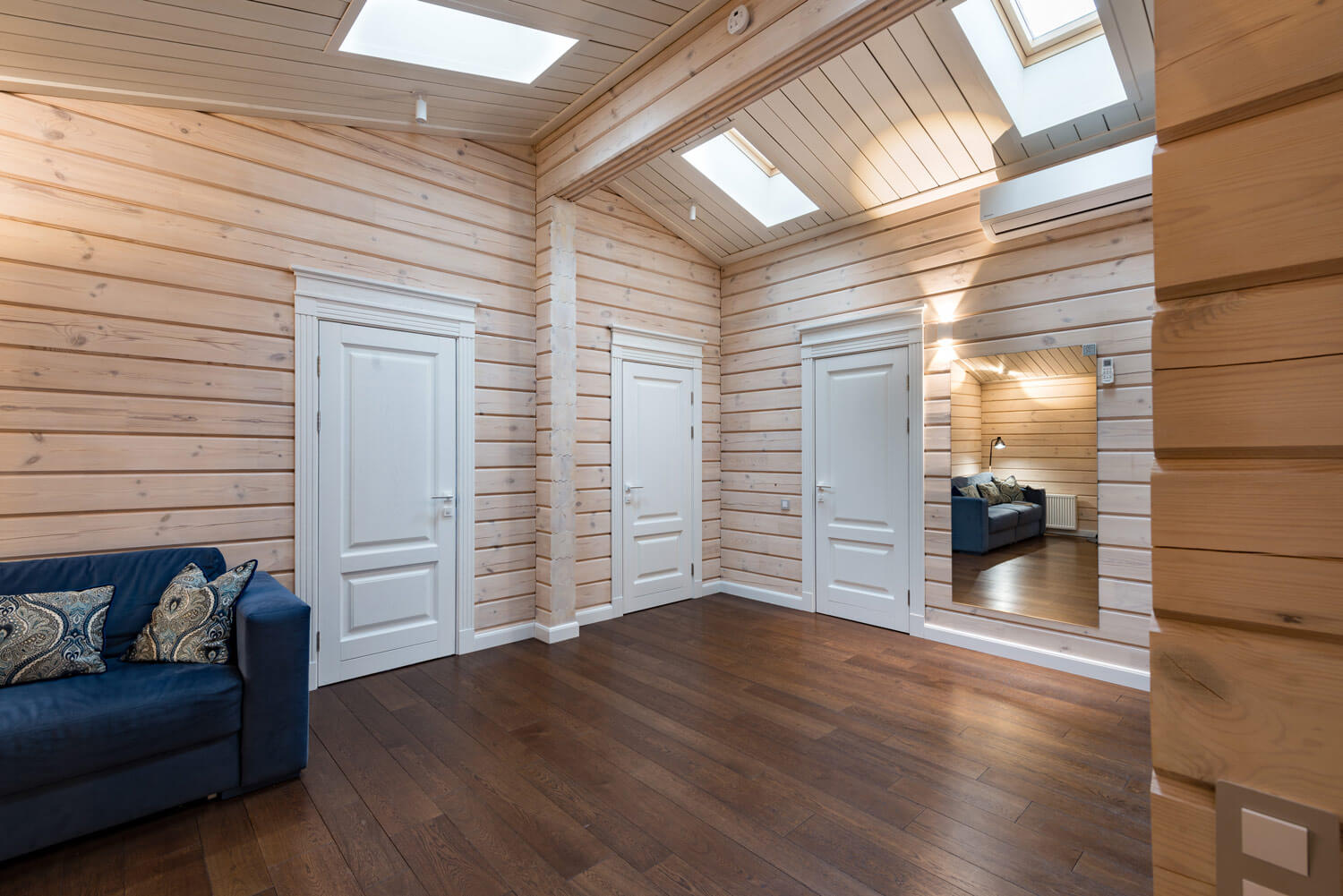 Двухэтажный дом с зоной спа возведен из соснового клееного бруса на участке, с трех сторон окруженном лесом. Главная идея проекта — полная свобода, максимальная ориентация жилых пространств на природу, открытость помещений и террас. На архитектуру объекта во многом повлиял значительный перепад рельефа, тем не менее на территории удалось сохранить практически все многолетние деревья.