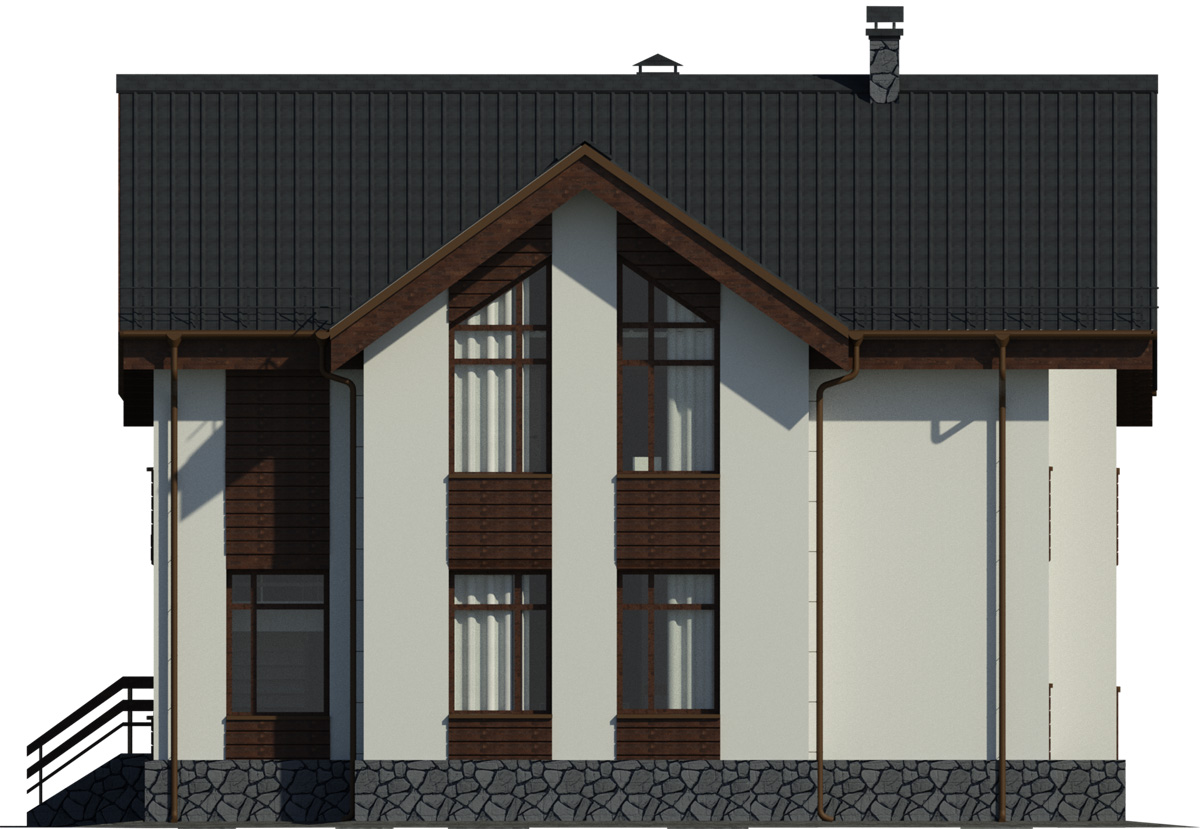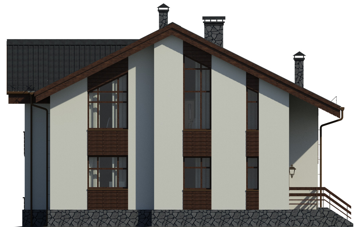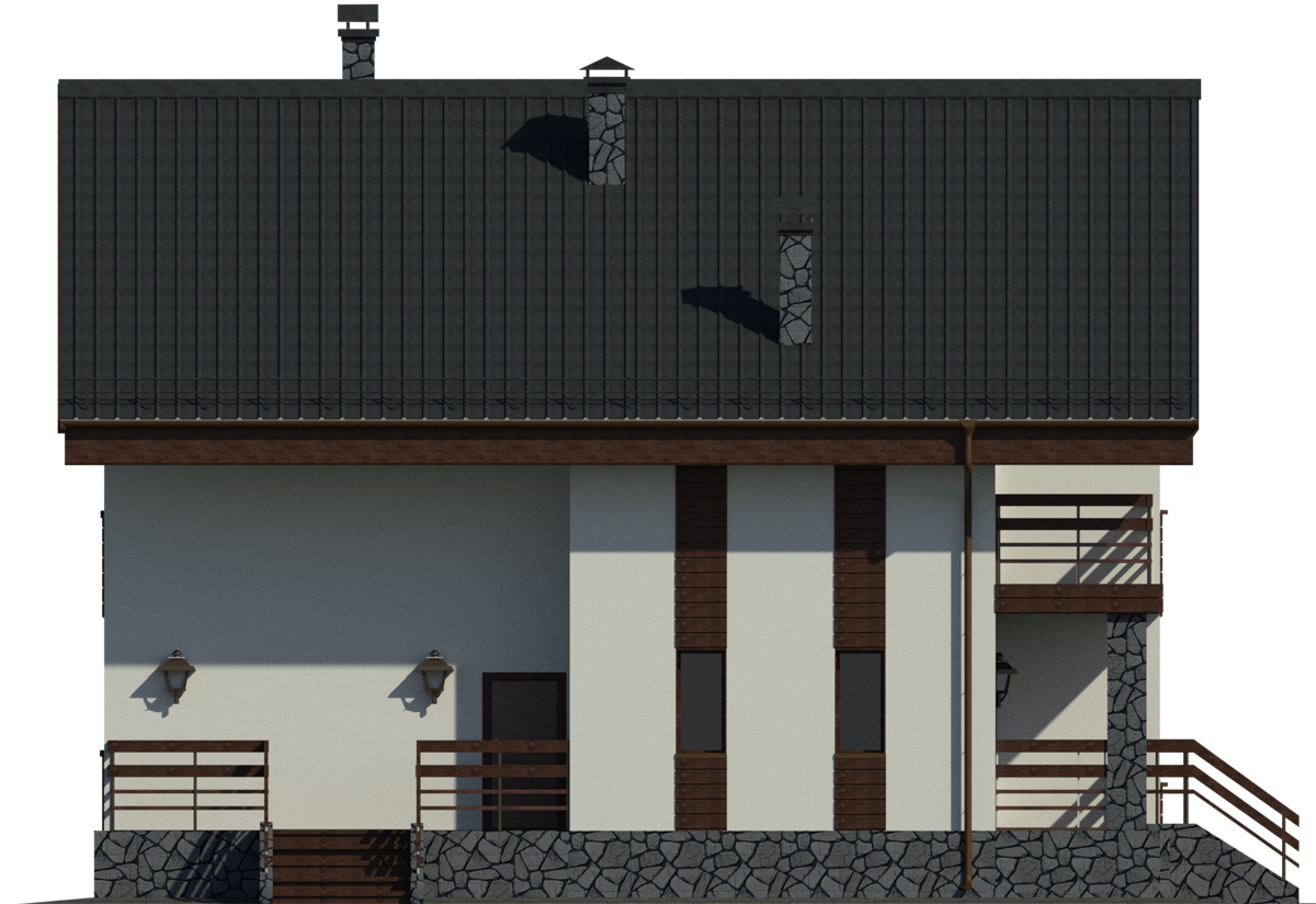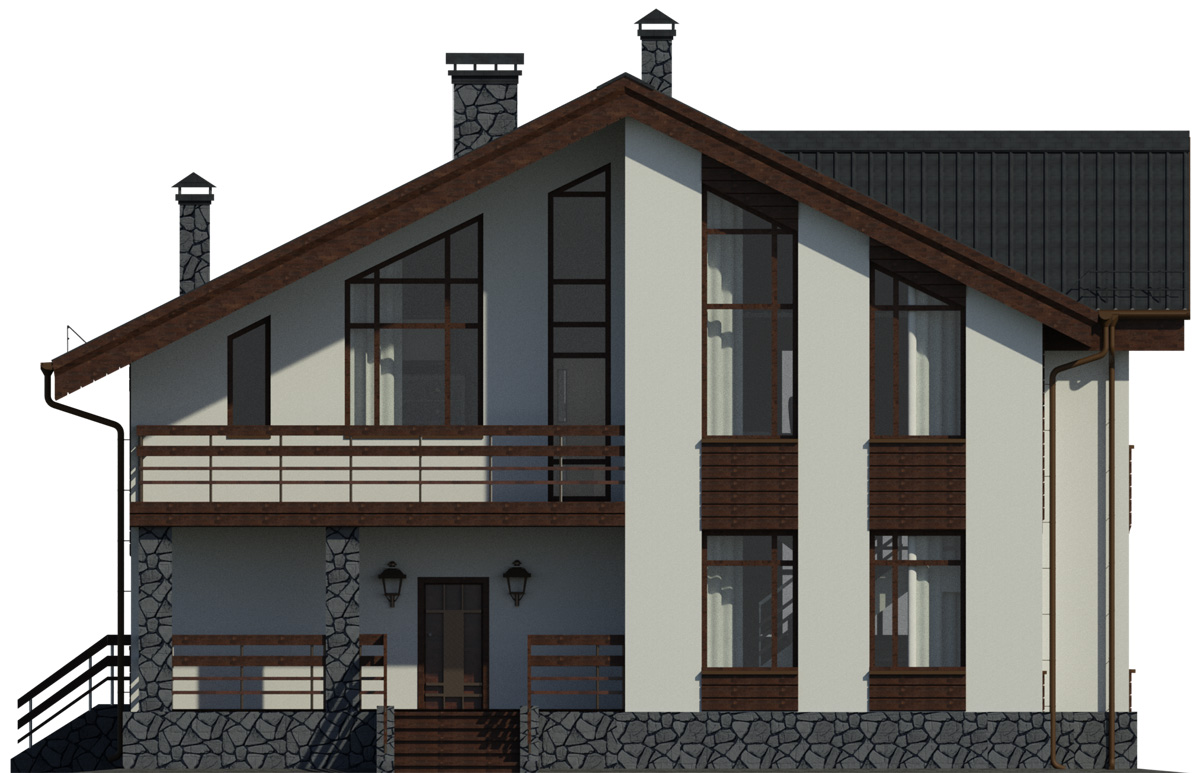 В отделке фасада частично используется камень. Благодаря использованию натурального камня в цокольной части фасад приобретает монументальный и целостный вид.