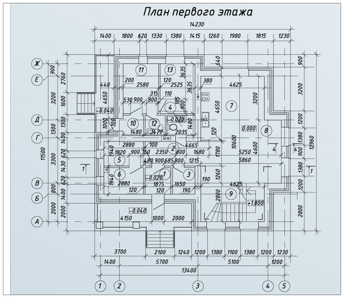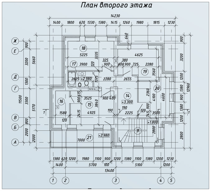 Дом двухэтажный. Пространство первого этажа занимает просторная гостиная, кухня-столовая, архитектурная студия, хозяйственные зоны и санузлы. Мансардный этаж является зоной личного отдыха, в нем расположены три спальни, включая две детские и спальню родителей с выходом на балкон, кабинет и санузел с ванной.