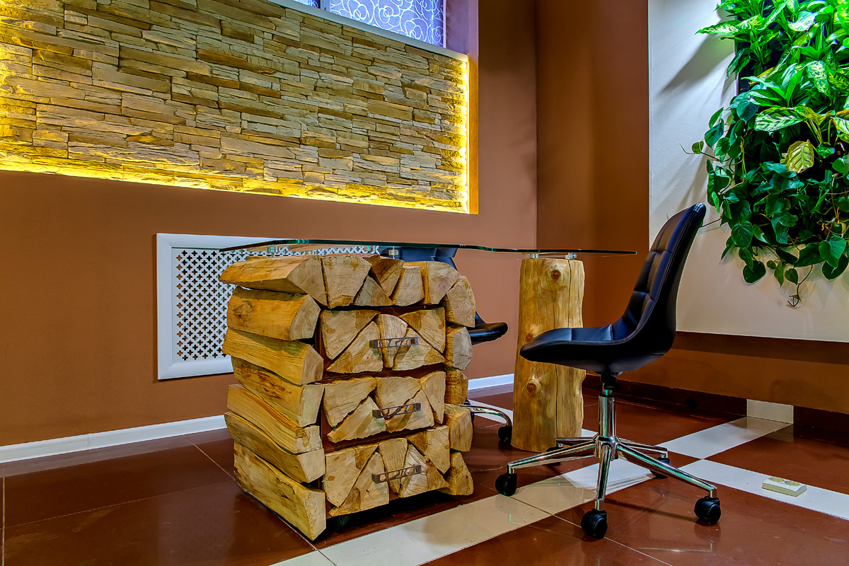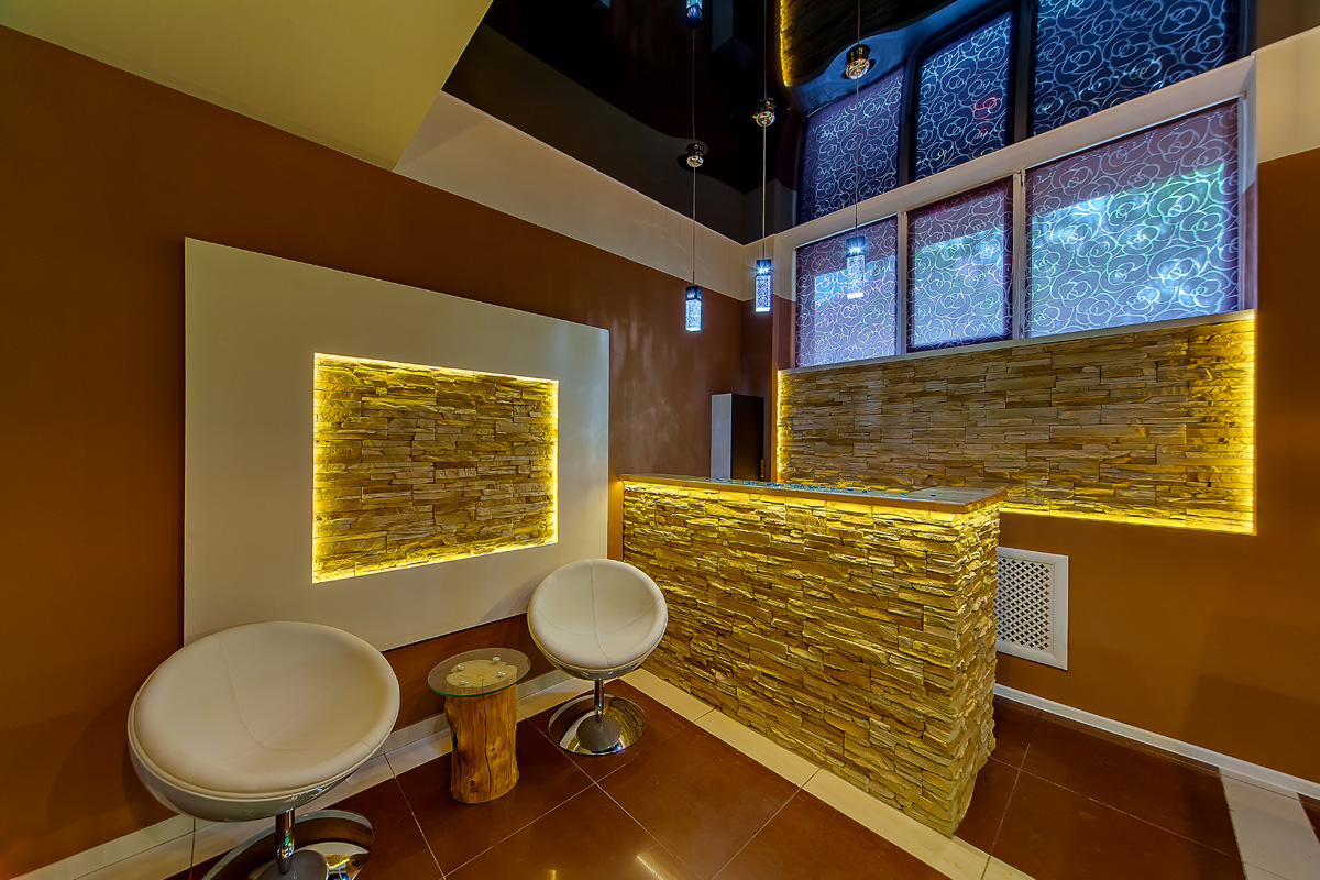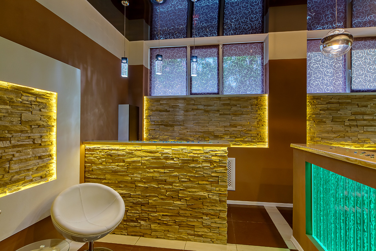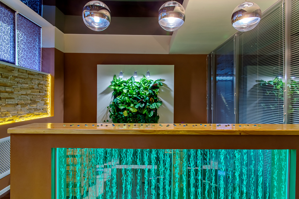 Дизайн-проект интерьера маникюрного салона был разработан и реализован в Москве в бизнес центре класса А. Основной идеей было создание расслабляющей обстановки, в которую может окунуться после рабочего дня любой желающий. Поэтому интерьер решено было сделать в экологическом стиле.