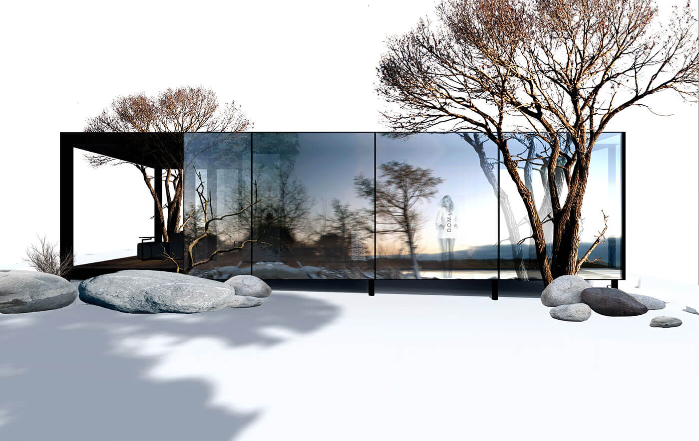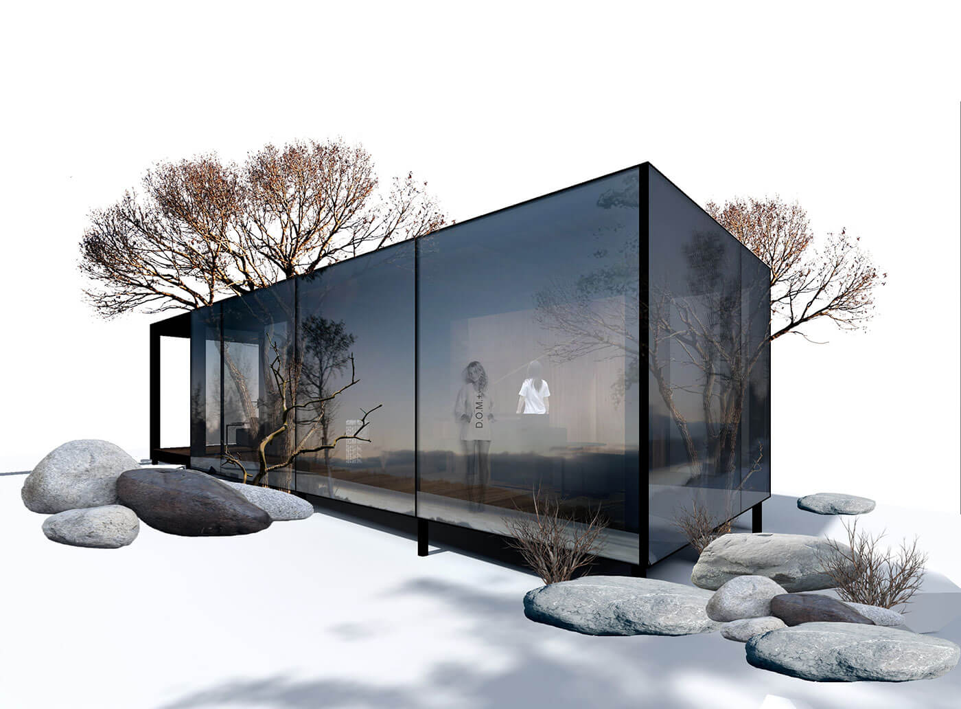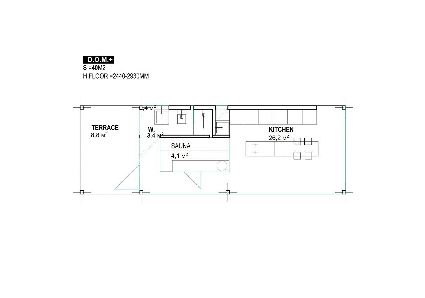 Инновационное жильё D.O.M.+ было создано после тщательного изучения многолетнего опыта развития технологий строительства в Канаде, США и ряде европейских стран. Конструкция дома включает: каркас 150/200x50/100 мм, металлические конструкции на большие пролеты, ЛВЛ-брус, утепление, каменная стена. Внешняя отделка: ЦСП, цвет чёрный/белый/серый. Отделка террас: клеёные панели из берёзы от UPM Plywood, цвет белый/бежевый/«орех»/чёрный. Панорамное остекление: калёное стекло, энергосберегающие двухкамерные стеклопакеты c тонировкой AGC Stopsol Phoenix Grey Top N. Стеклянные перегородки: калёное стекло.