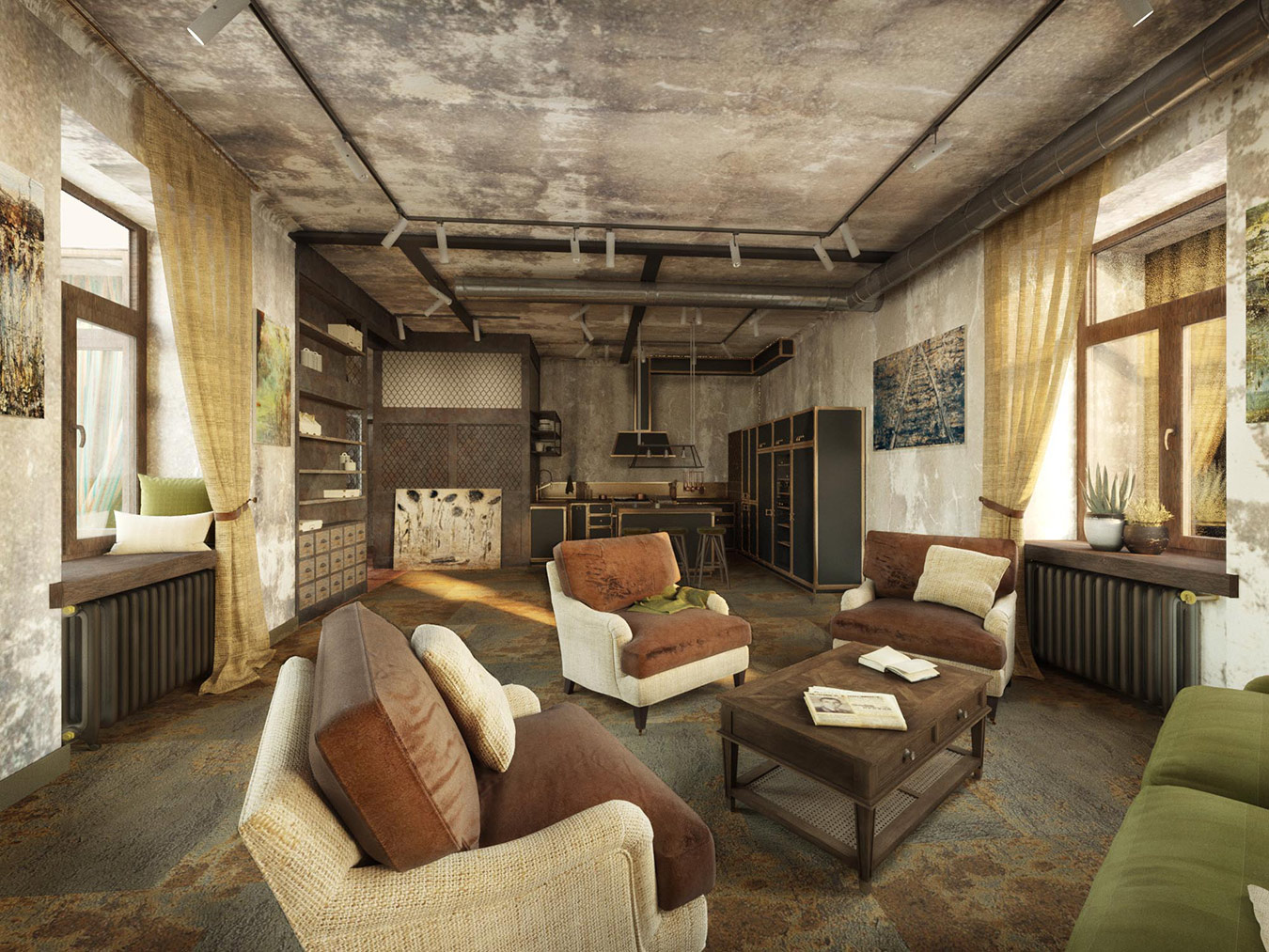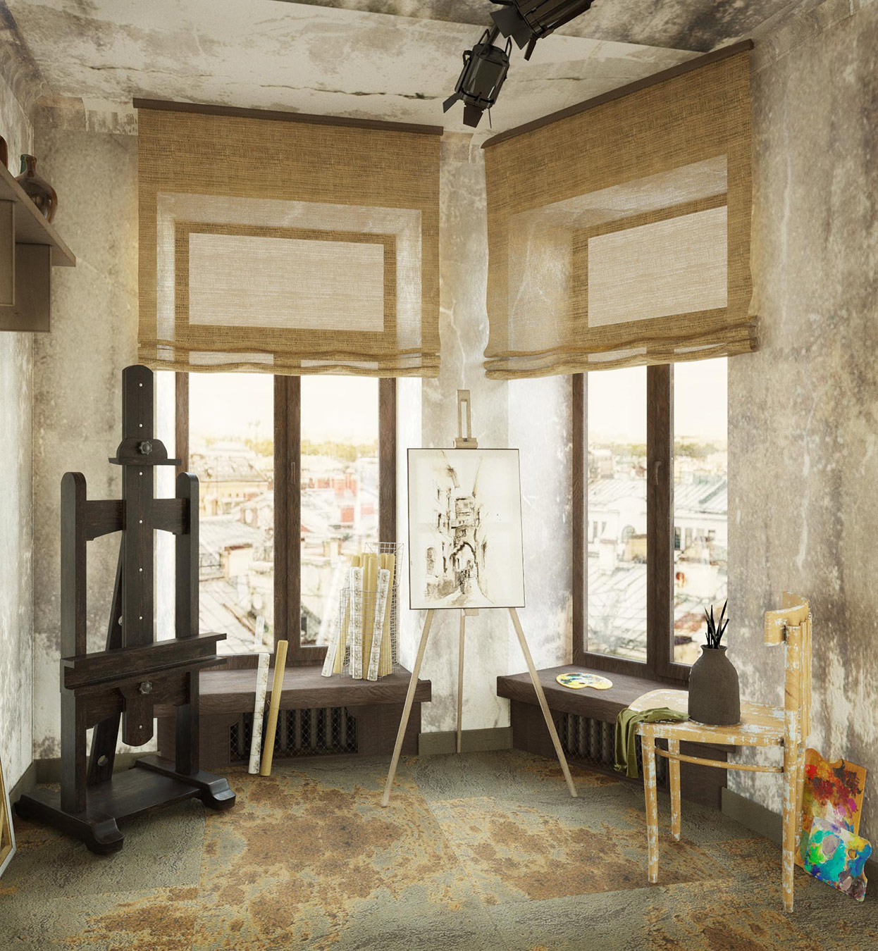 • организовать общественную зону, способную трансформироваться под разные мероприятия, вмещающую в себя места для экспозиции работ художника, разные сценарии освещения, в том числе выставочный свет, с использованием отделочных материалов, устойчивых к износу;