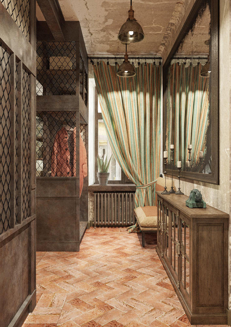 Концептуальный проект квартиры общей площадью 164,8 м², расположенной в историческом центре Санкт-Петербурга, создавался для художника и его жены, журналистки, которые ведут активный образ жизни. Они работают, принимают клиентов, собирают квартирники — и все это происходит в стенах их дома. Источником вдохновения для дизайнера послужила атмосфера пасмурного Петербурга, старых парадных, квартир и дорогих сердцу вещей, которые передаются из поколения в поколение.