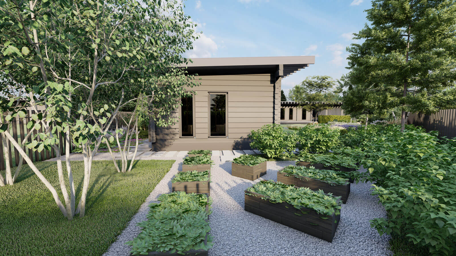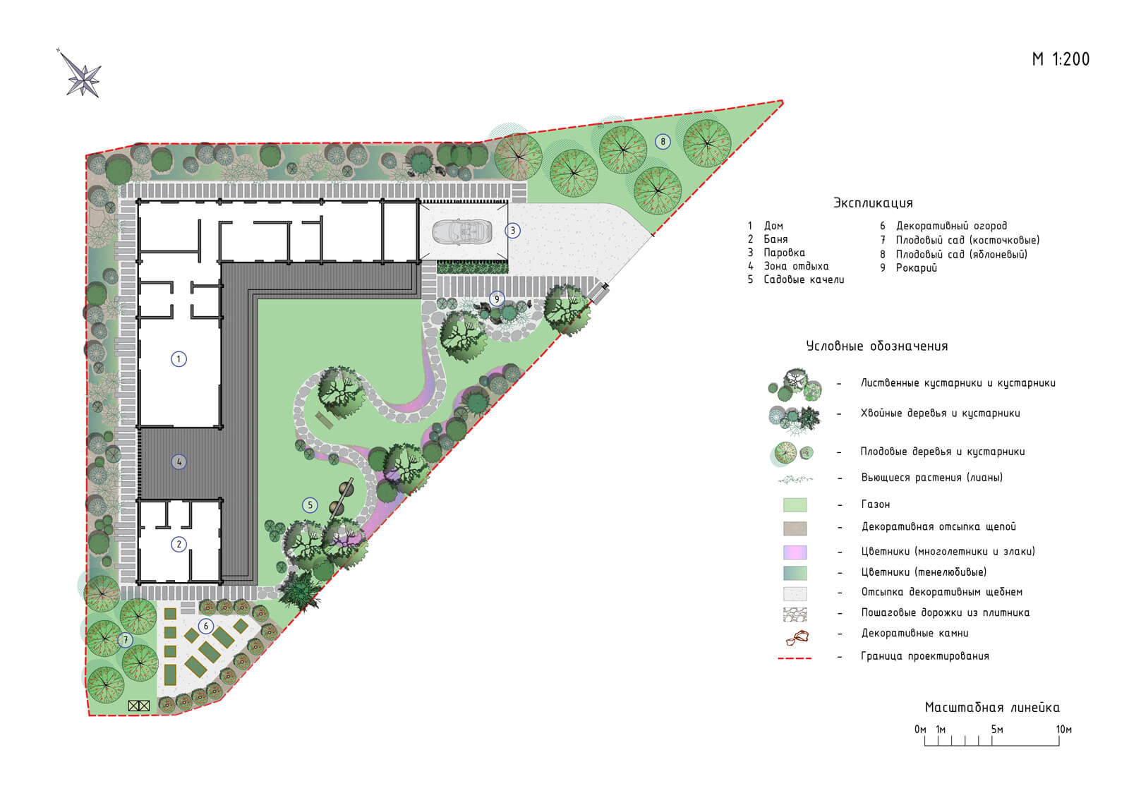 Плодовый сад и огород заняли самые солнечные уголки участка, позволяя сохранить центральное пространство свободным.