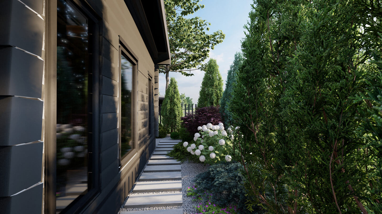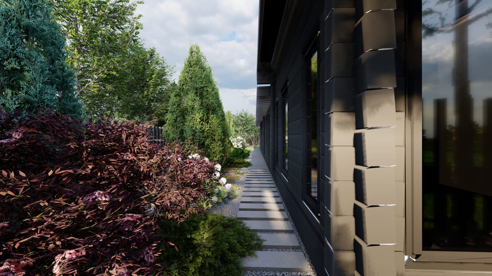 Дополнительно группы декоративных растений расположены напротив панорамных окон дома, создавая живописные сезонные композиции, которые можно наблюдать изнутри.