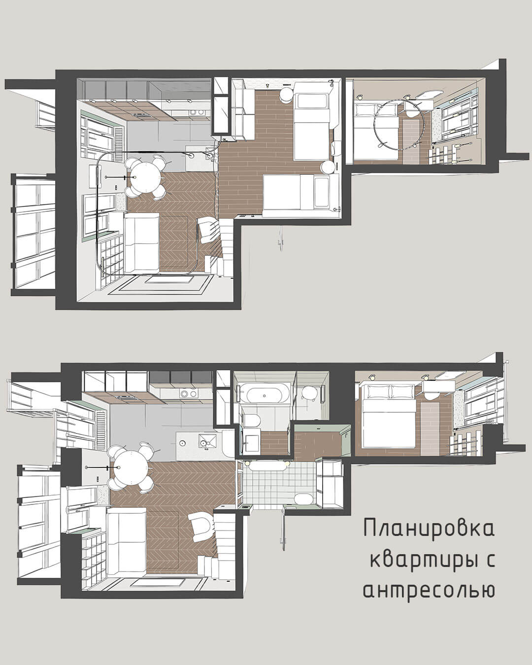 Переход между зонами подчеркнут различием напольных покрытий и фактур материалов.