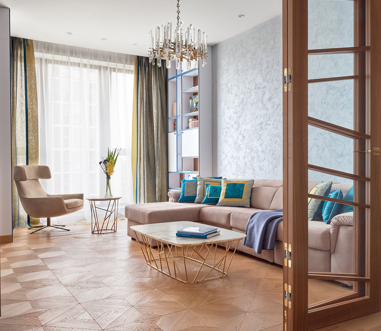 Ритмичность линий и четкая геометрия, прохладная гамма, роскошные детали и ощущение воздуха — такое уютное и элегантное пространство создано для современной бизнес-леди.
