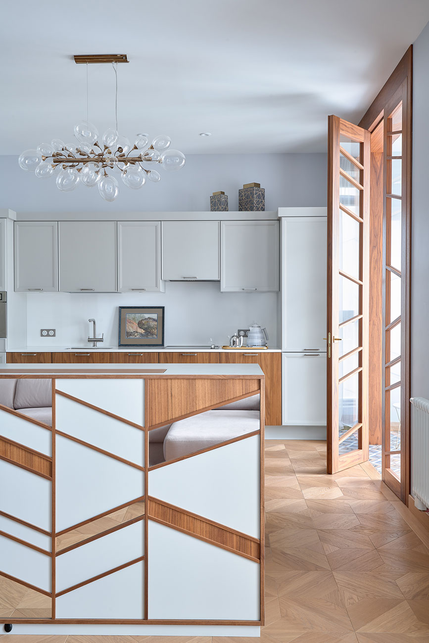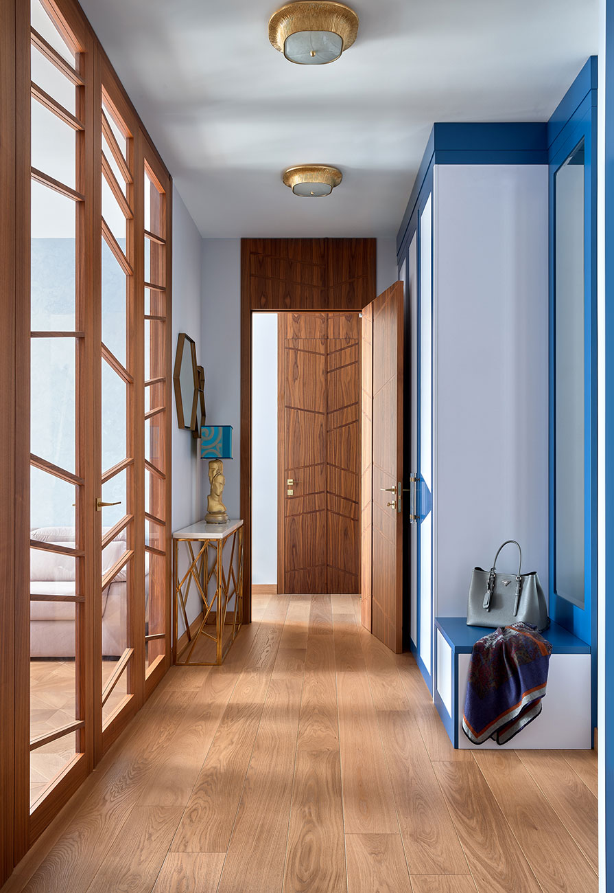 Одним из базовых акцентов всего пространства квартиры стали прозрачные ореховые двери со стеклянными вставками. Они визуально отделяют зону общественного пространства от прихожей, но при этом пропускают свет и солнечные лучи даже в самые отдаленные уголки квартиры. Что касается помещений, для которых нужна приватность, авторы проекта предусмотрели цельные двери из ореха, которые оформлением перекликаются с перегородками.