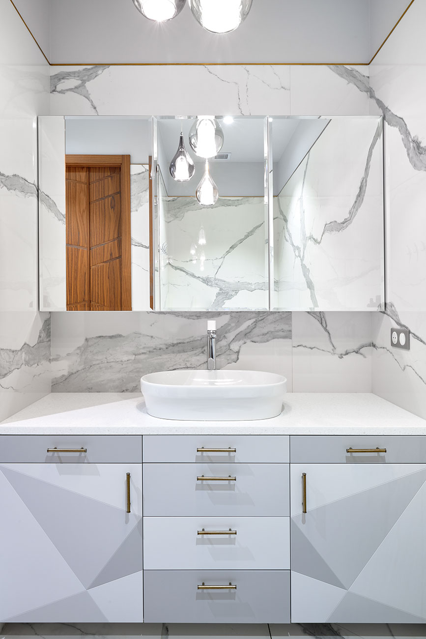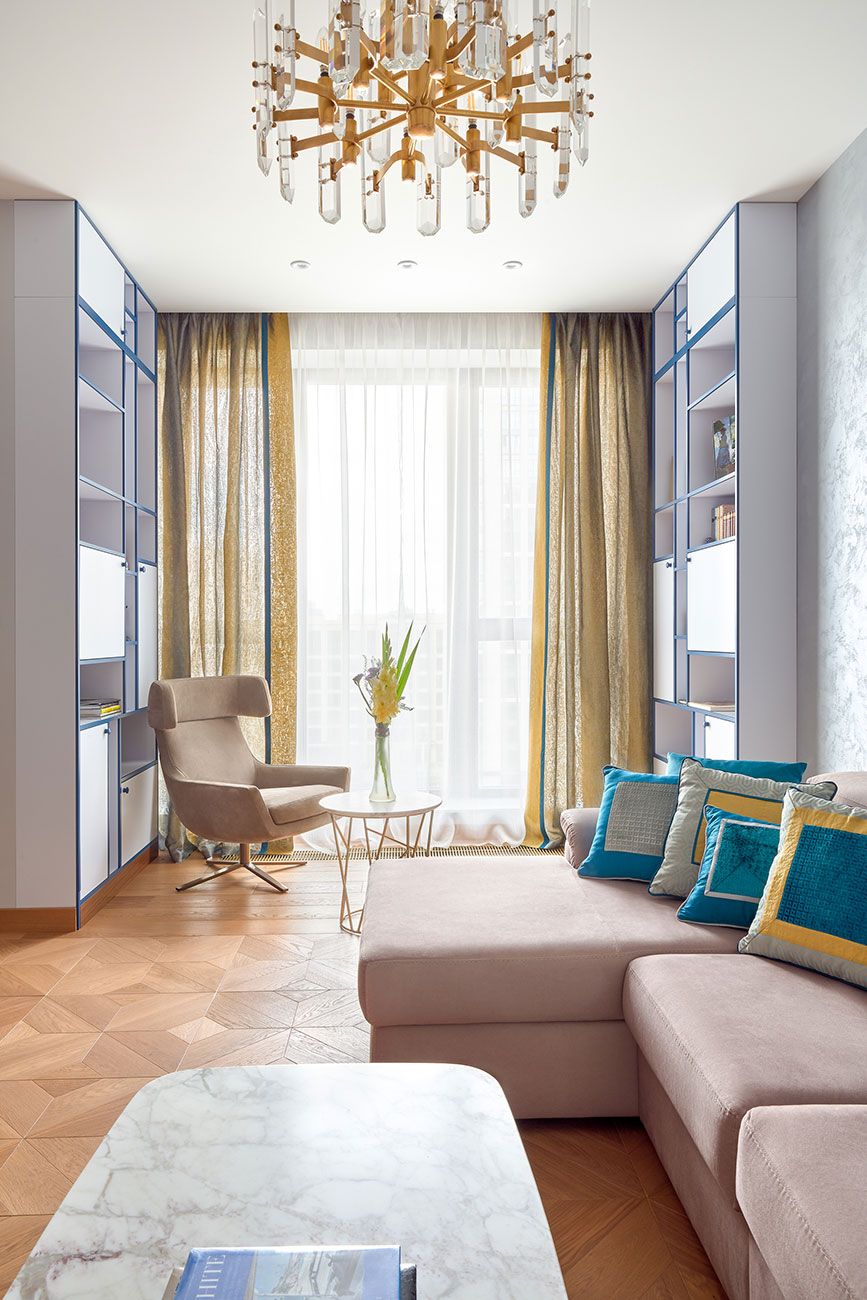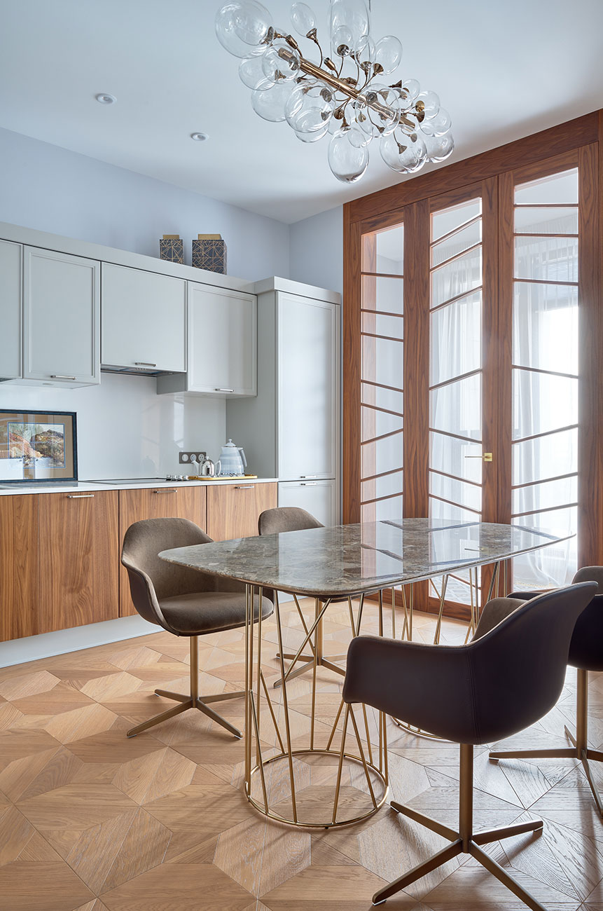 Большое количество мебели и все двери выполнены по эскизам авторов проекта, что привнесло в пространство индивидуальность и изысканность. А безупречный вкус и мастерство дизайнеров позволили создать интересную современную интерпретацию всегда актуального ар-деко.