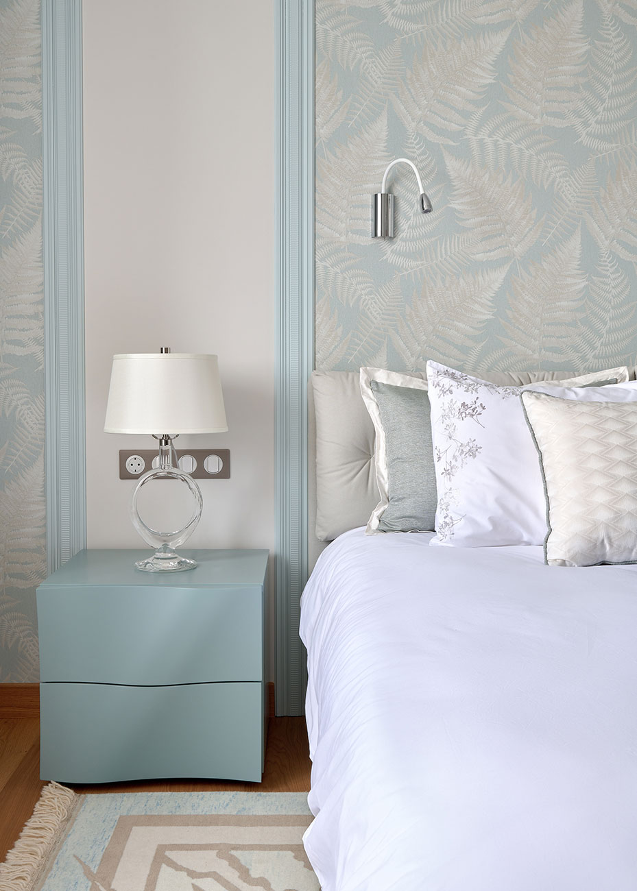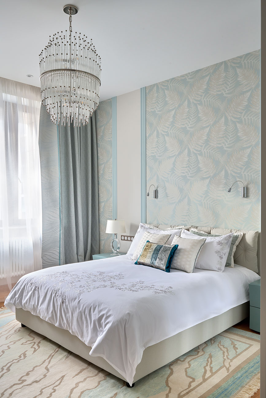 Светлые тона с жемчужным отливом, многоярусная люстра с ниспадающими подвесками, эффектное овальное зеркало — мелодия с нотами ар-деко продолжает звучать в спальне и просторной ванной.