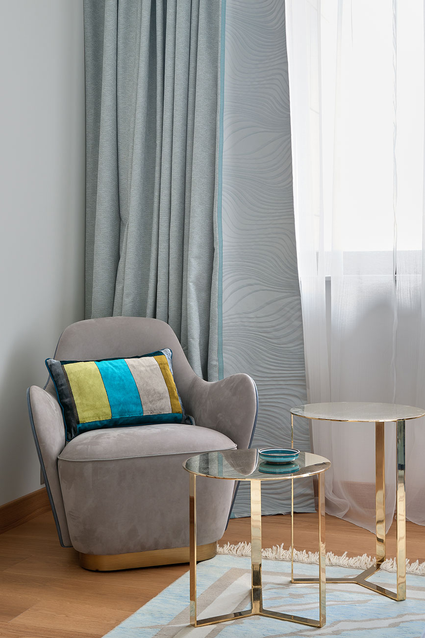 Интерьер выполнен в сдержанной, благородной серовато-голубой гамме с акцентами теплых, желтых тонов (в частности, металла и текстиля).