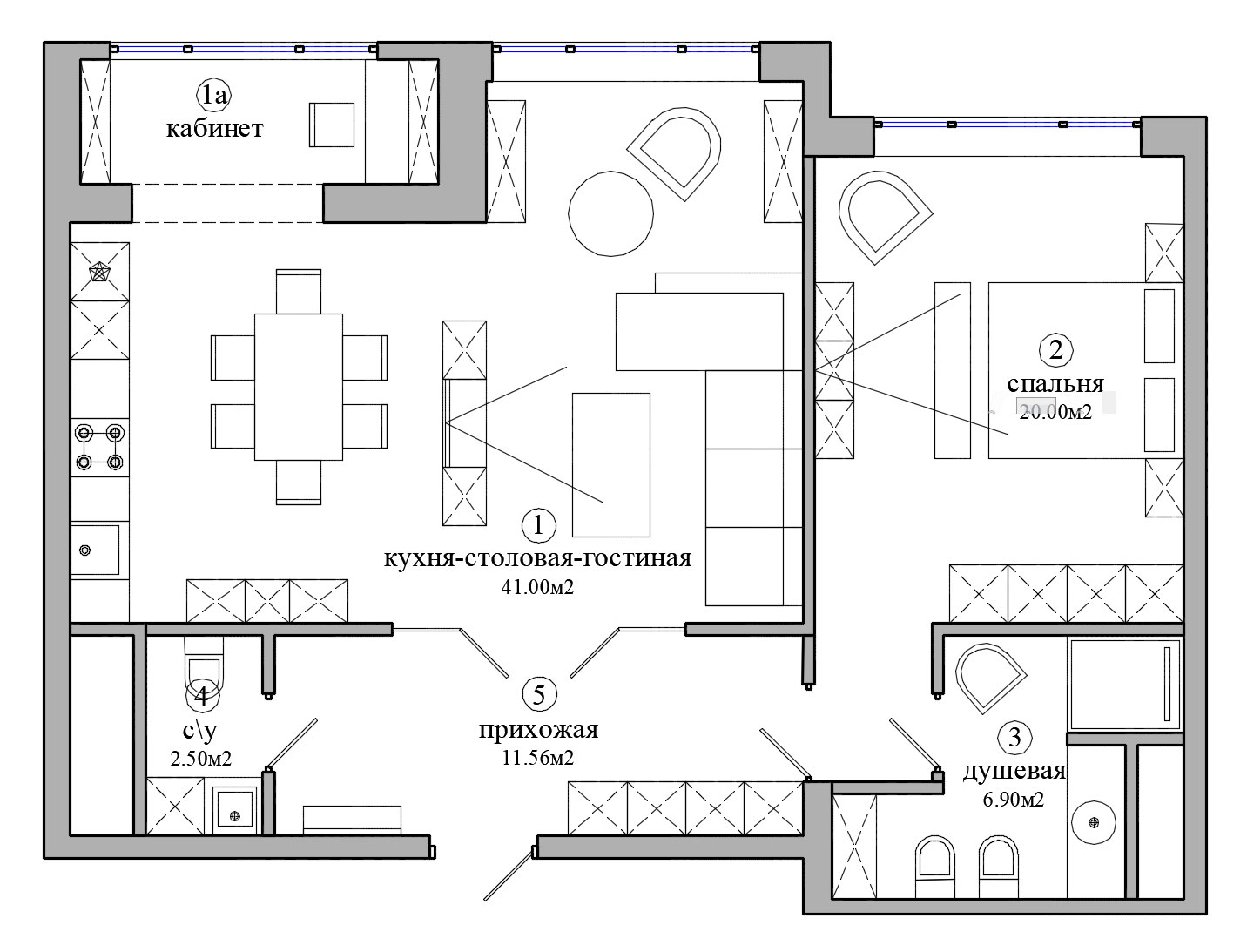 • общественную зону, включающую гостиную, столовую и кухню (площадь увеличили за счет присоединения лоджии);