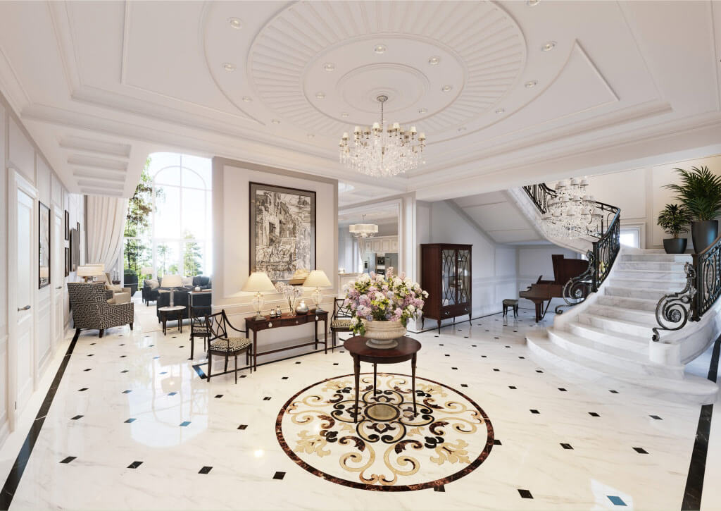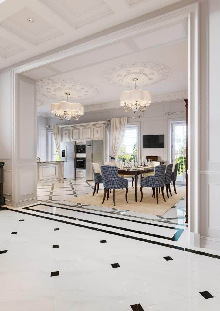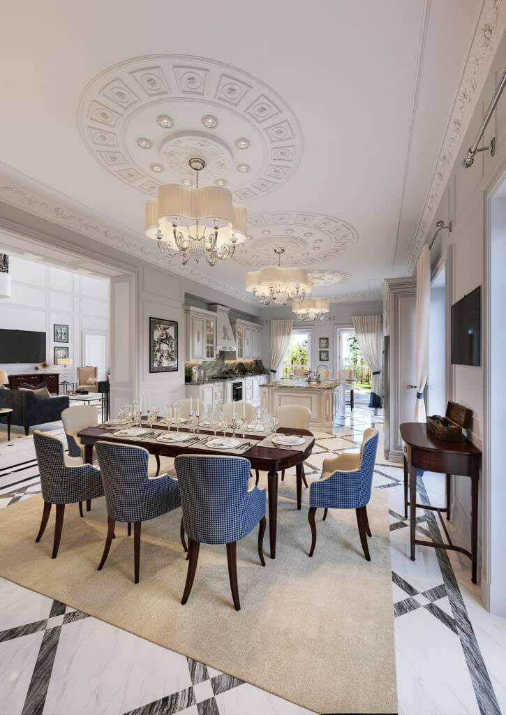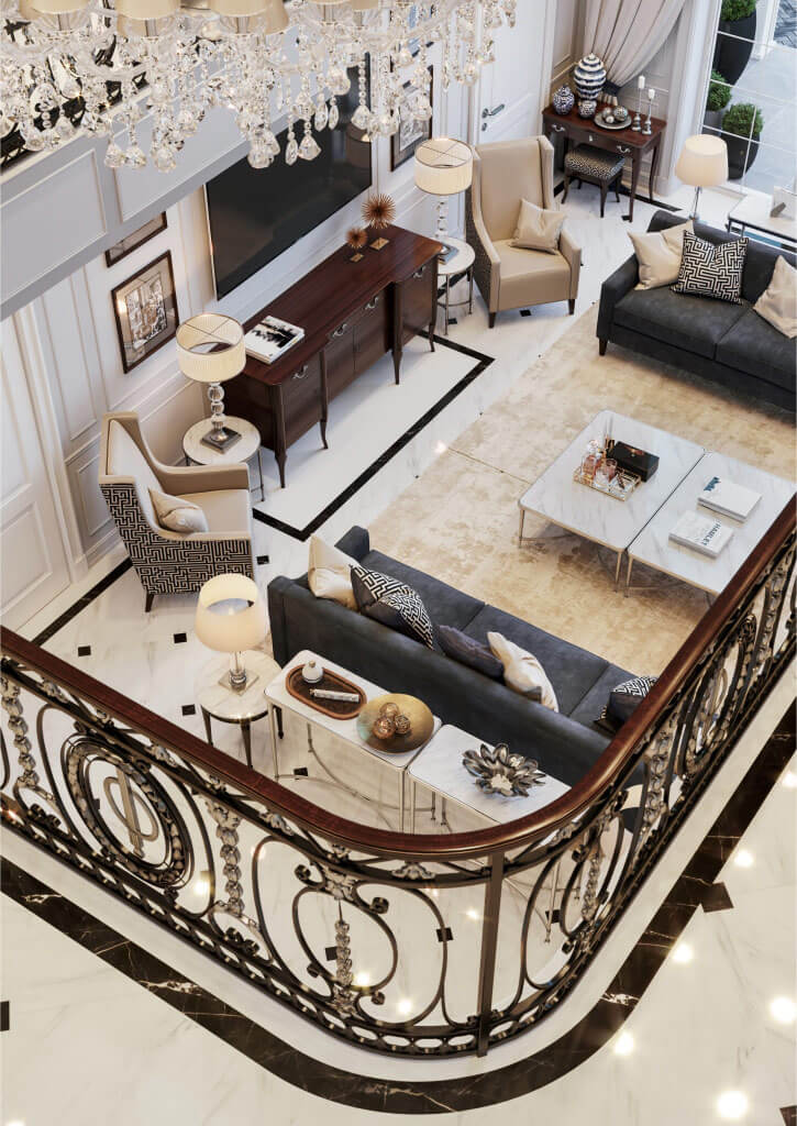 Заходя в дом, вы попадаете в зону прихожей, которая отделена двустворчатыми дверями от просторного холла с мраморной лестницей, далее расположена гостиная, где установлен большой камин из светлого мрамора, выполненный по эскизам нашей студии. Благодаря светлой окраске стен и большому витражному окну, помещение гостиной всегда наполнено светом.