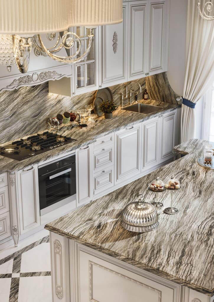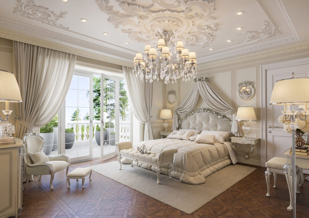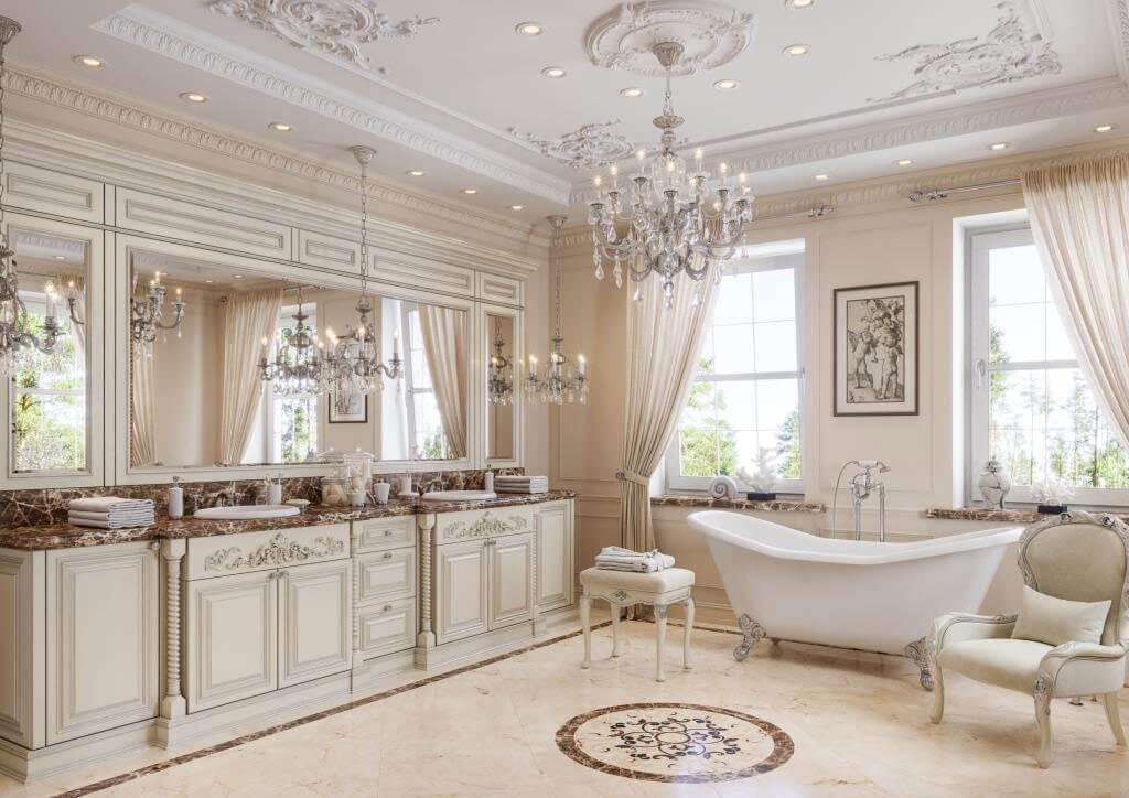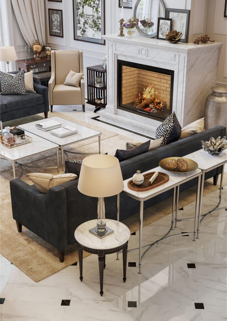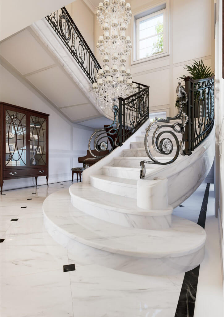 Заходя в дом, вы попадаете в зону прихожей, которая отделена двустворчатыми дверями от просторного холла с мраморной лестницей, далее расположена гостиная, где установлен большой камин из светлого мрамора, выполненный по эскизам нашей студии. Благодаря светлой окраске стен и большому витражному окну, помещение гостиной всегда наполнено светом.