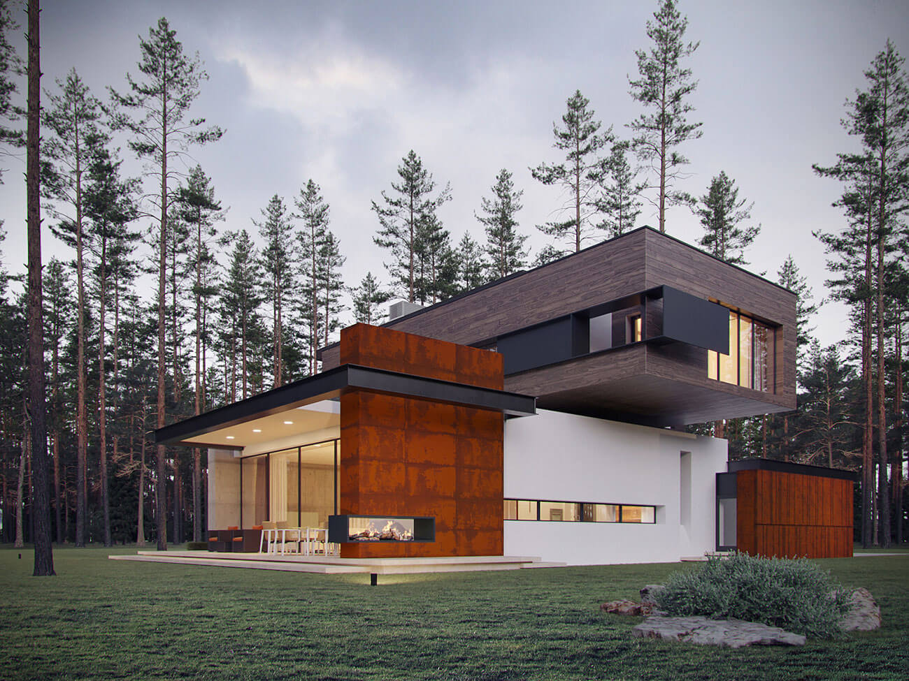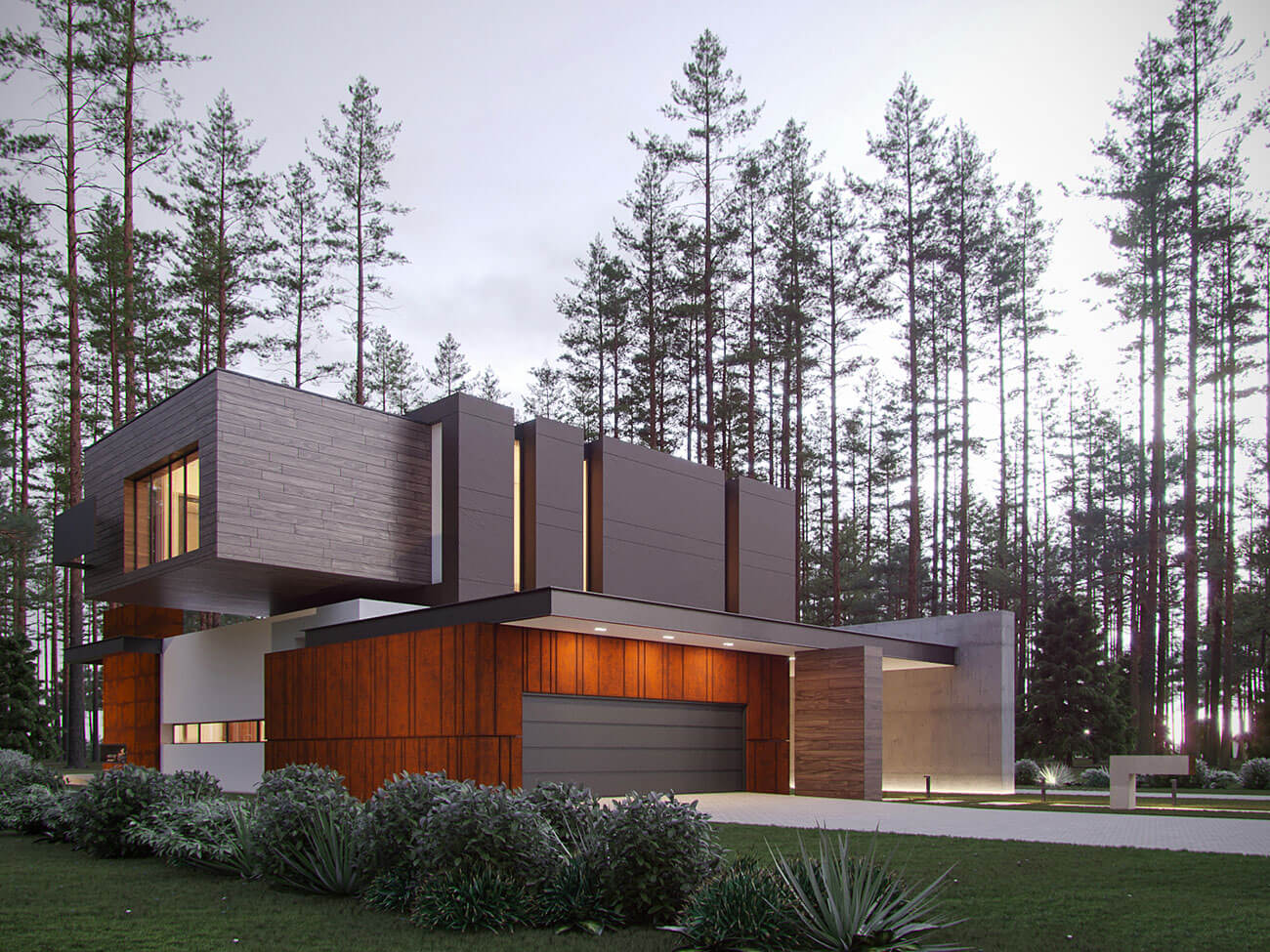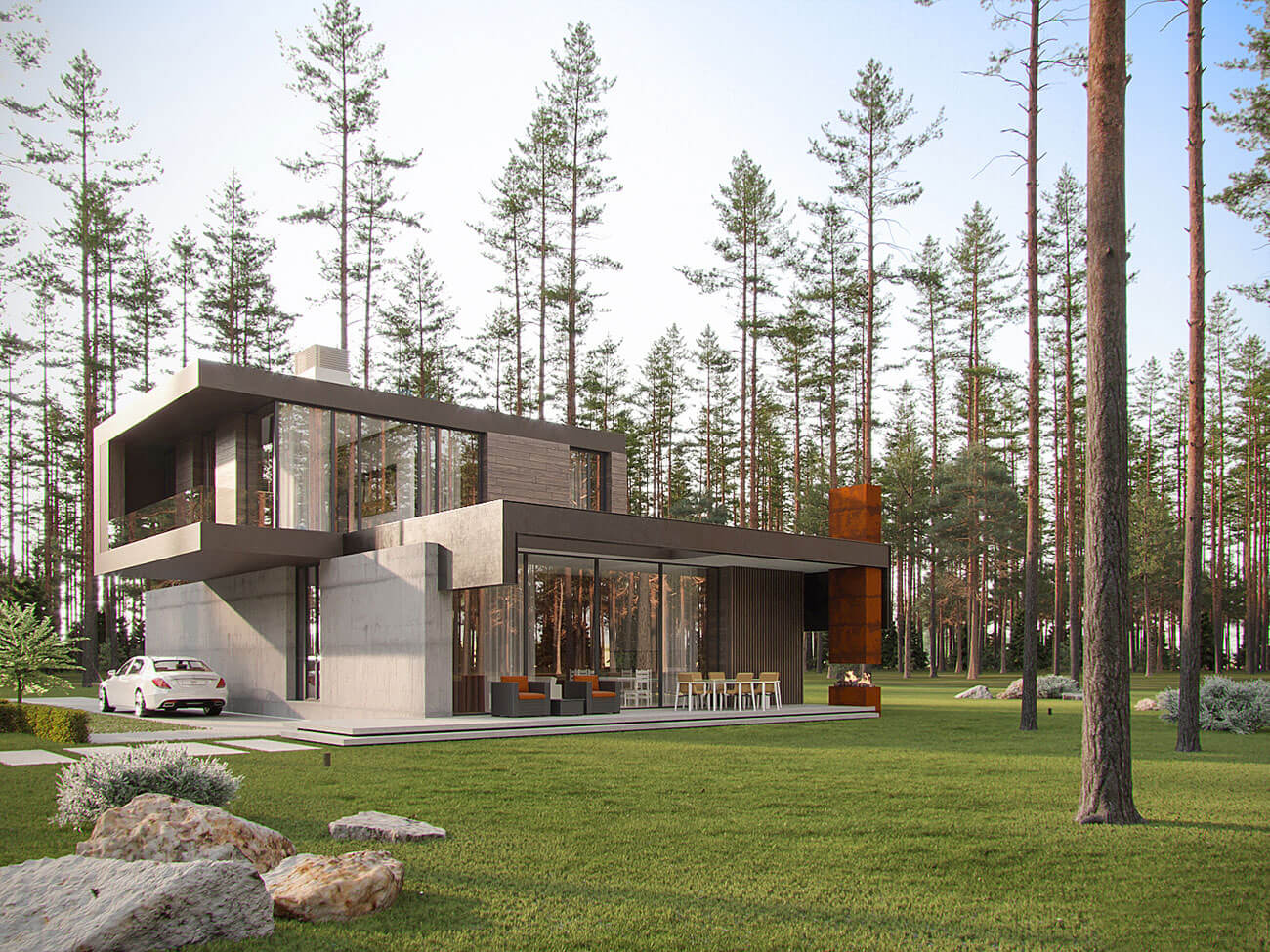 Здания запроектированы в современной стилистике, с плоской эксплуатируемой кровлей и панорамным остеклением в главных помещениях. Архитектура подчеркнуто динамичная, силуэт зданий — с характерными консольными выносами и сложной пластикой фасадов. Вместе с тем визуально теплые и тактильно приятные материалы, примененные в отделке фасадов, создают у владельцев ощущение комфорта и природной естественности — коттеджи гармонично смотрятся в сосновом лесу, который преобладает на участке застройки. Приватность, создаваемая естественным ландшафтом, актуальные архитектурные тренды, экологичность и соответствующие европейским стандартам требования к энергоэффективности домов являются сильной стороной данного проекта.