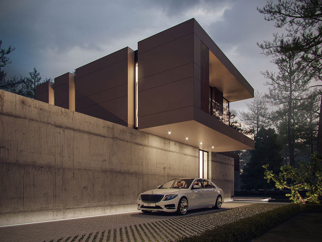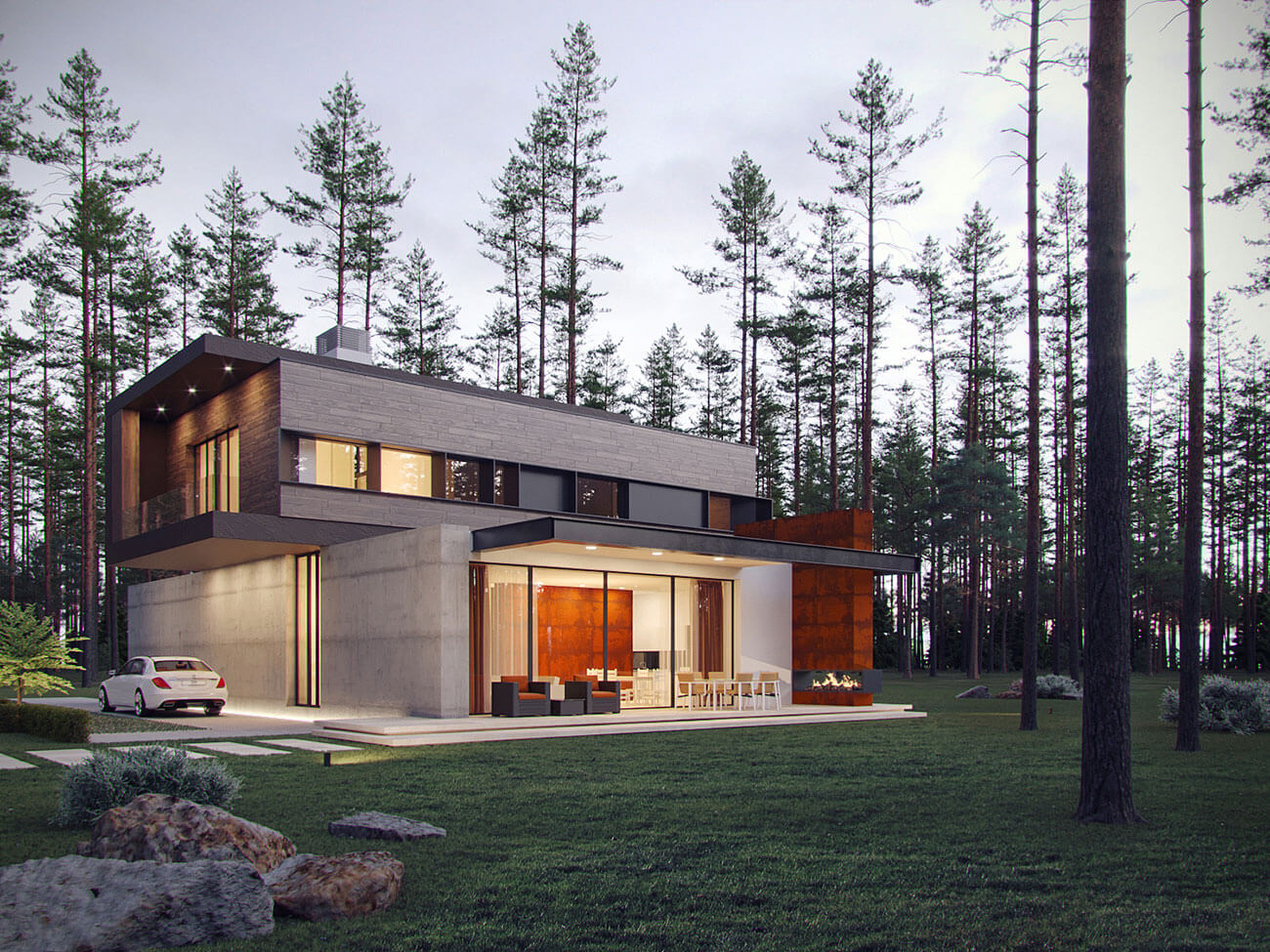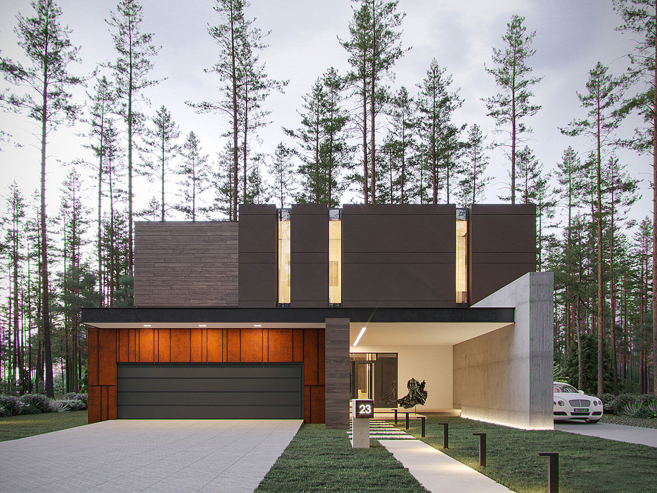 Здания запроектированы в современной стилистике, с плоской эксплуатируемой кровлей и панорамным остеклением в главных помещениях. Архитектура подчеркнуто динамичная, силуэт зданий — с характерными консольными выносами и сложной пластикой фасадов. Вместе с тем визуально теплые и тактильно приятные материалы, примененные в отделке фасадов, создают у владельцев ощущение комфорта и природной естественности — коттеджи гармонично смотрятся в сосновом лесу, который преобладает на участке застройки. Приватность, создаваемая естественным ландшафтом, актуальные архитектурные тренды, экологичность и соответствующие европейским стандартам требования к энергоэффективности домов являются сильной стороной данного проекта.