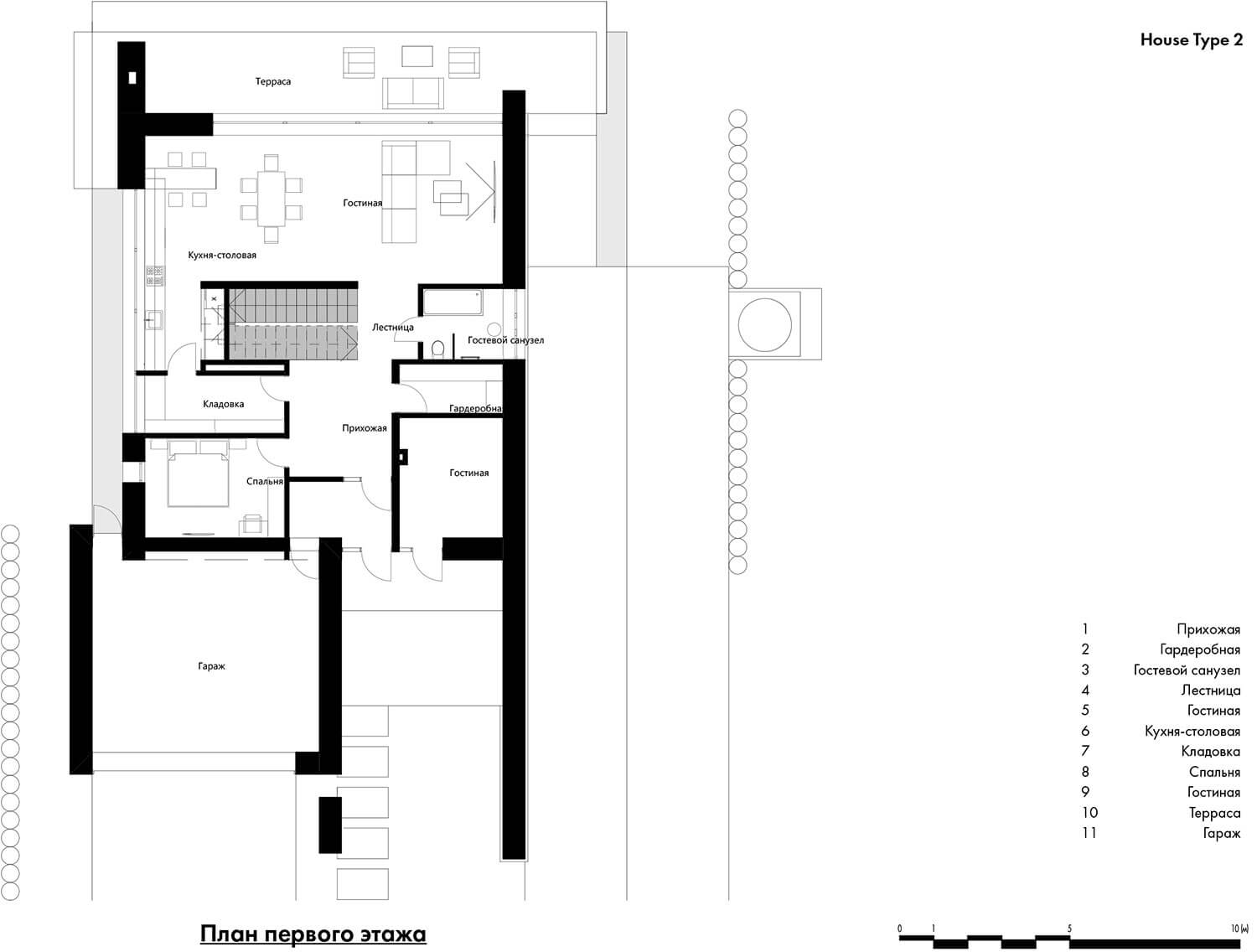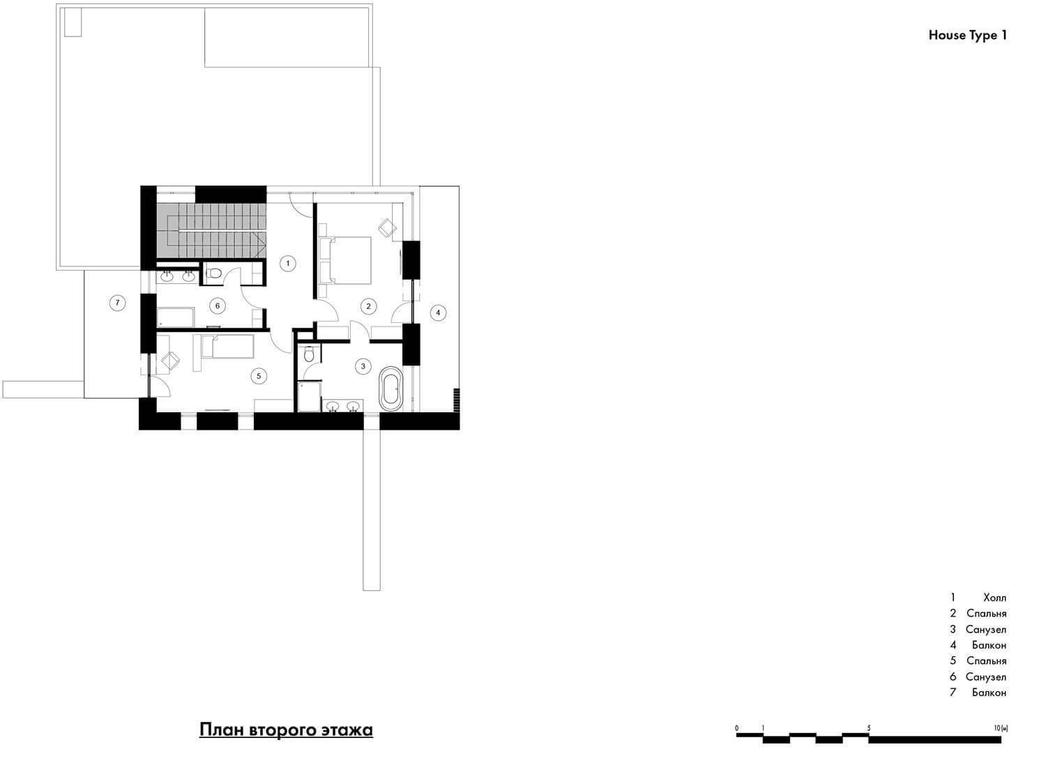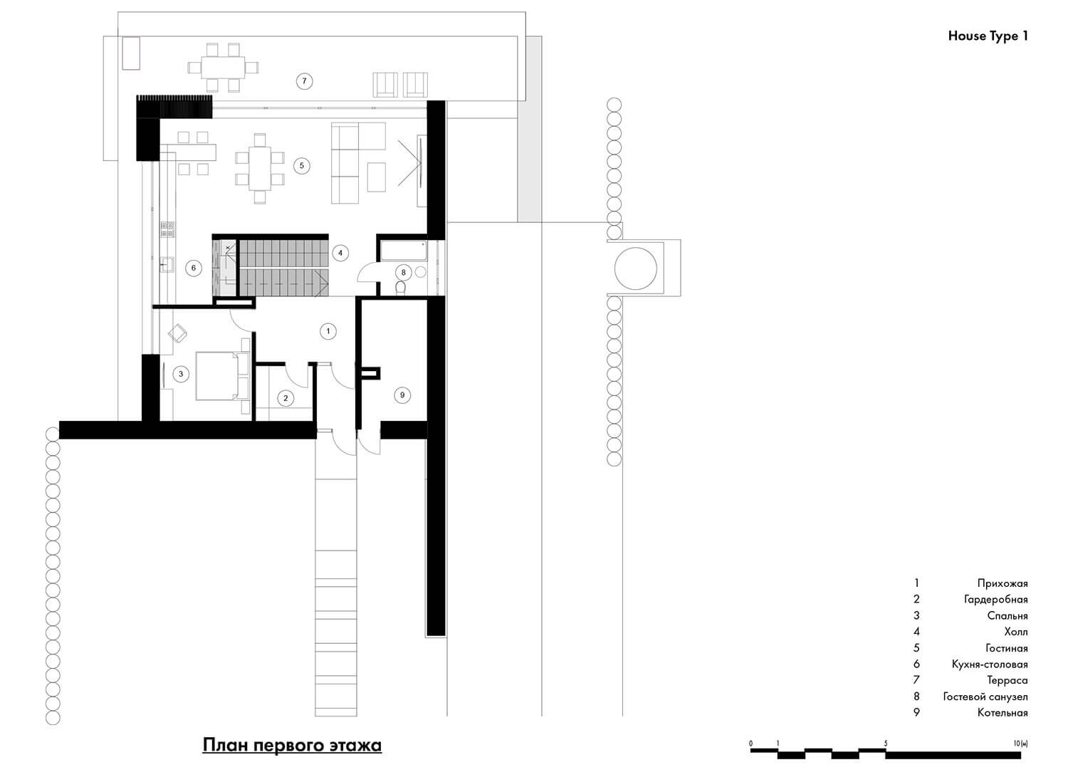 • Общая площадь дома типа 1 — 176,4 кв.м (102,9 кв.м — площадь 1-го этажа, 73,5 кв.м — площадь 2-го этажа).
