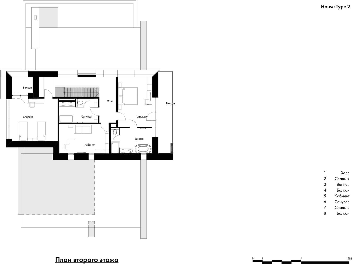 • Общая площадь дома типа 2 — 264,9 кв.м (157,8 кв.м — площадь 1-го этажа, 107,1 кв.м — площадь 2-го этажа).