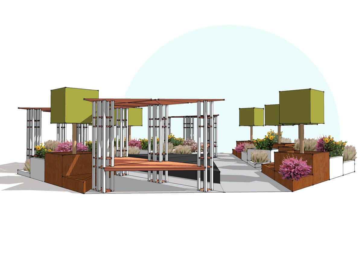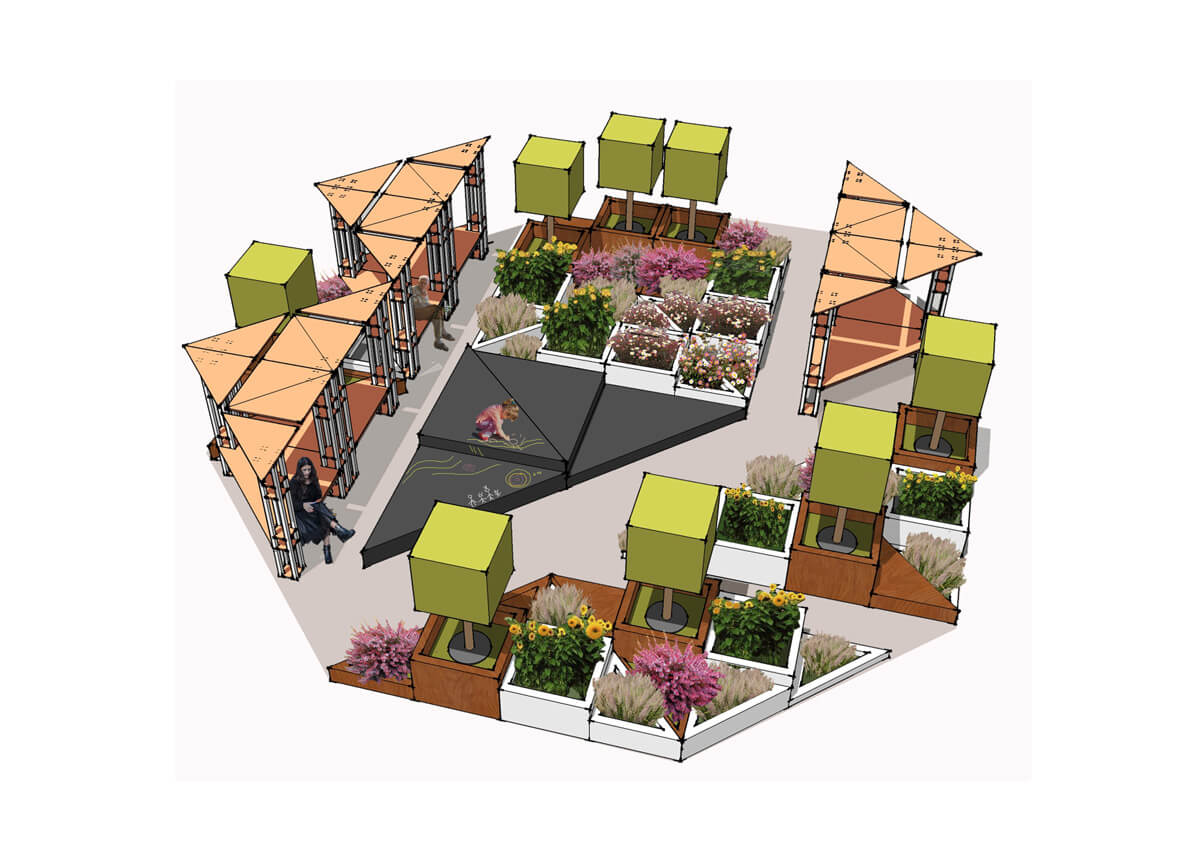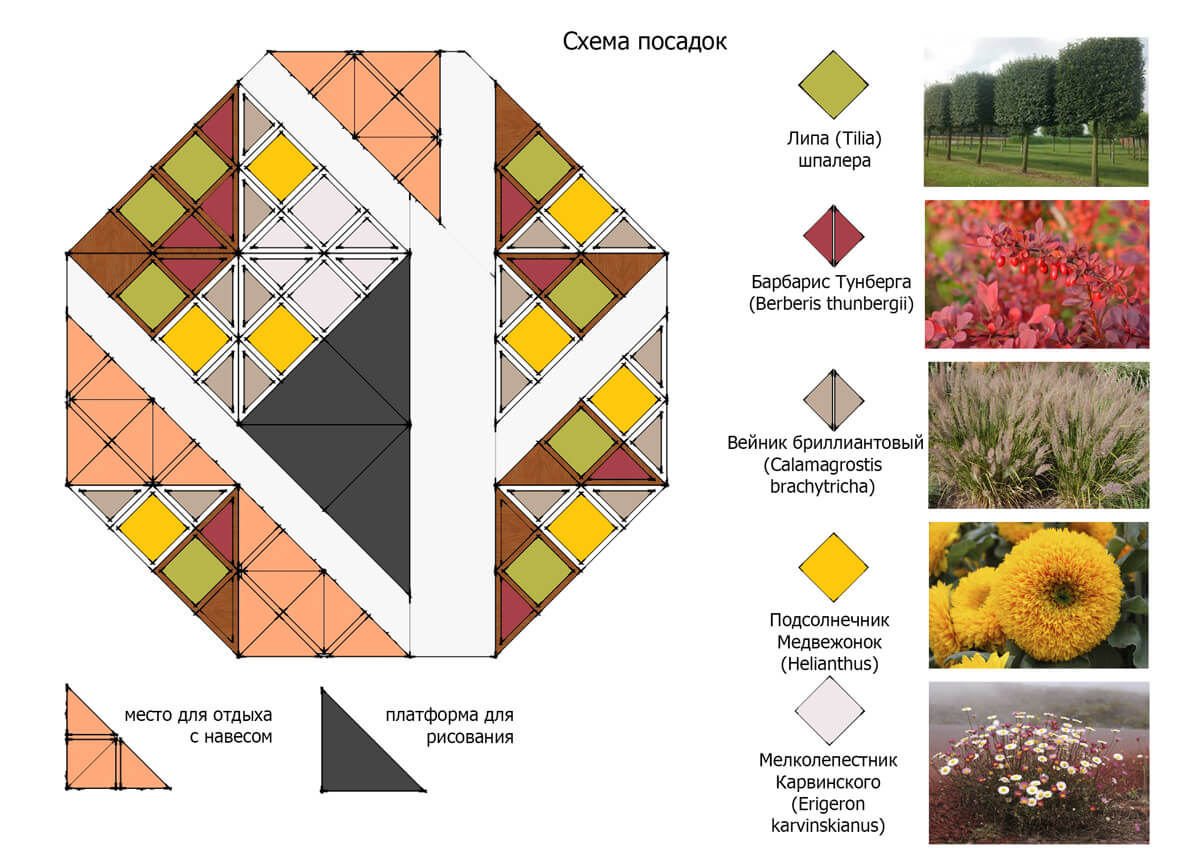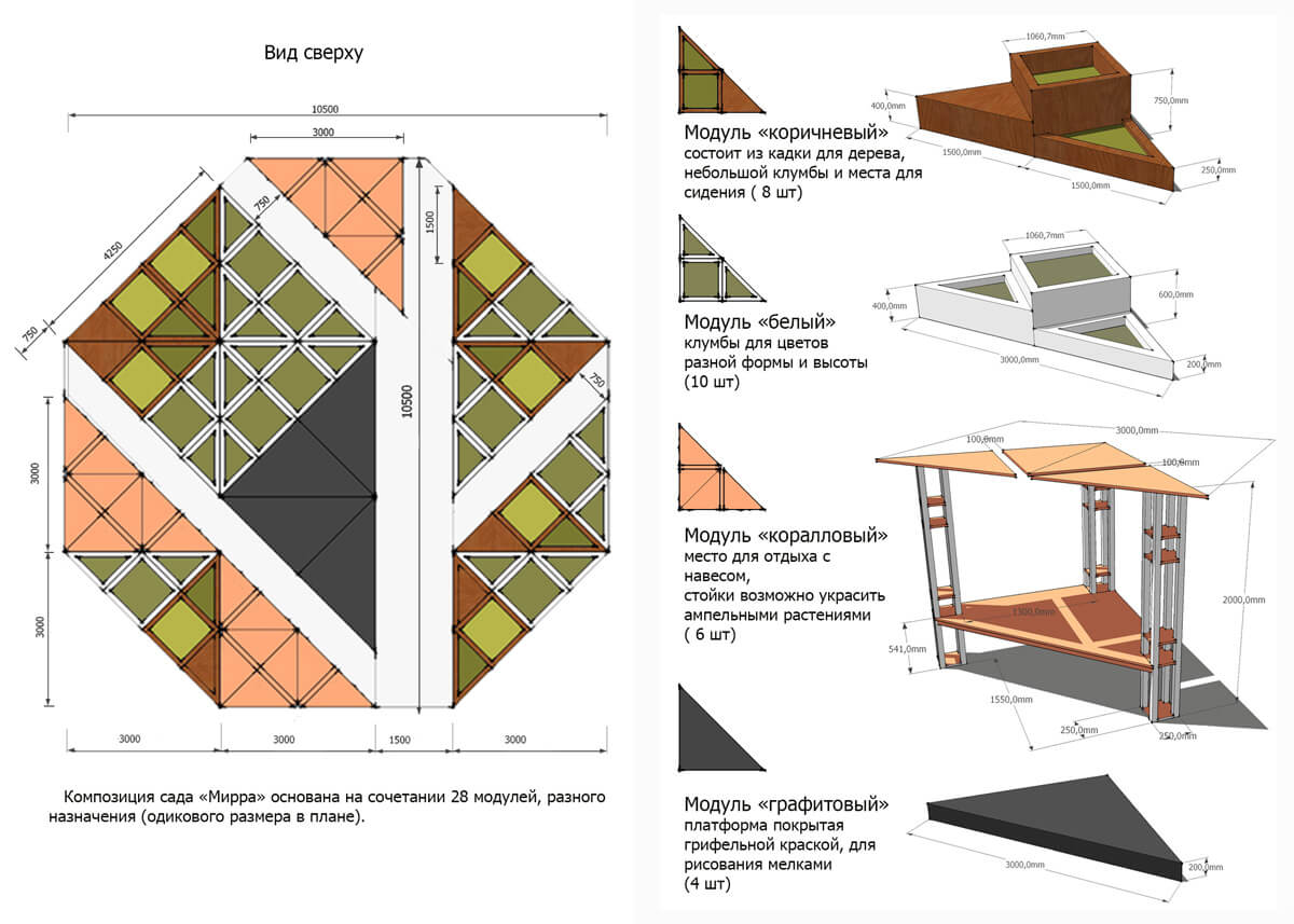 Функциональные модули в плане — прямоугольные треугольники с длиной сторон 3 м, разные по высоте. «Коричневый» модуль (8 шт.) — квадратная в кадка для дерева, по бокам которой треугольные призмы— клумба и место для отдыха. «Белый» модуль (10 шт.) — три клумбы (квадрат с двумя треугольниками по бокам) разной высоты (от 0,2 до 0,6 м). «Коралловый» модуль (6 шт.) представляет собой беседку, выполненную из деревянного каркаса, стойки (белого цвета) — три пучка бруса 50 х 50, навес из фанеры (три треугольных сегмента с зазором для создания ажурной тени) и сидение кораллового цвета. «Графитный» модуль — это платформа в виде треугольной призмы, покрытая грифельной краской, является зоной творчества.