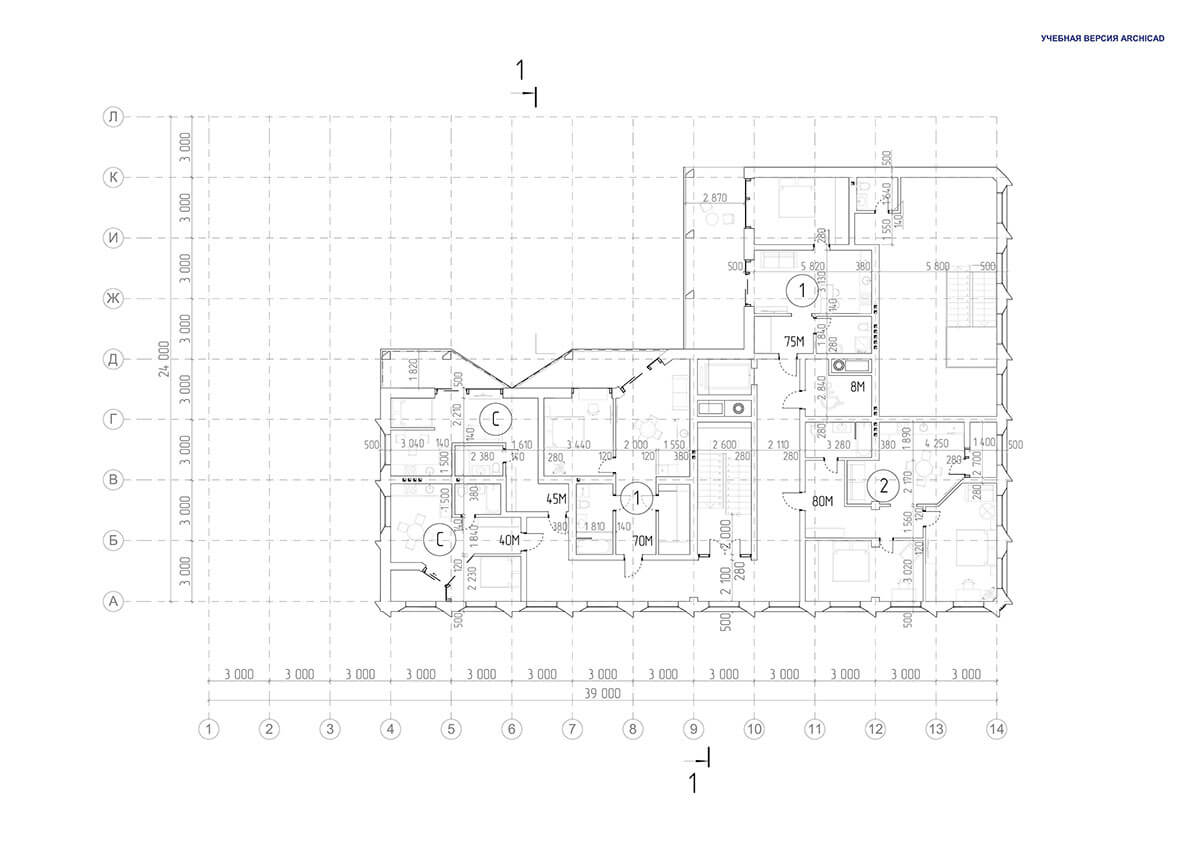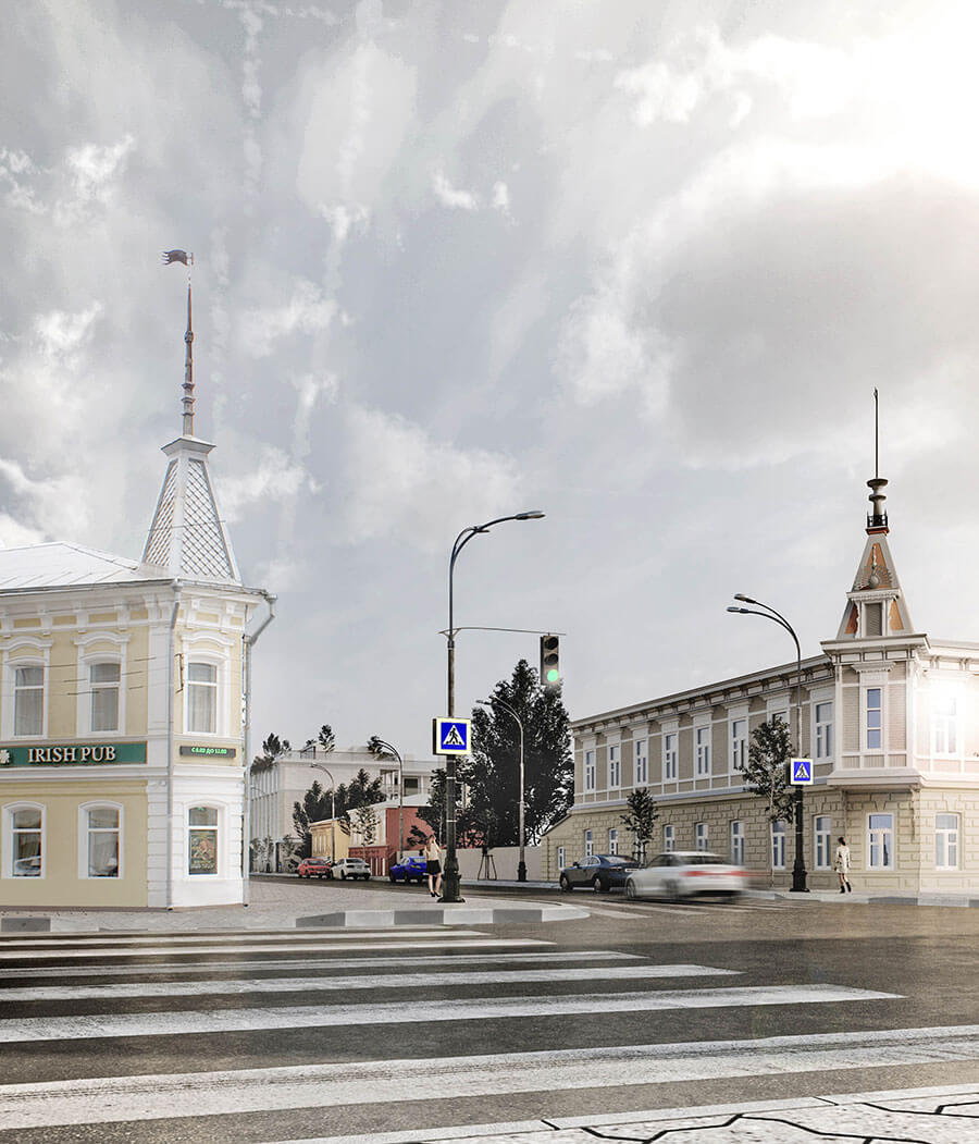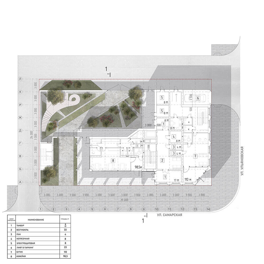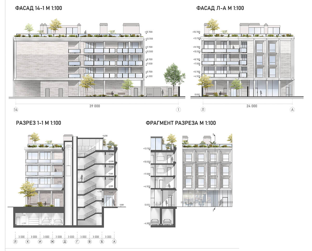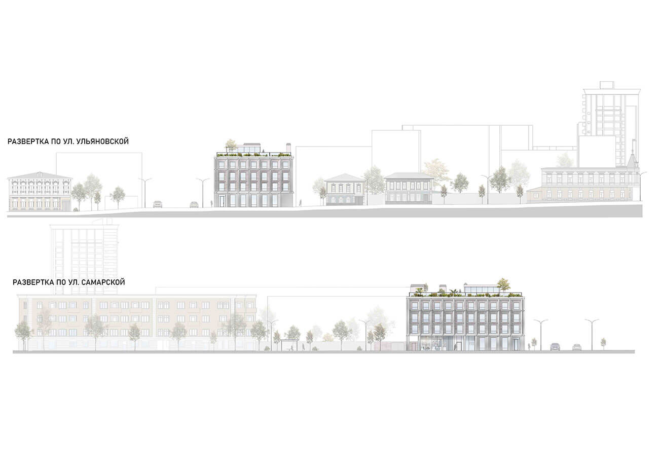 Многоквартирный жилой дом расположен в исторической части города Самары. Окружающая застройка представлена дореволюционными домами, включая объекты культурного наследия, зданиями в стиле сталинского ампира и постсоветскими ЖК. Целью проекта является поиск гармоничной формы здания в исторической среде. Выбор был сделан в пользу углового четырехэтажного корпуса, размещенного по красным линиям с регулярной композиционной решеткой фасадов. На первом этаже размещаются кофейня и бутик. Следующие три этажа жилые. На всей территории участка предусмотрен подземный паркинг. Жилые комнаты выходят в тихий зеленый двор. Это дает возможность жильцам дома иметь закрытое от посторонних пространство.