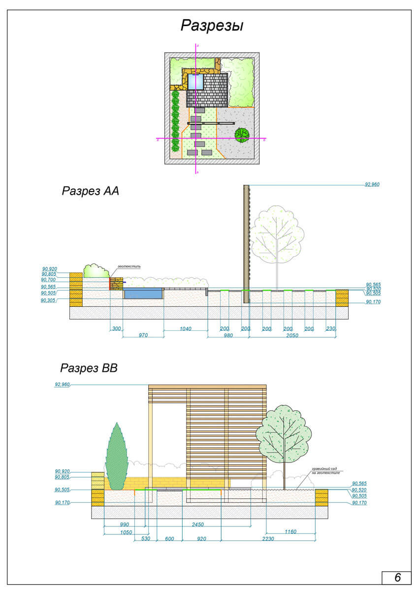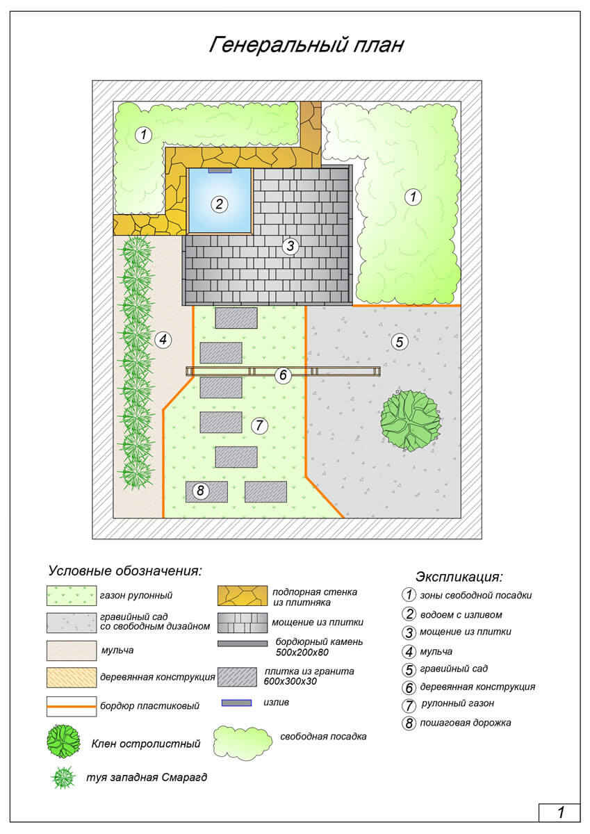 Мини-сад включает в себя следующие элементы: два вида мощения из бетонной плитки, гравийный сад, подпорную стенку из натурального камня, водоем с водопадом, деревянную конструкцию. В части озеленения можно отметить разнообразие типов насаждений – солитер, рядовую и групповые посадки, устройство рулонного газона. Рядовая посадка туи западной «Смарагд» декорирована мульчей.