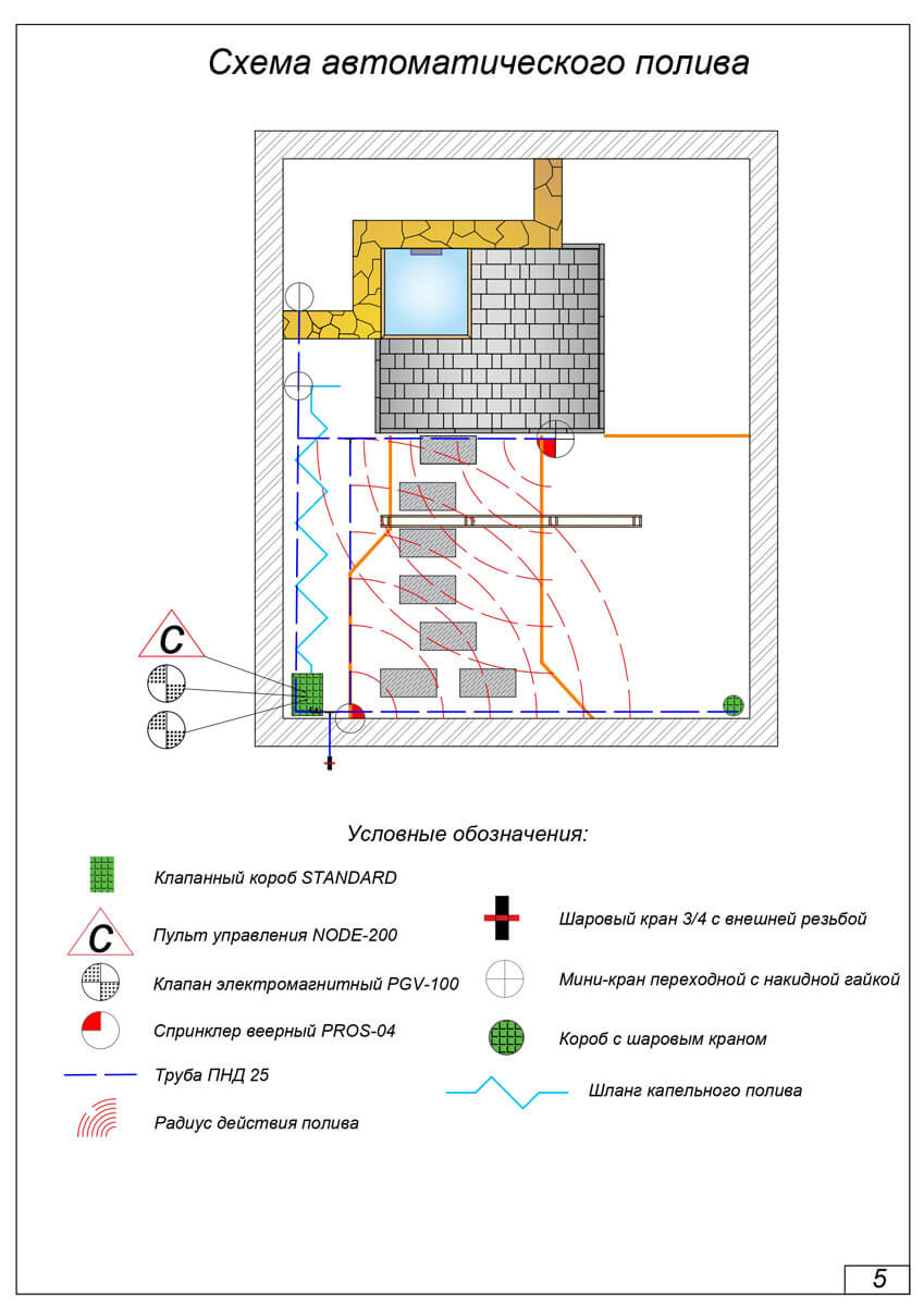 Система автоматического полива включает в себя капельный полив, полив с помощью гидророзетки, а также веерный с помощью сплинкеров. Все виды полива можно запрограммировать (выставить тайминг автозапуска в приложении).