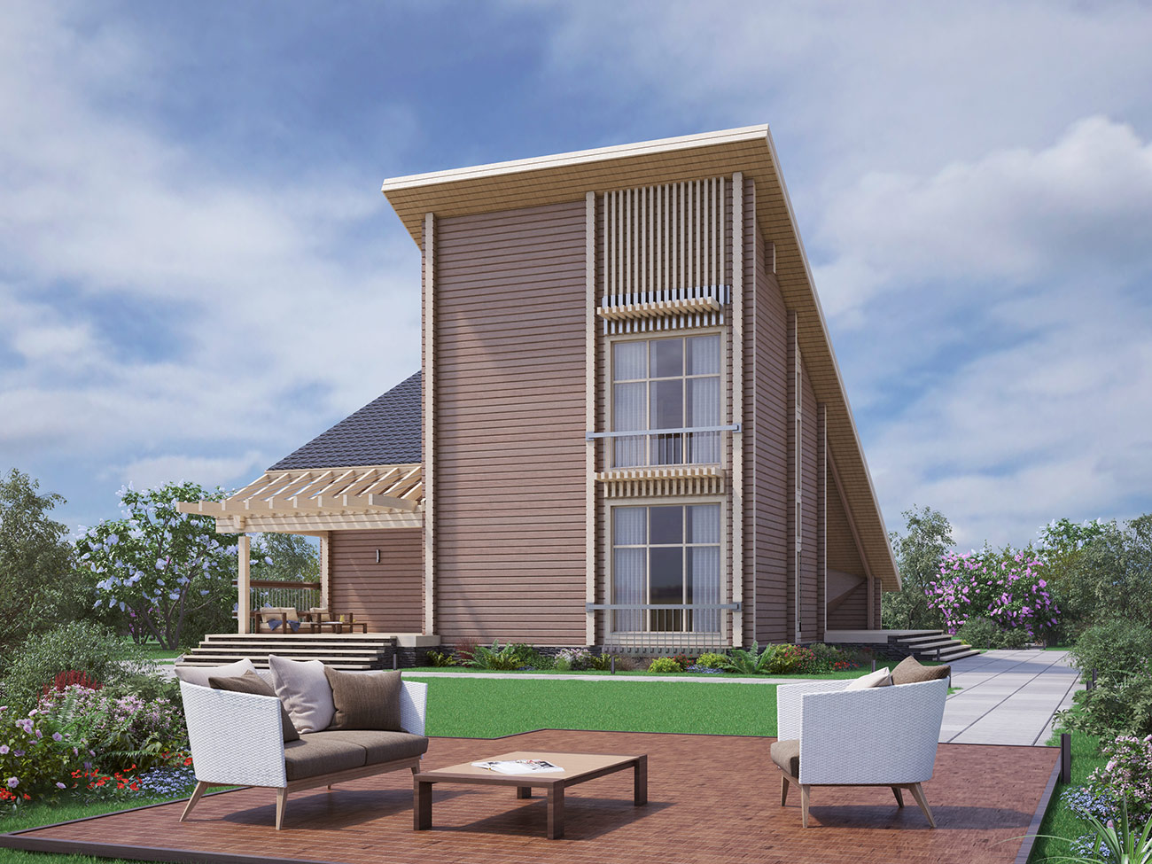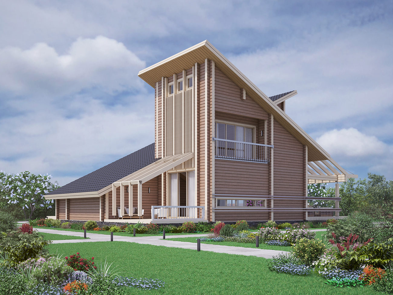 Креативный проект дома из клееного бруса в стиле модерн разработан для индивидуального заказчика для постоянного проживания с учетом существующего ландшафта и пожелания клиента.