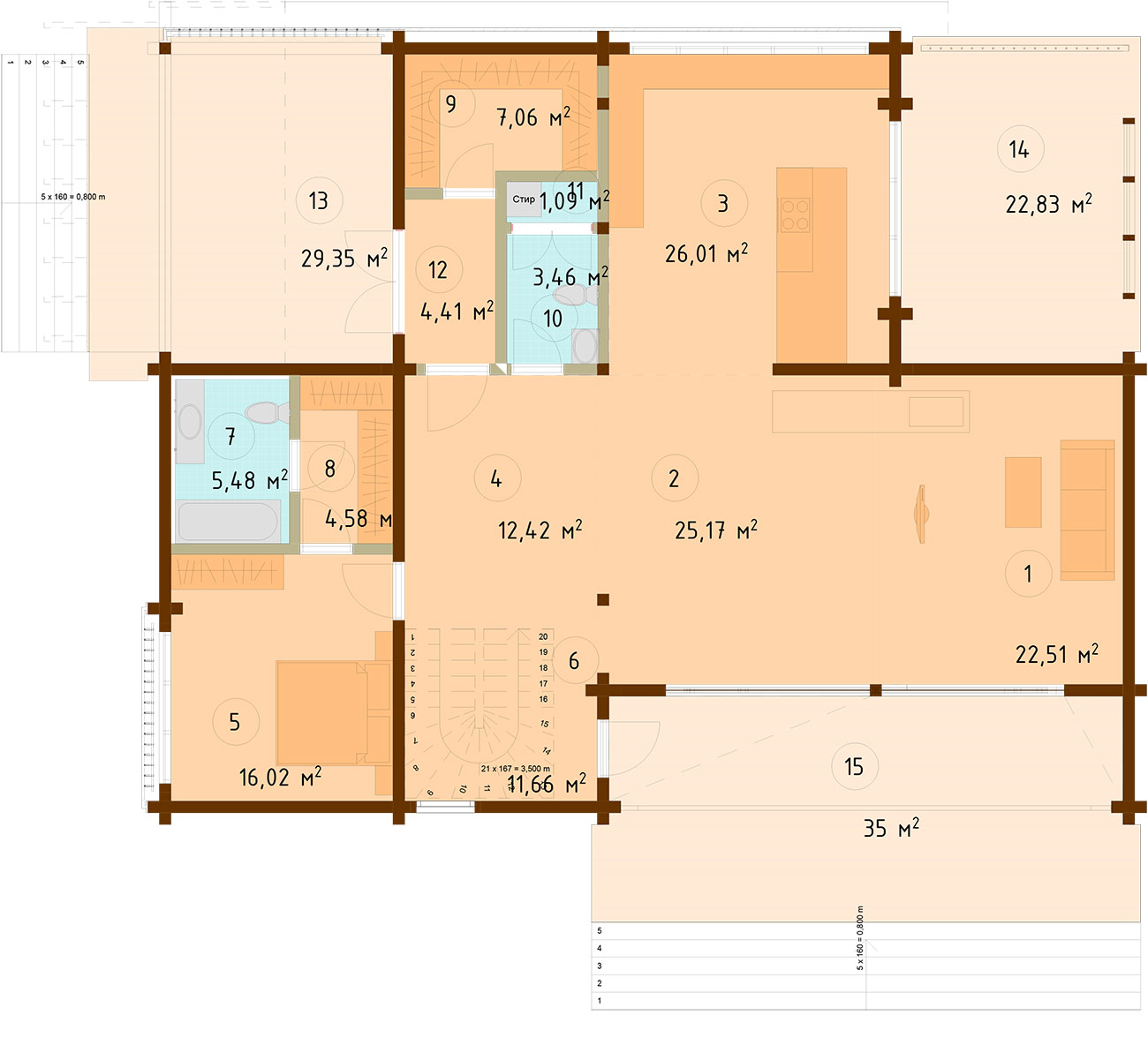 Стены — клееный брус 180х200 мм.