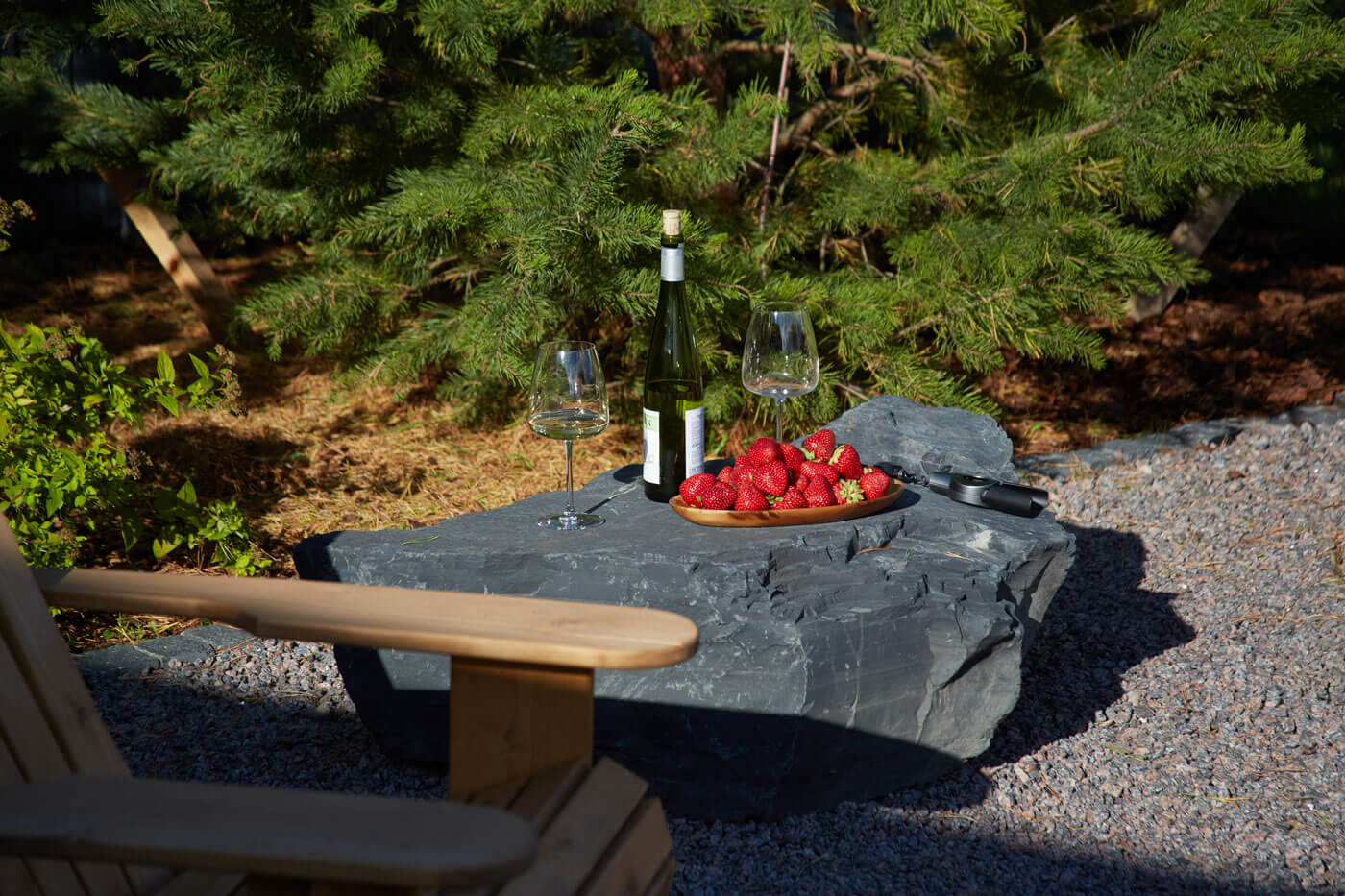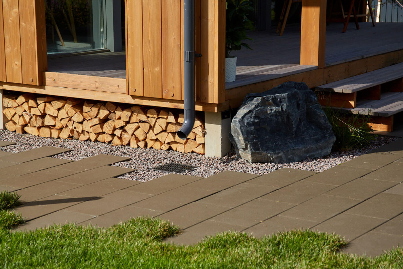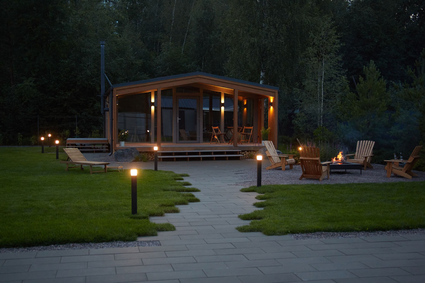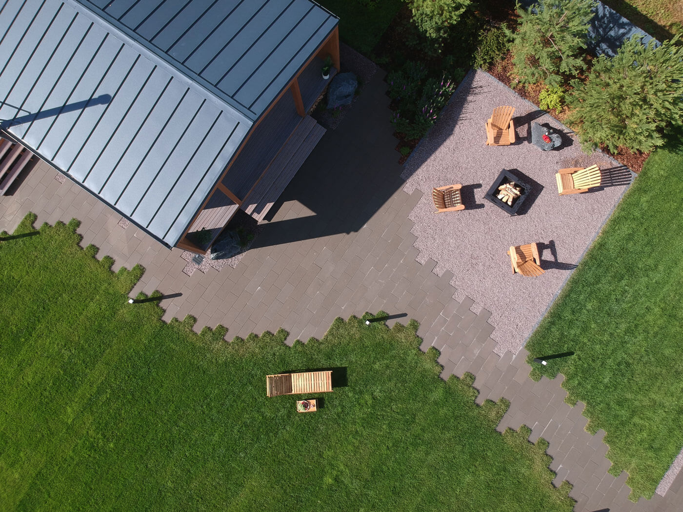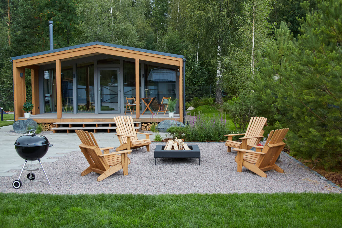 Кроме основных модулей разработали индивидуальный для этого участка – задний двор. Он представляет из себя небольшую площадку, обнесенную декоративными валунами, эта площадка соединила лес с участком и стала местом тихого отдыха.