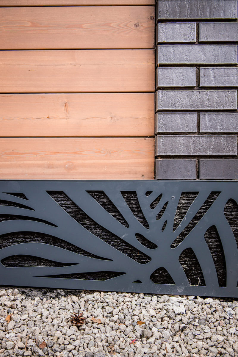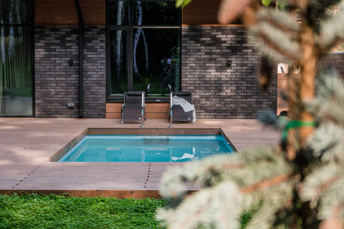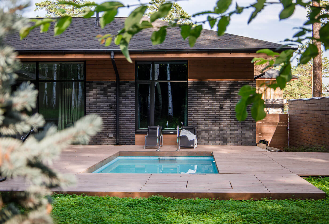 Внутри участка за счет угловой архитектуры дома возникает замкнутое пространство – большая терраса для званых ужинов. Цвет террасы из термодоски полностью совпадает с покраской планкена на фасаде дома, что делает картину целостной, сливая благоустройство и архитектуру. Это очень созвучно концепции органической архитектуры Фрэнка Ллойда Райта.