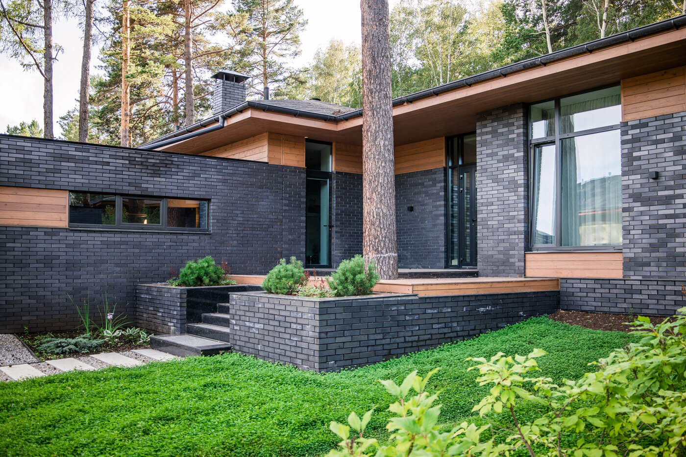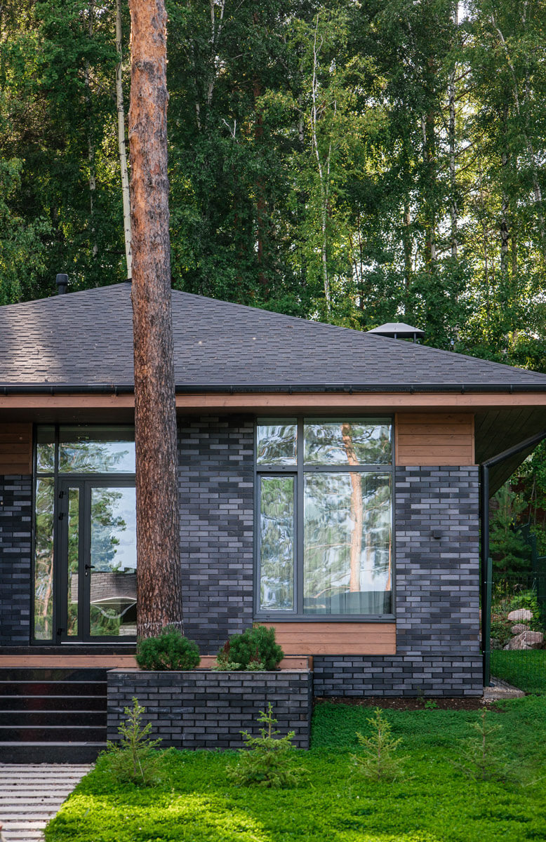 В данном проекте используется уникальная технология мягкой отмостки для защиты фундамента от талых и дождевых вод. Трубы ливневой канализации спрятаны под отмосткой, визуально скрывая всю ливневую систему. Такая технология позволяет бюджетно и эффективно выполнить защиту фундамента и не перегружать общий дизайн участка деталями.