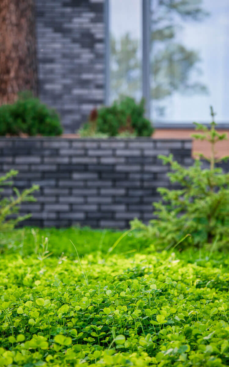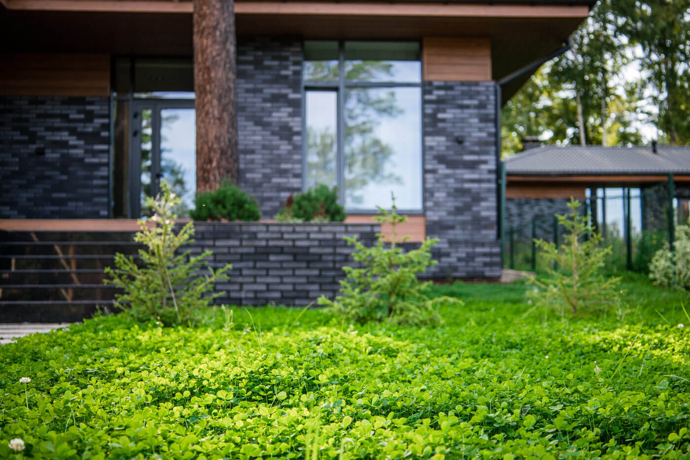 Газон на участке из микроклевера – это плотный зеленый покров, не требующий ухода, мягкие нежные листики равномерно покрывают все поверхности без сорняков и проплешин. В лесной зоне дополнительно высадили рябины, сакуру, черемухи, создающие своим цветением эмоции в разные сезоны года. Акцентом служит– рябина. С весны до осени она нарядна. Каждый день ягоды на ней становятся все ярче и оранжевее. Перепад рельефа оформлен скальным утесом, имитирующим сход горной породы.