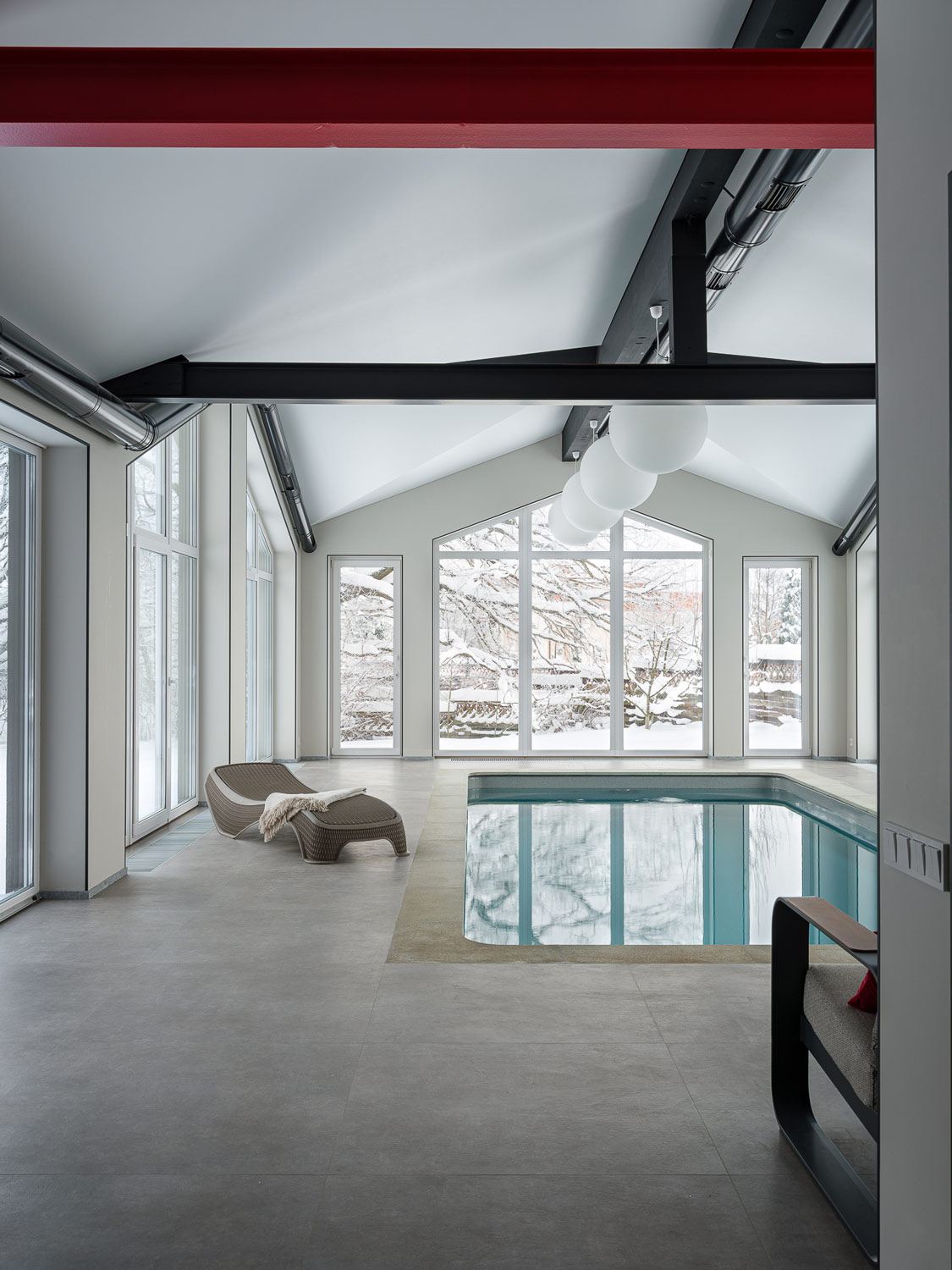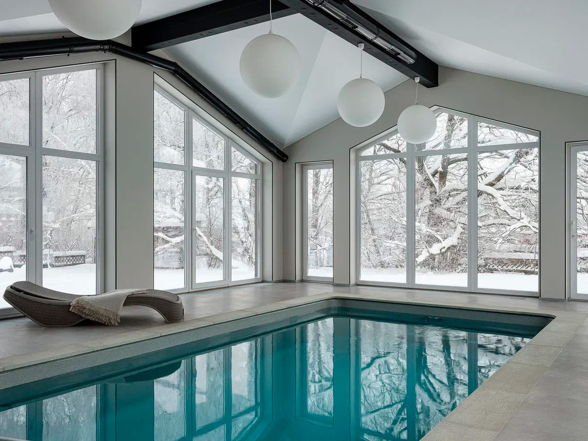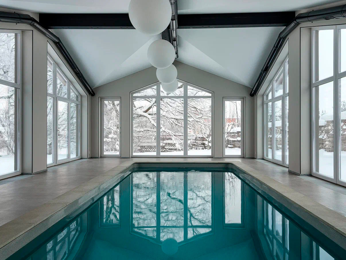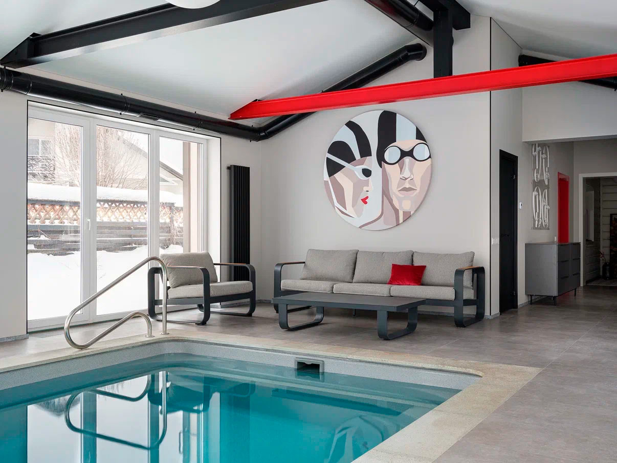 Вдохновением послужил конструктивистский стиль, чья суть заключается в приоритете функции, когда каждый элемент строго выполняет свою задачу, минимуме декора, геометризме и открытых цветах. В переходе от основного дома к бассейну была организована территория мини-сауны с комнатой отдыха и печью. В связке с домом и бассейном собрали эклектичный интерьер с элементами избы в русском стиле, но в той же минималистичной гамме, в которой исполнен интерьер бассейна.