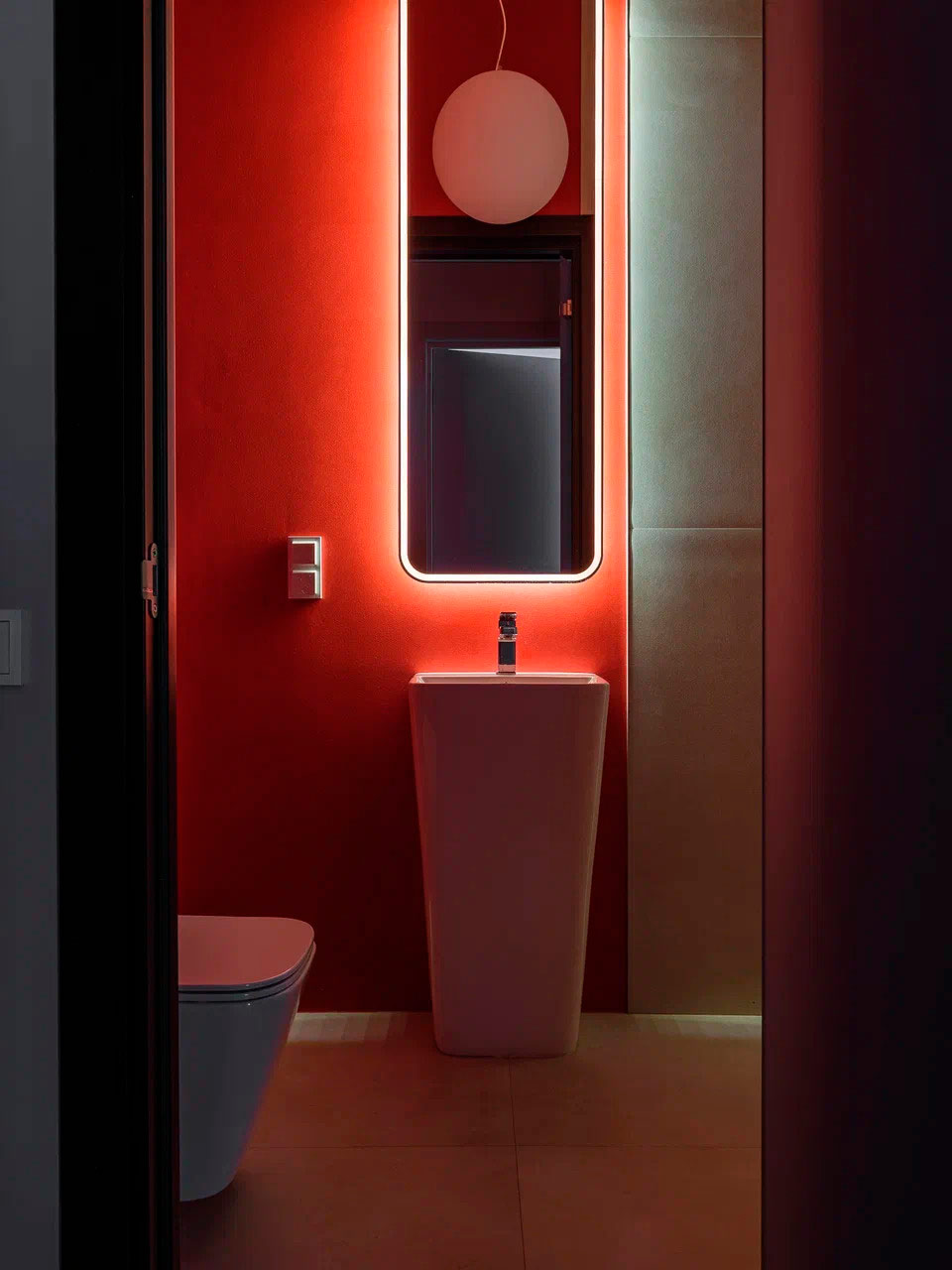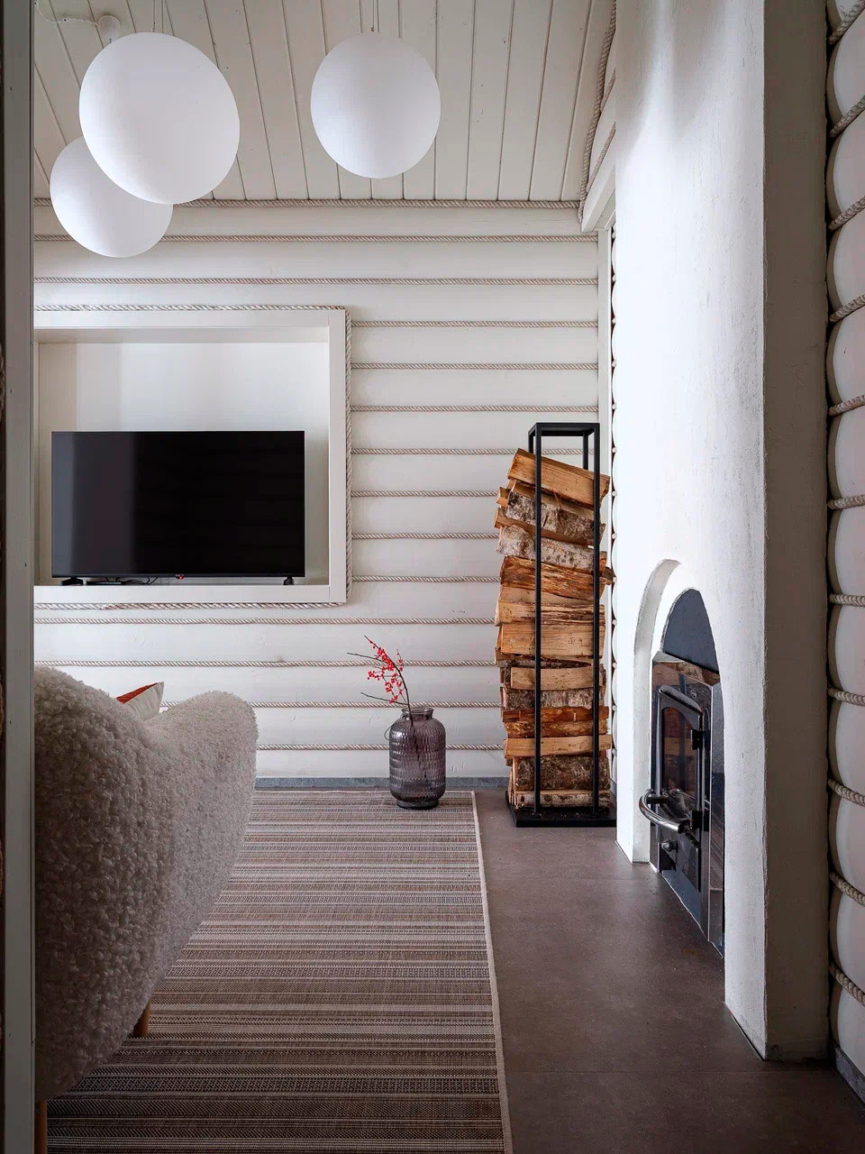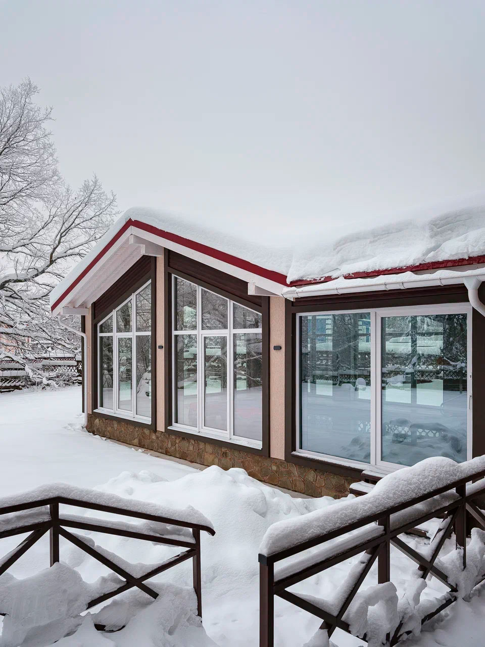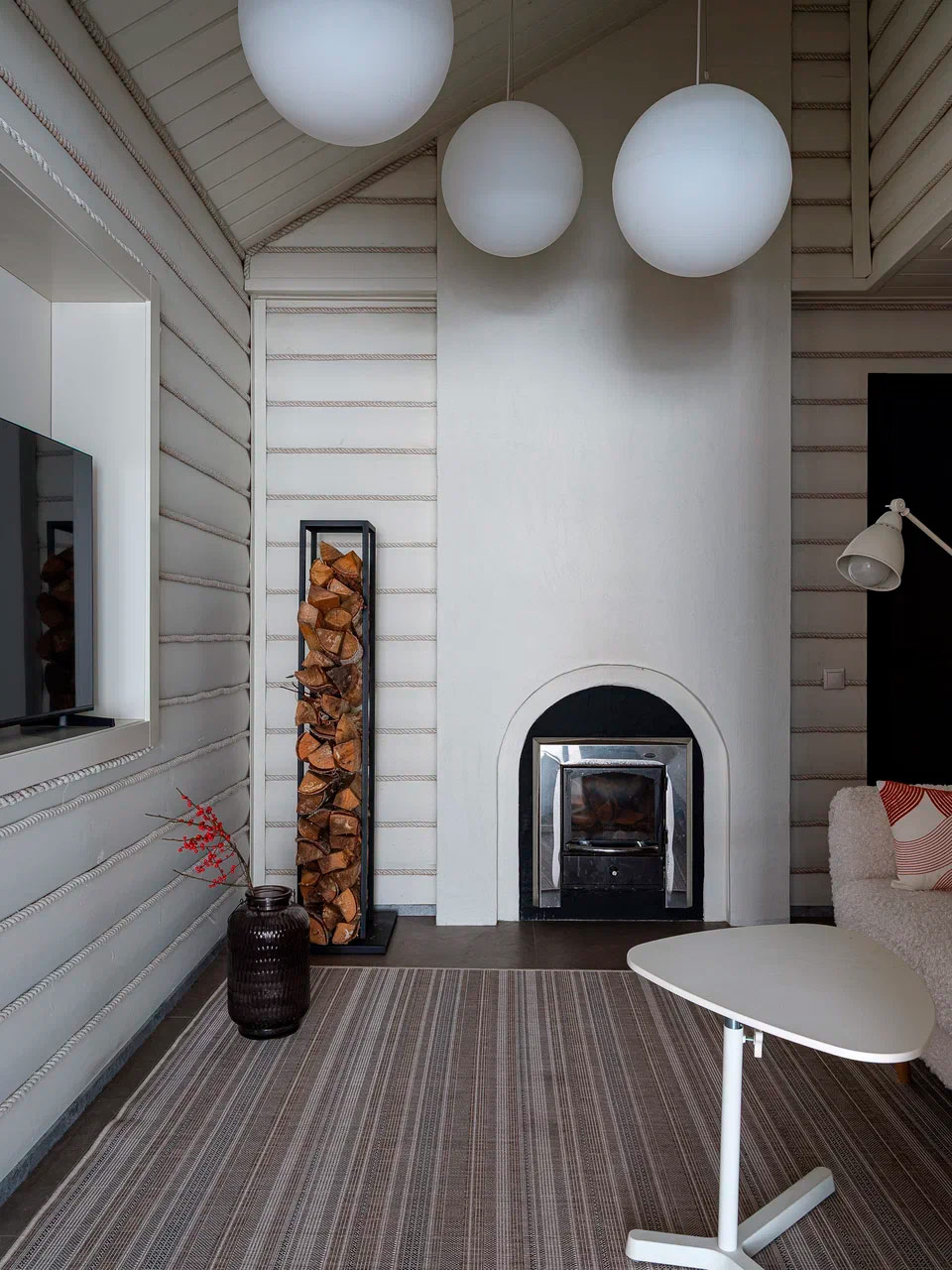 Вдохновением послужил конструктивистский стиль, чья суть заключается в приоритете функции, когда каждый элемент строго выполняет свою задачу, минимуме декора, геометризме и открытых цветах. В переходе от основного дома к бассейну была организована территория мини-сауны с комнатой отдыха и печью. В связке с домом и бассейном собрали эклектичный интерьер с элементами избы в русском стиле, но в той же минималистичной гамме, в которой исполнен интерьер бассейна.